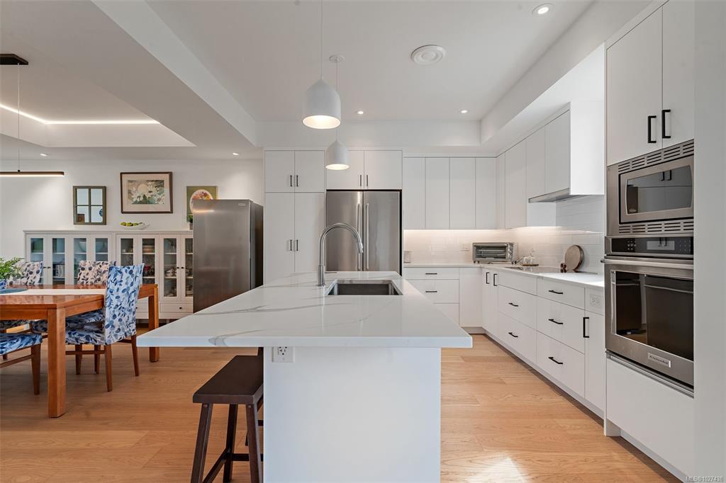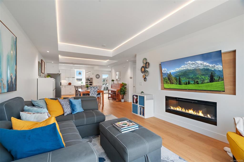No GST! This 3/4 bed, 4 bath home offers over 2,000 sf of thoughtfully designed living space, including a media room and full bathroom on the lower level—ideal for a guest suite, gym, or theatre. The open-concept main floor features engineered oak hardwood, tray ceilings, and a gas fireplace with a TV feature wall. The gourmet kitchen boasts quartz countertops, premium appliances, an induction cooktop, wall oven, and an island with seating—plus a built-in desk for a convenient workspace. Upstairs are three spacious bedrooms, including a primary suite with a spa-like ensuite offering double sinks, a rain shower, and heated tile floors. Additional highlights include an energy-efficient heat pump, on-demand hot water, EV-ready garage, fenced yard, and gas BBQ hookup. Located in a low-density, pet-friendly community with a playground, gardens, and direct access to trails in a quiet, park-like setting.