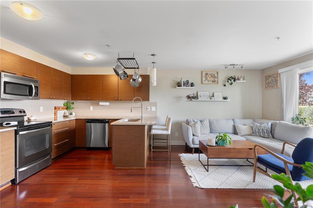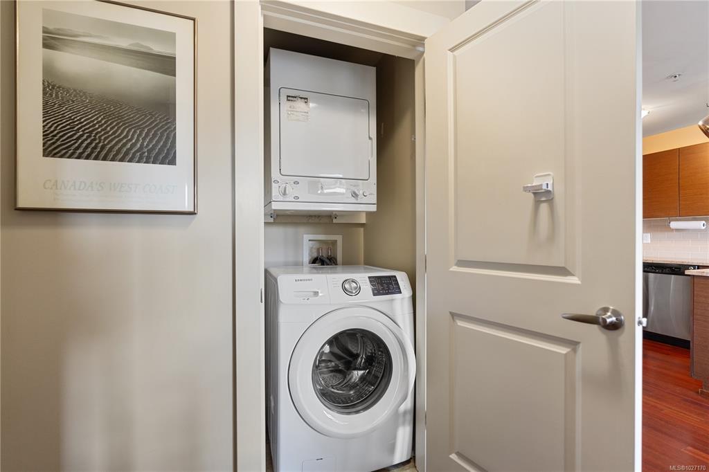 Welcome to the Ovation - an exceptional opportunity in today’s condo market! Meticulously maintained and truly move-in ready, this bright, modern unit offers effortless living. The open-concept space is filled with natural light and features engineered hardwood floors, quartz countertops, stainless steel appliances, in-suite laundry, and a serene patio. The functional layout has two generous bedrooms, including a primary with full ensuite. Residents can enjoy a fully stocked gym and bike storage. This professionally managed building also offers secure underground parking and a storage locker. Rentals and pets allowed (no size restrictions), making it an excellent option for homeowners or investors. Just steps from Saxe Point Park, the Esquimalt Recreation Centre, local shops and cafés, and Red Barn Market across the street. With downtown Victoria and CFB Esquimalt minutes away, this is West Coast living at exceptional value.
