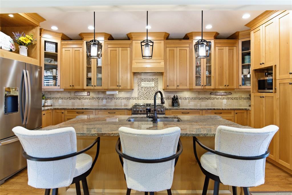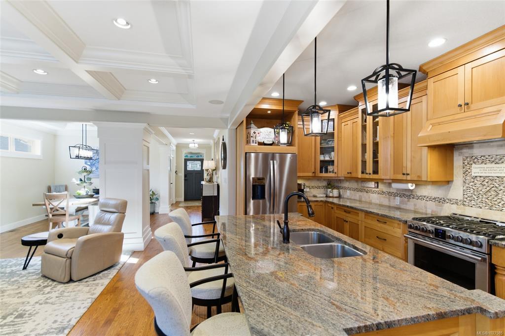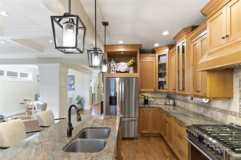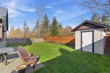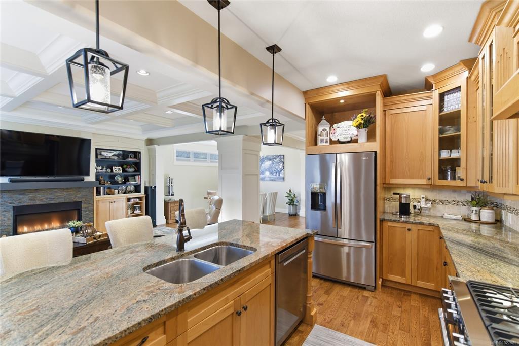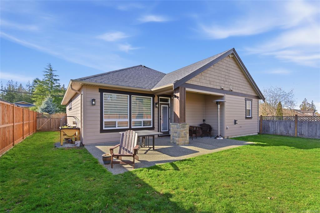 Exceptional custom-built rancher offering quality craftsmanship and thoughtful design throughout. This 3 bedroom + den home features an open concept layout with 9-ft ceilings, solid oak flooring in the main areas, and elegant coffered ceilings in the living and dining rooms. The bright kitchen enjoys morning sun and includes granite countertops, a sit-up island, stainless steel appliances, gas cooktop, and excellent workspace. The living room features a gas fireplace with custom cabinetry, while the den offers an electric fireplace and tray ceiling. The spacious primary bedroom includes a large walk-in closet with custom shelving and a luxurious ensuite with deep tub and separate shower. Heated floors warm the entry, laundry and bathrooms. Outside, enjoy a fully fenced private backyard, oversized driveway with RV/boat parking, new shed on concrete (2025), and double garage with workbench. Just 3 minutes to Morningstar Golf Course and French Creek Marina. Schedule your viewing today!