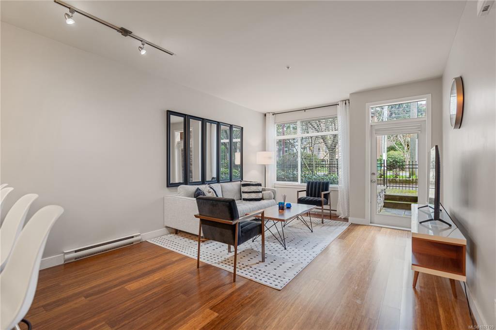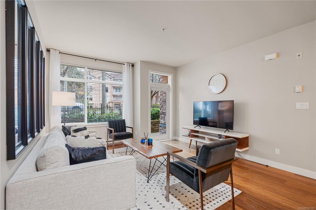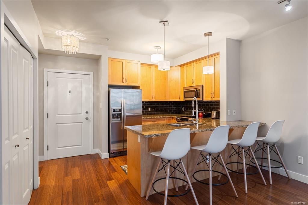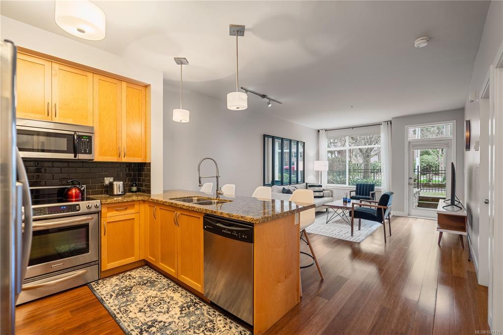 Welcome to Fairway Green! This bright and spacious 1-bedroom, 1-bath condo offers its own convenient private entrance and a functional open-concept layout. Oversized windows fill the living space with natural light, complemented by beautiful flooring throughout the main living areas, creating a warm and modern feel. The thoughtfully designed kitchen features granite countertops, stainless steel appliances, tile backsplash, ample cabinetry, and a convenient eat-at peninsula. The large 12x17 bedroom offers excellent space and comfort, while the bathroom includes a separate shower and deep soaker tub. Enjoy your spacious outdoor patio, perfect for relaxing or summer BBQs. Additional features include in-suite laundry, secure underground parking, storage locker, and bike/kayak storage. Steps from Royal Colwood Golf Club and just minutes to Goldstream Village, parks, cafes, shopping, and everyday amenities.