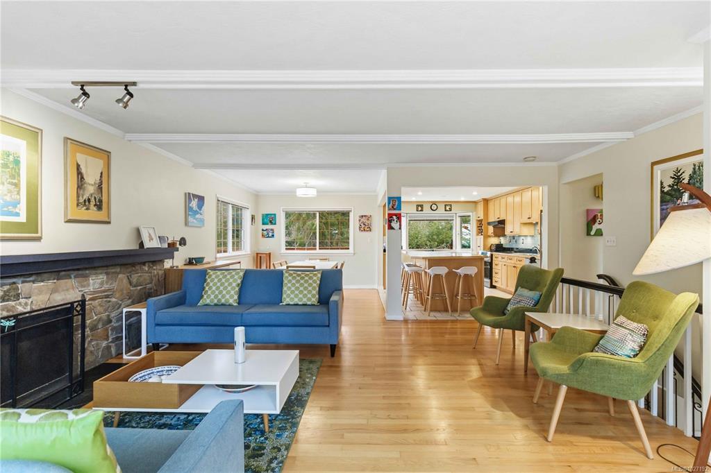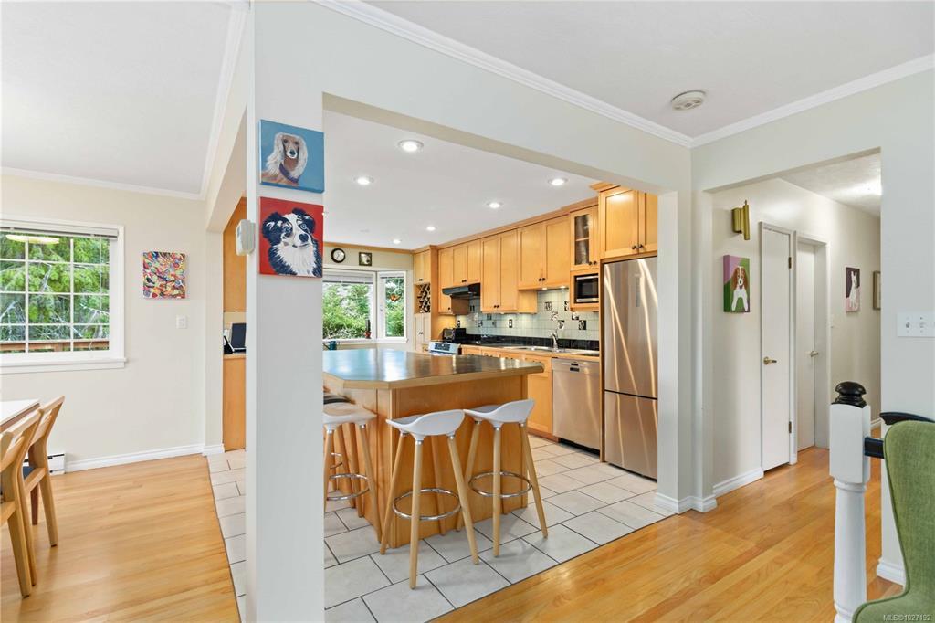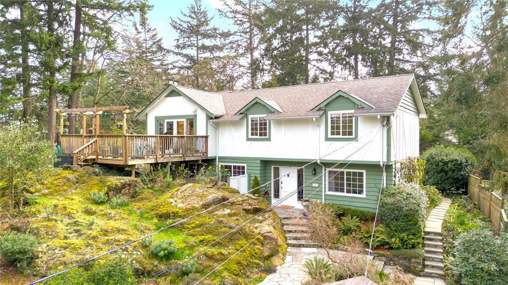 Private Cordova Bay retreat with garden setting and in-law suite. Tucked into a unique Alpine garden setting in sought-after Cordova Bay. This well-cared-for 5-bed, 3-bath residence offers comfortable living and effortless entertaining. The natural light-filled main level features an open kitchen, dining and living area opening to two spacious decks where you can relax or unwind in your private hot tub. The two sun-filled decks invite the perfect blend of morning coffee on one and afternoon cocktails on the other. Three bedrooms up include a generous primary with ensuite. The lower level offers exceptional flexibility with a private 1-bed inlaw suite, plus an additional bed and office/den—ideal for guests, extended family or workspace. The flex room allows for a 2 bed suite. Thoughtful updates include vinyl windows, updated kitchen and baths, and exterior paint. A single garage, abundant storage and lush garden spaces complete this special Cordova Bay property.
