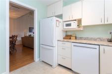 As an end unit, the home benefits from additional windows in the kitchen, entryway, and primary bedroom, bringing in even more natural light and creating a bright, welcoming feel throughout. The interior features vaulted ceilings and bay windows that further enhance the open, airy layout. The two-bedroom, two-bathroom floor plan is both functional and comfortable, with in-unit laundry and ample closet space throughout.
