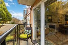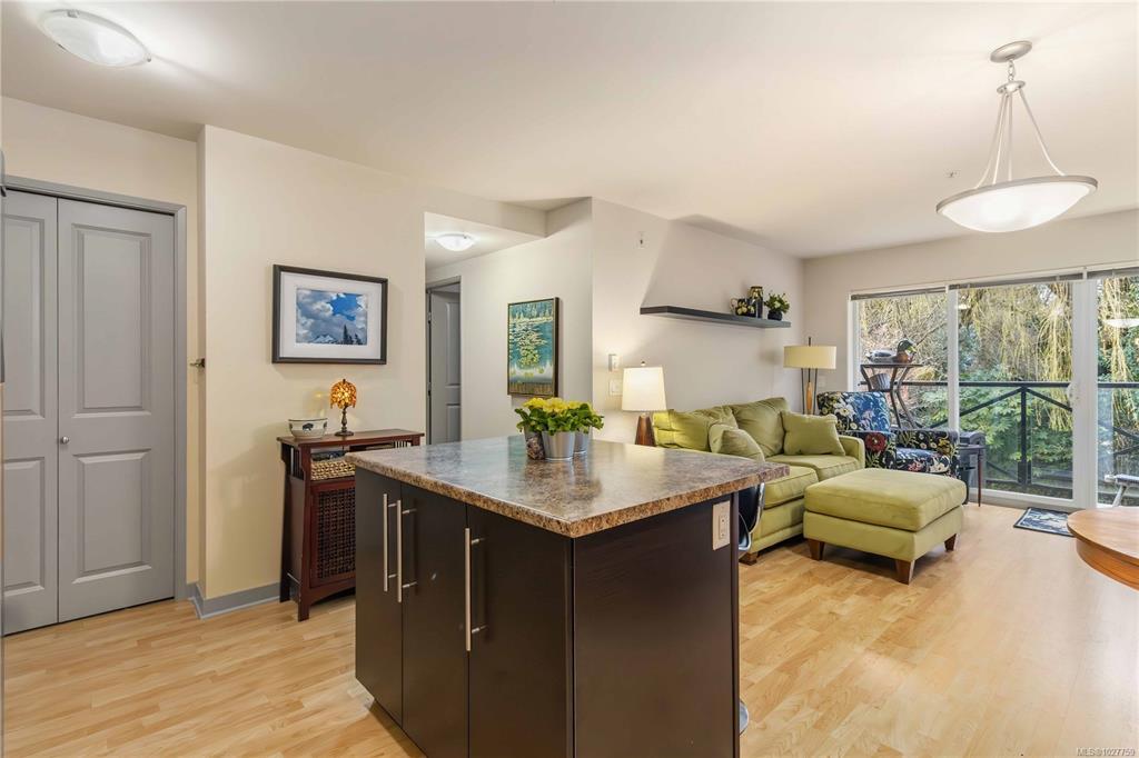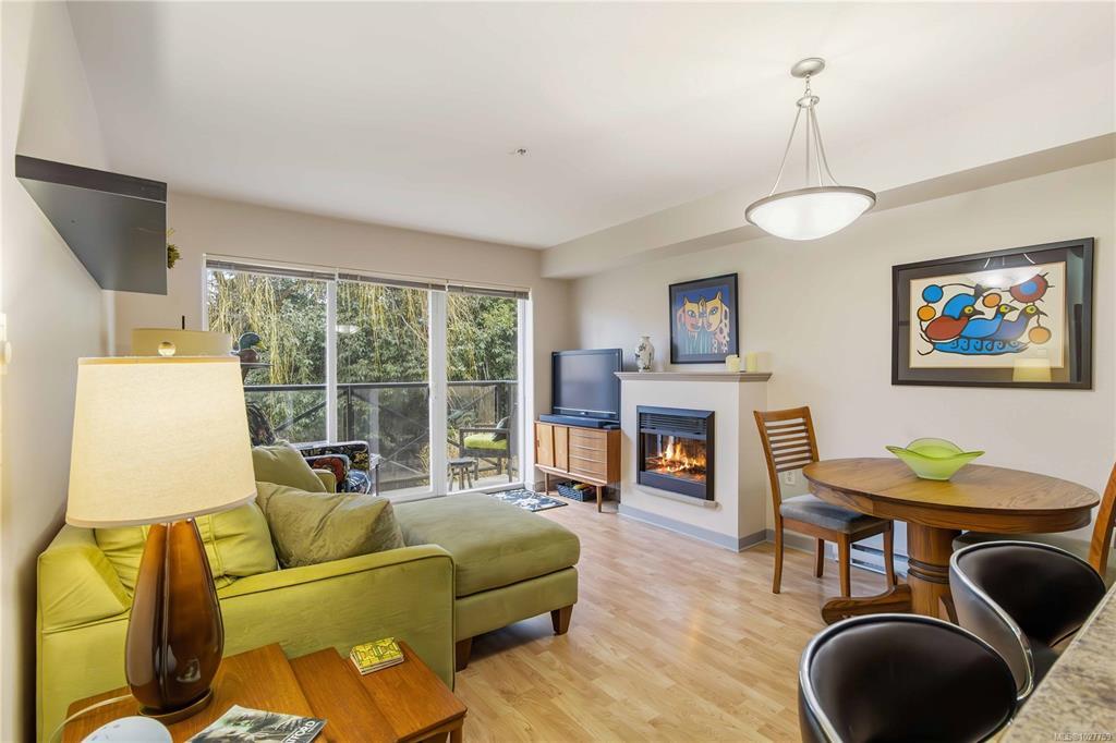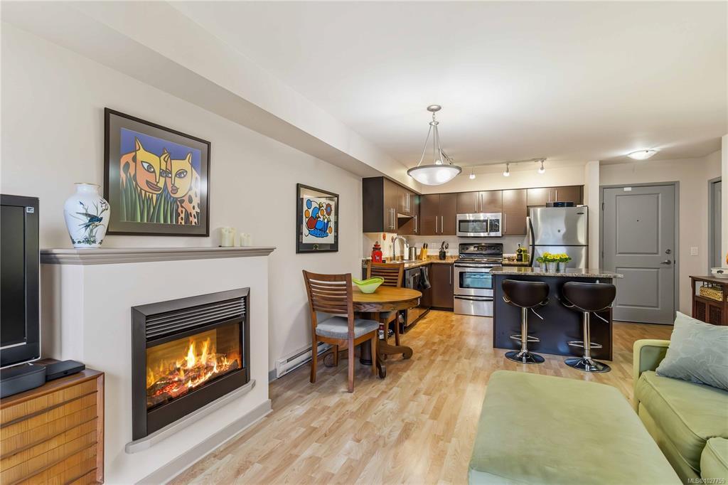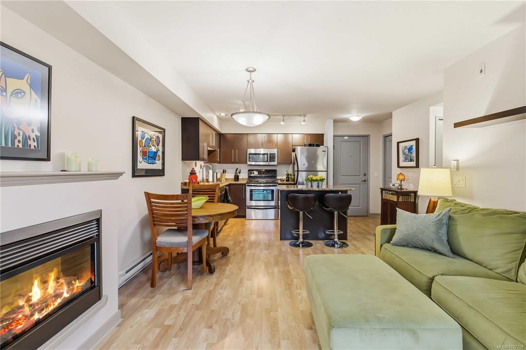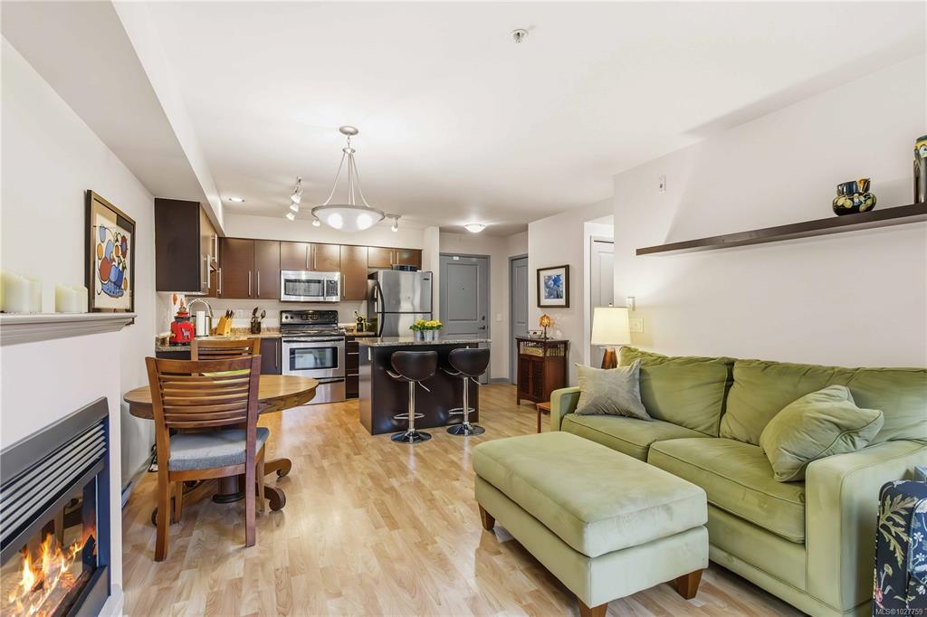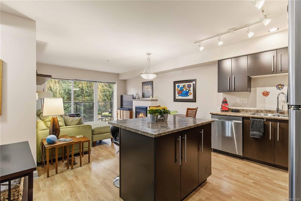 **NEWS FLASH** This building allows large-breed dogs! This bright, north-facing 2 bedroom, 2-bathroom unit offers a lovely treed outlook from the open living room- kitchen layout and across the balcony. The kitchen has ample cupboards and a central island for extra counter space. The living room allows you several furniture placement options, a lovely fireplace and a lot of wall space for your precious artwork. The primary bedroom offers large closet, 3-piece ensuite (with walk-in shower) and good closet space while the second bedroom is large enough for guests, office space or den. The Amara, built in 2007, is professionally managed with no rental restrictions, features modern comforts in an ultra-convenient location near transit, Camosun College, St. Michael’s University, UVIC, Cedar Hill Golf Course, and all major amenities. One secure underground parking, separate storage, no pet size restrictions and ensuite laundry up-level the value. Don’t wait—book your showing today!