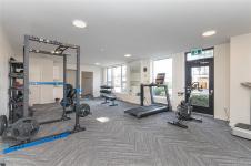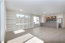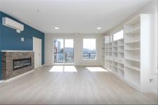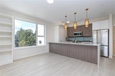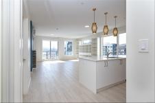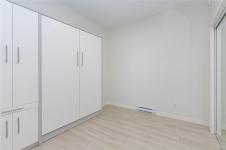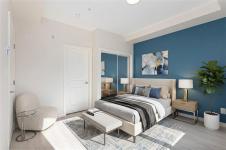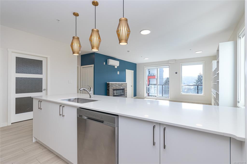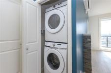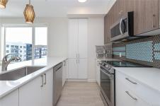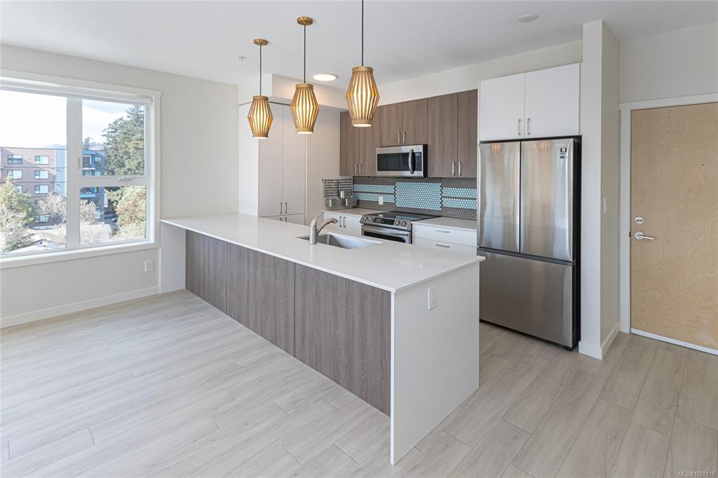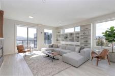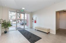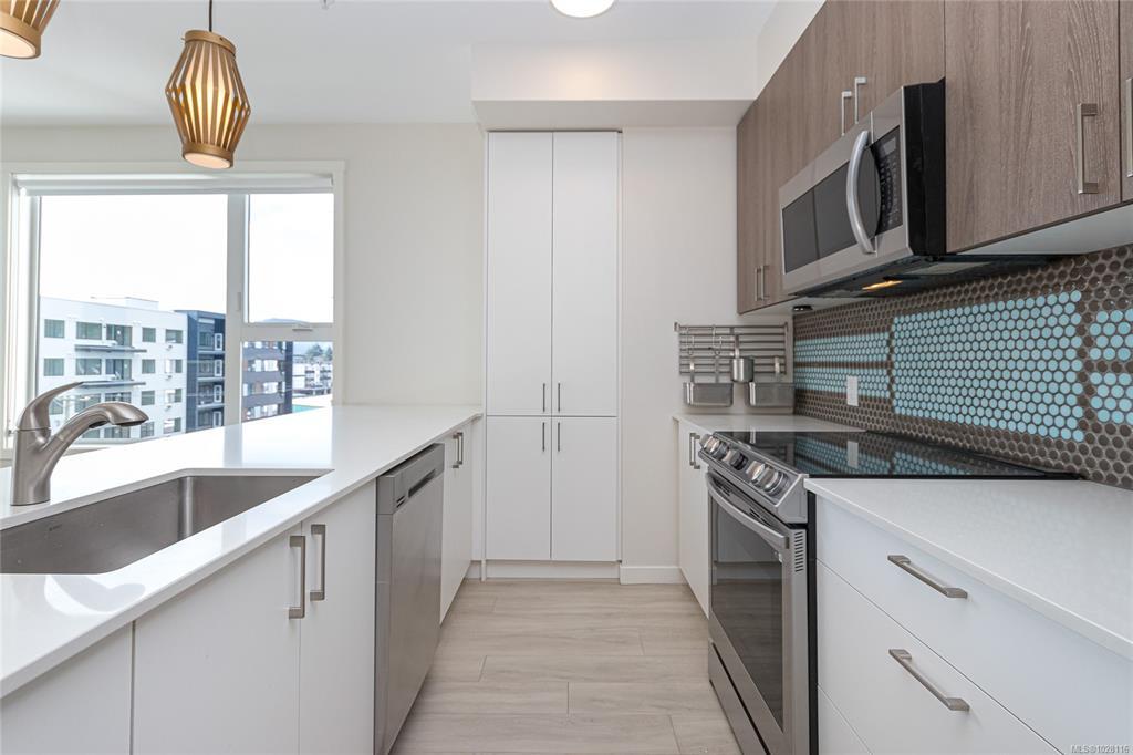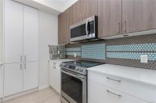 This bright, south-facing CORNER UNIT condo offers 1,026 sq. ft. of thoughtfully designed living space with two bedrooms and two bathrooms. The open-concept main living area features 9-foot ceilings and large windows, filling the home with natural light throughout the day. The kitchen has been upgraded by the current owner with new tile and stylish pendant lighting, and features contemporary two-tone European cabinetry with soft-close drawers and hinges, complemented by quartz countertops. The living room includes custom built-in shelving, while the second bedroom has been enhanced with a space-saving Murphy bed for added flexibility. Residents enjoy excellent building amenities, including a fitness centre, secure bike storage, and a pet-friendly environment with no weight restrictions. The home also includes one secure parking stall with gated entry, fob access, video security, and EV pre-wiring. Rentals are permitted and the home is covered by the remaining 2-5-10 new home warranty.