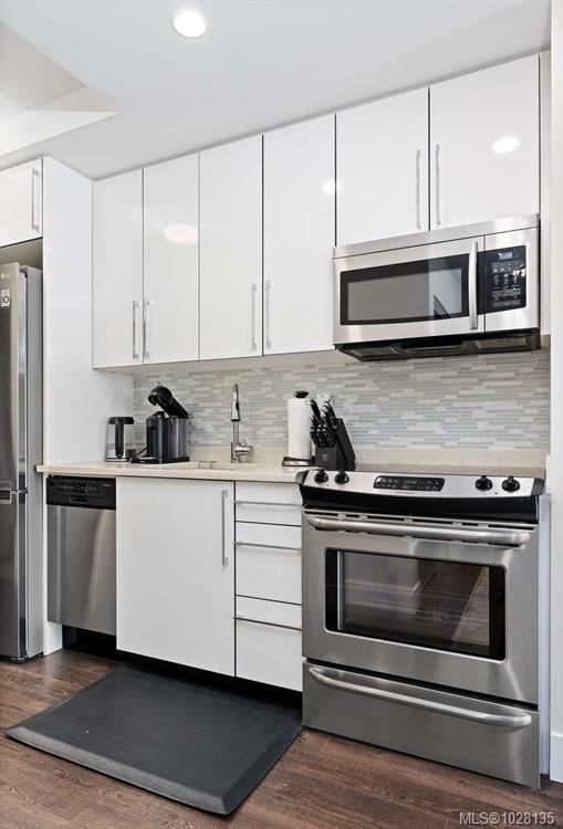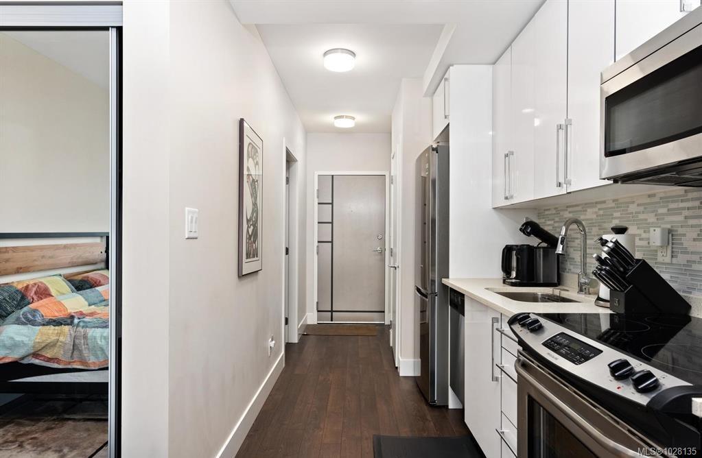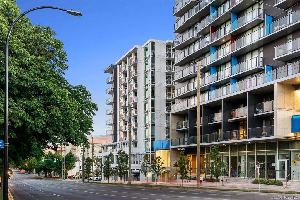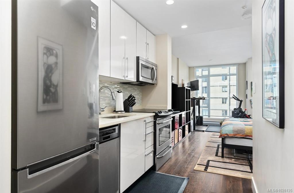 Welcome to this impressive and modern studio condo in a popular steel and concrete building. "The Mondrian" is conveniently located within walking distance to the Downtown Core, Cook St. village, multiple cafes and restaurants, transportation, the ocean and all of your day to day amenities. This unit has an efficient layout for those who live a minimal lifestyle. You will love the chic and modern fully equipped kitchen with stainless steel appliances, quartz countertops and cabinets with slow close drawers. This unit features over height smooth finished ceilings, quality laminate floors, in-suite laundry, 4pc bathroom with soaker tub, separate storage and has access to secure bike storage and an on-site caretaker. This building allows rentals, there are no age restrictions plus BBQ's and pets are allowed (see bylaws for details). This could be your new cozy urban home, your alternative "working from home" office oasis or a fantastic affordable investment property! Call now to view!