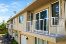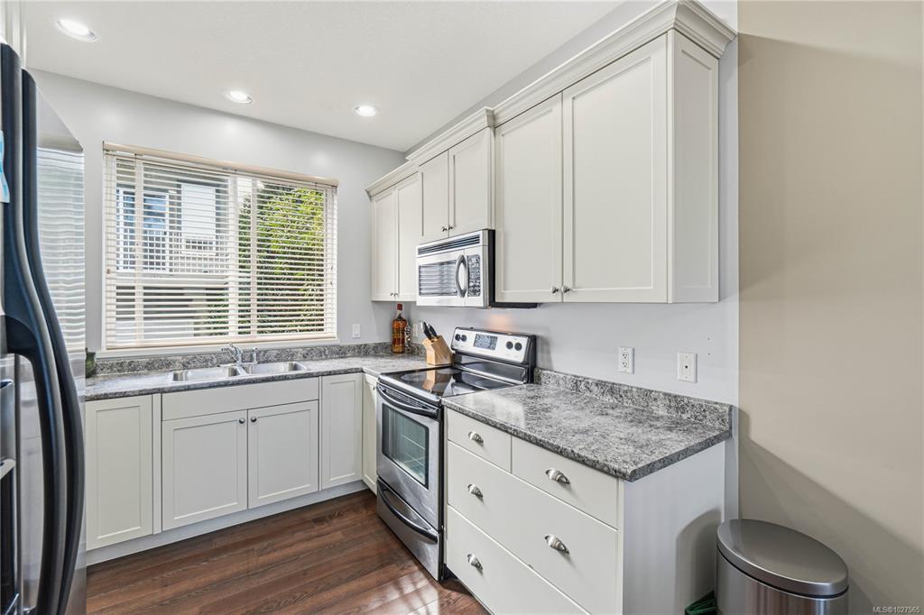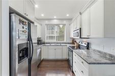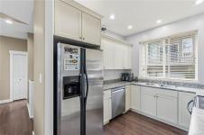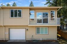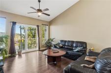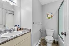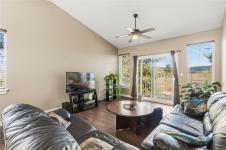 The main level has a vaulted ceiling great room, timeless off-white kitchen cabinetry, a primary bedroom with two closets, a full bathroom with oversized soaker tub and shower as well as a second bedroom. The living room is spacious with large windows and a sliding glass door out to back balcony.
