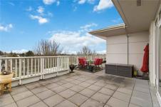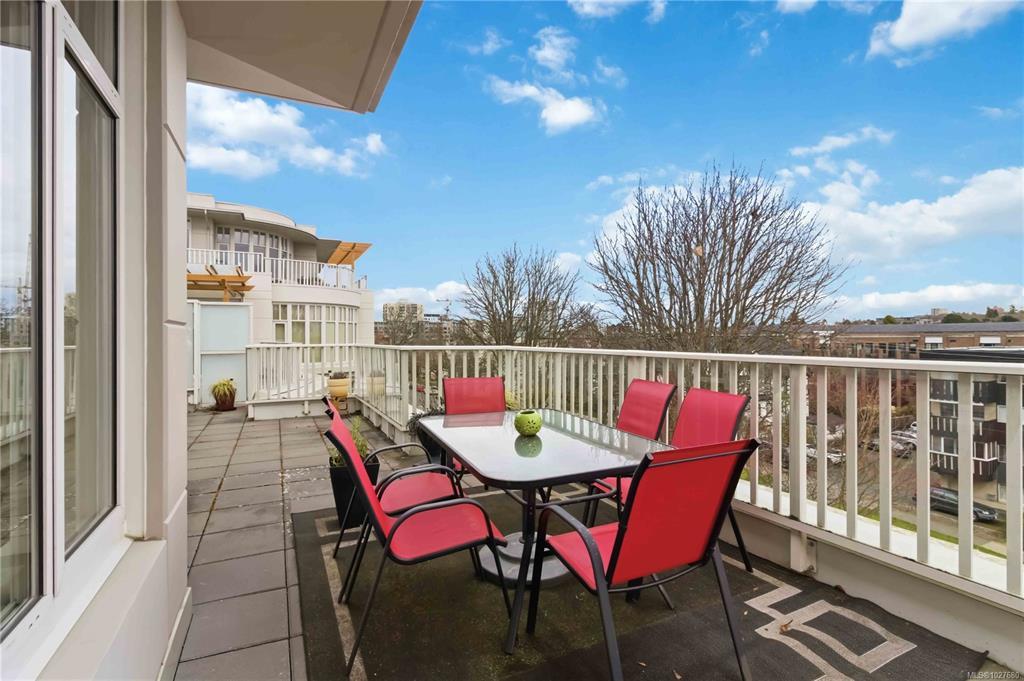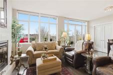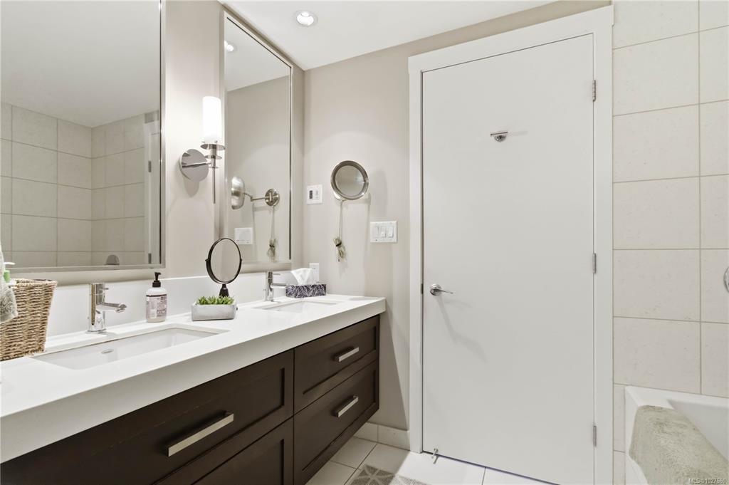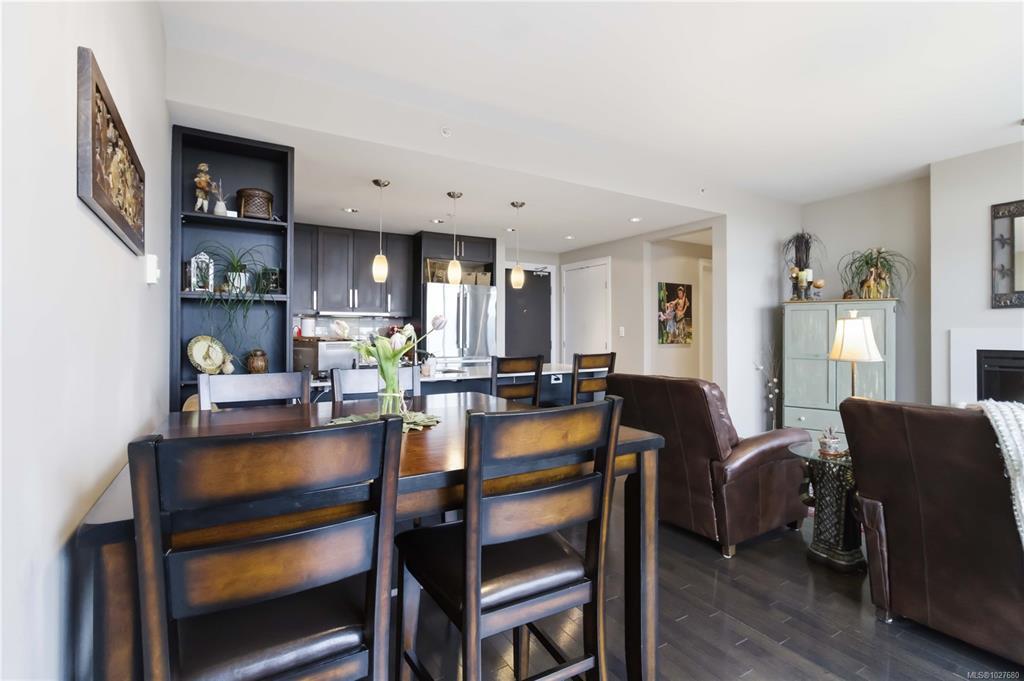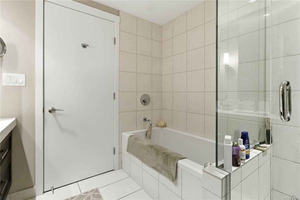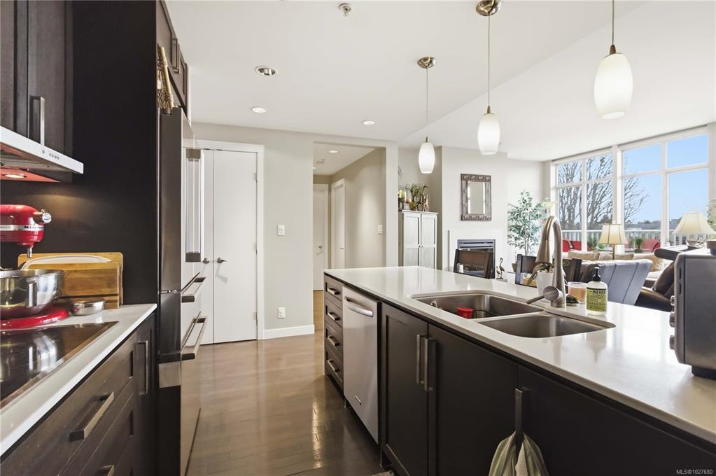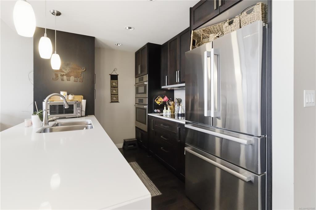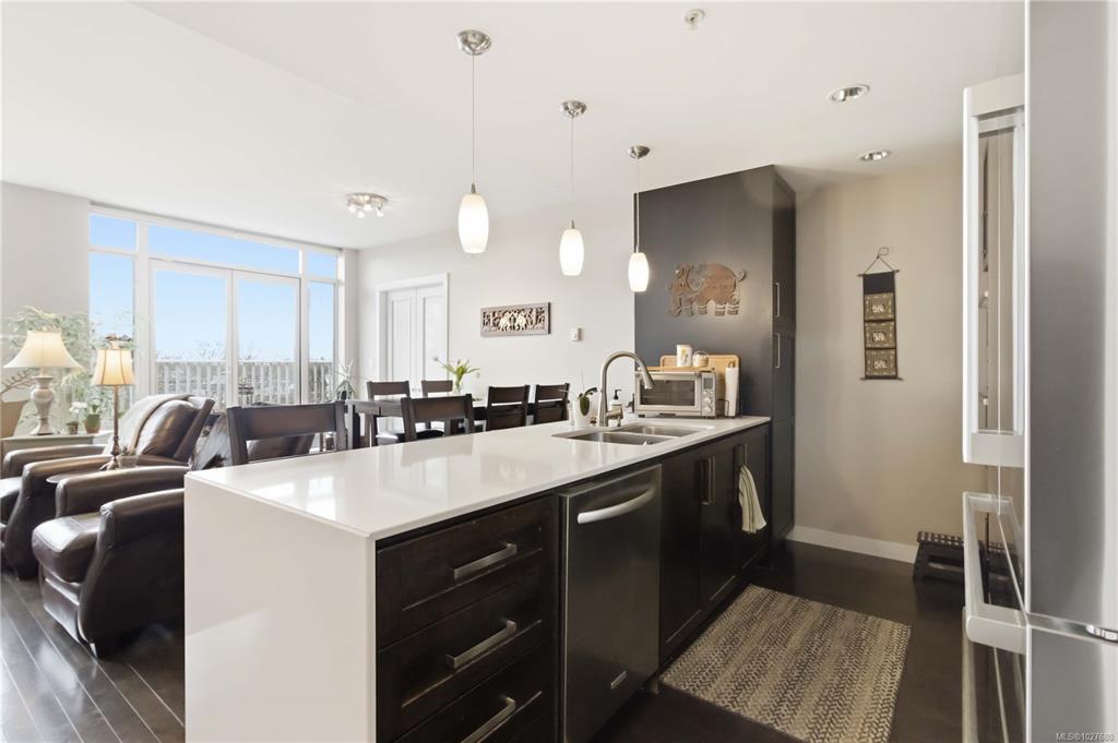 STEEL/CONCRETE built by Concert Properties. Sub Penthouse 1 Bed+Den, 2 Bath home with a massive SOUTH FACING 780sqft Patio offering OLYMPIC MOUNTAIN & OCEAN VIEWS! The unit acts as TOP FLOOR and is just under 1000sqft offering hardwood floors, open floor plan with a chef’s kitchen inc; quartz countertop peninsula island, wall oven, wall microwave, double door fridge with double door freezer, dining area with spacious living area including electric Fireplace. The natural lighting from your multiple LARGE WINDOWS is evident throughout. Den space is perfect with large windows for your office or a spare guest bed or hobby area. The bedroom has ample closet space, will fit a king-sized bed as well as bedroom furniture and the ensuite bath has a walk-in shower, soaker tub, his/her sinks and heated flooring. The main bath is a 2 piece and you have a full laundry room with storage capabilities. The building offers a Meeting Room, Gym, Underground EV installed Parking Stall and a STORAGE LOCKER