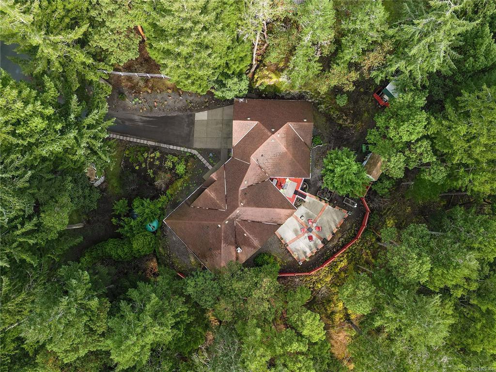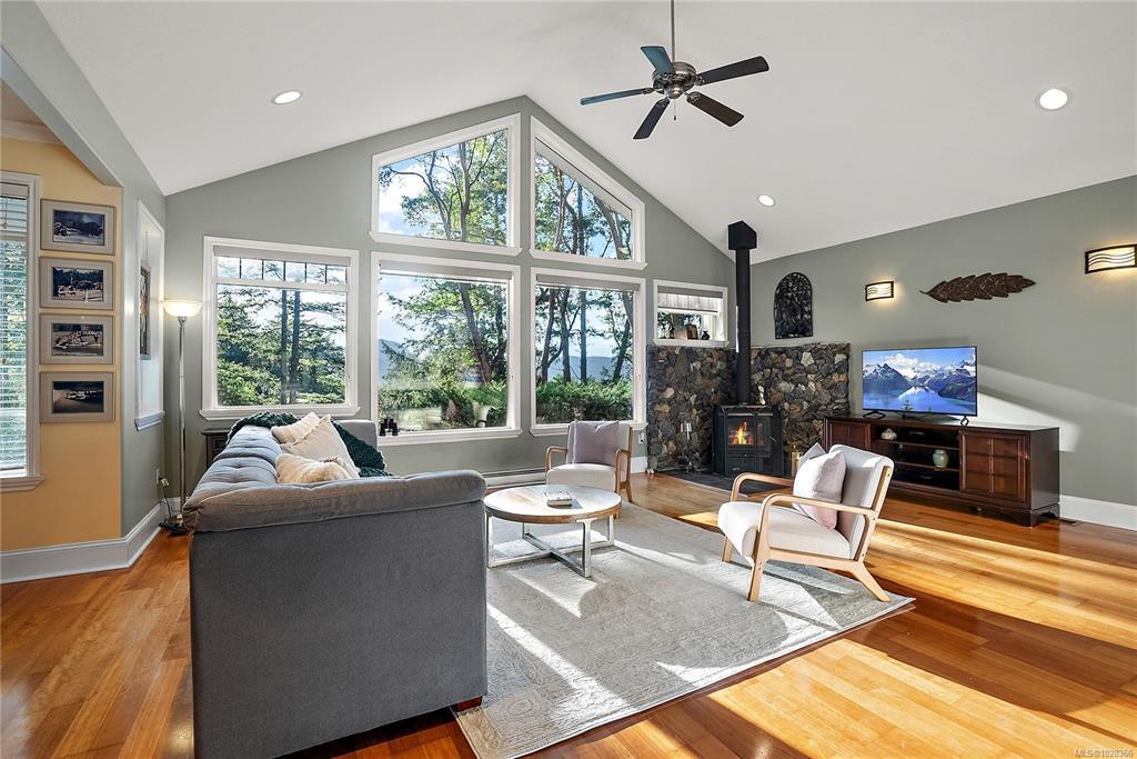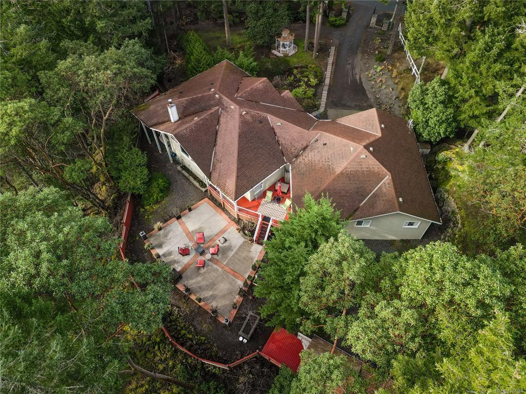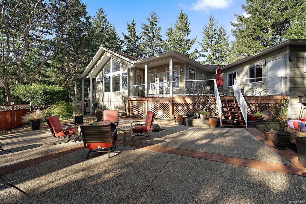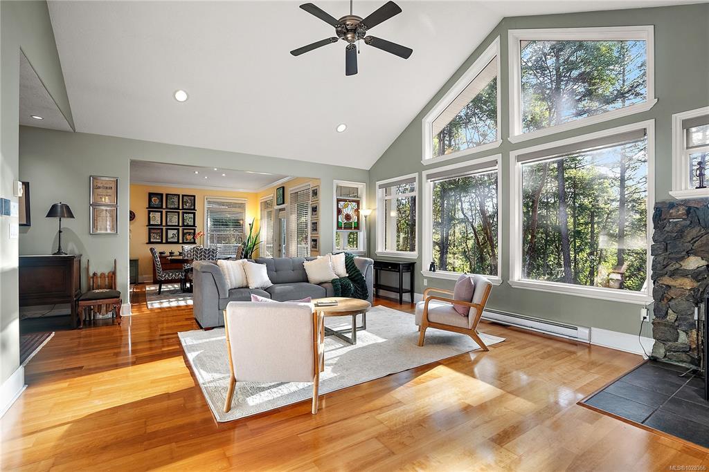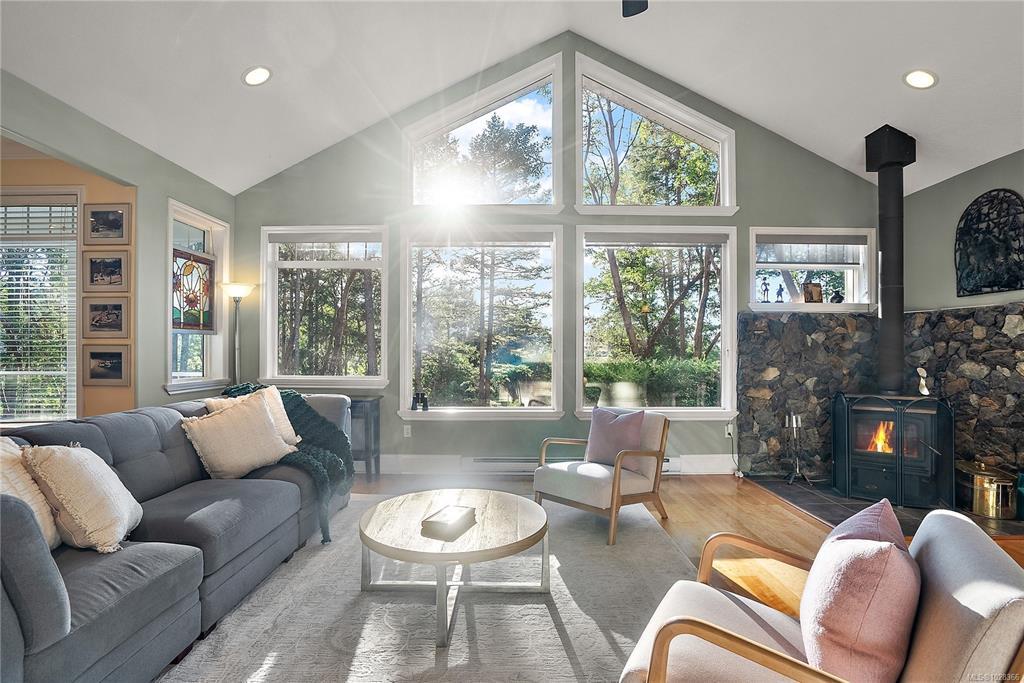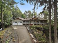 A warm & inviting custom-built rancher set on a quiet, private forested acreage just 10 mins to Langford. The thoughtfully designed home has 3 beds (one previously used as art studio, executive office, gym & music studio), 3 baths & family room. Vaulted ceilings & oversized windows in main living area & nine-foot ceilings throughout create a bright, open feel w/forest views from every room. The modern kitchen features granite counters, eating bar, abundant storage & custom stained-glass accents. The spacious primary has walk-in closet, ensuite & striking Arbutus tree glass panel in door. Comfort is assured year-round w/ ducted heat pump, electric furnace & cozy wood stove, plus central vac, rainwater harvesting & back-up generator. Outside enjoy an extensive network of outdoor living w/ large patio, multiple decks & breezy front-yard gazebo. Watch birds gather by the pond, relax in nature & enjoy a friendly rural neighborhood ideal for families & those seeking a peaceful lifestyle.