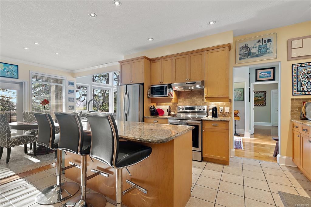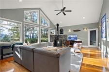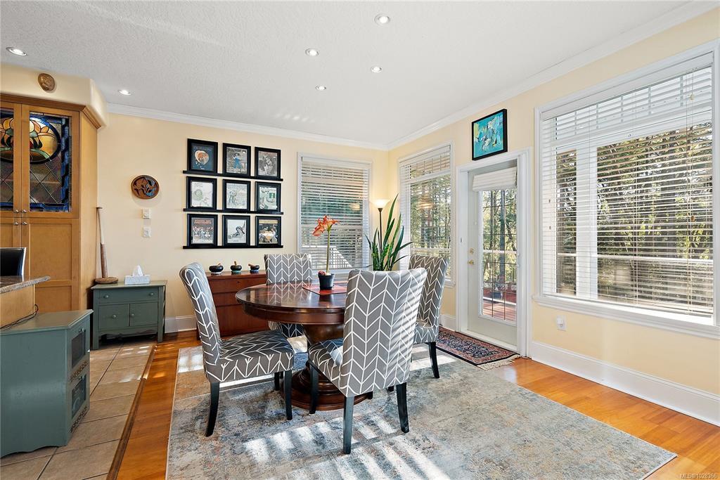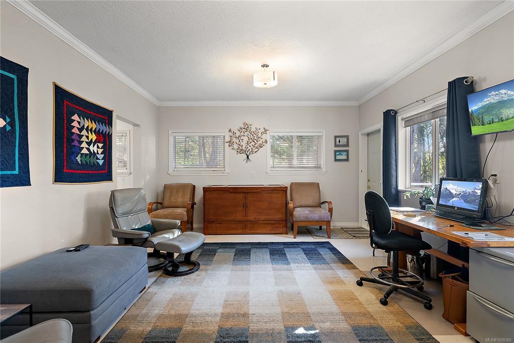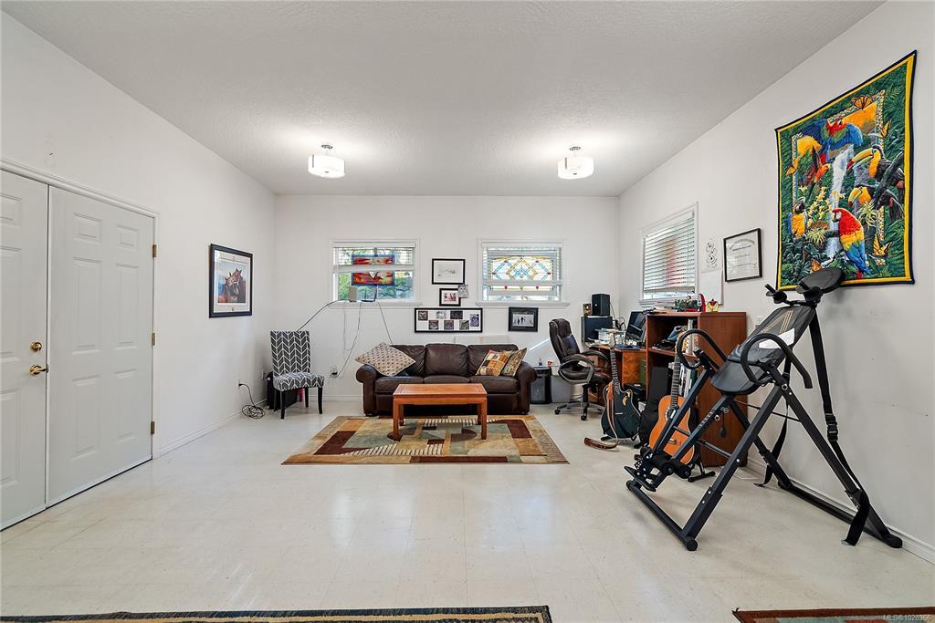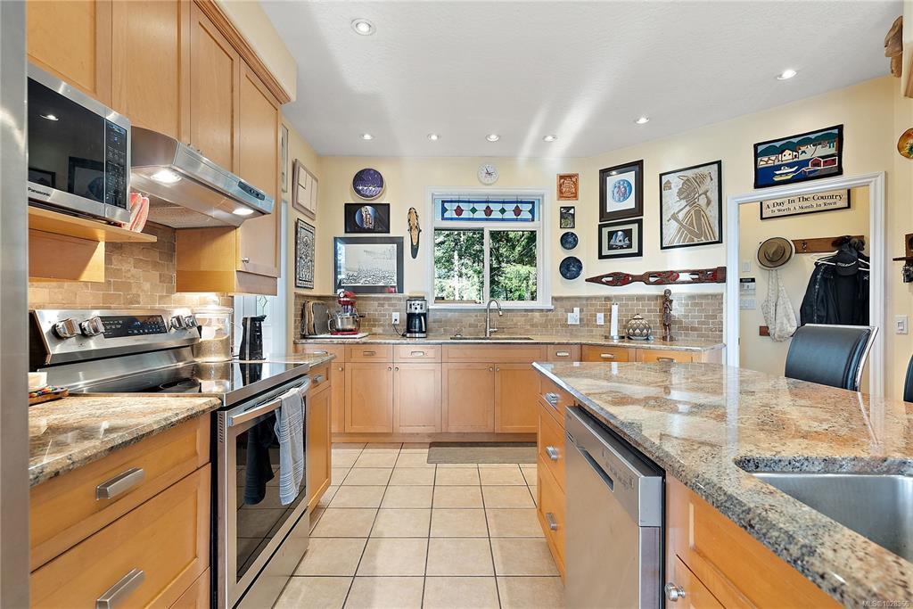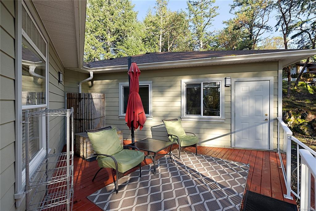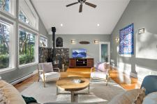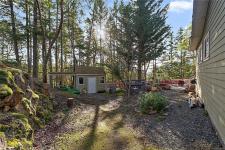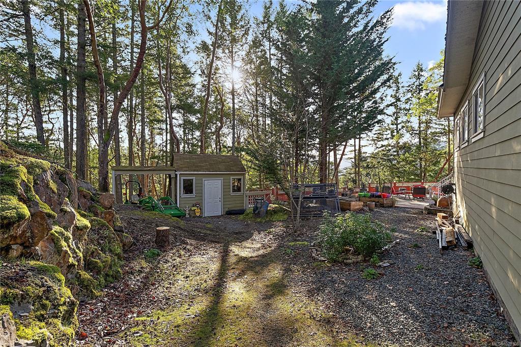 A warm & inviting custom-built rancher set on a quiet, private forested acreage just 10 mins to Langford. The thoughtfully designed home has 3 beds (one previously used as art studio, executive office, gym & music studio), 3 baths & family room. Vaulted ceilings & oversized windows in main living area & nine-foot ceilings throughout create a bright, open feel w/forest views from every room. The modern kitchen features granite counters, eating bar, abundant storage & custom stained-glass accents. The spacious primary has walk-in closet, ensuite & striking Arbutus tree glass panel in door. Comfort is assured year-round w/ ducted heat pump, electric furnace & cozy wood stove, plus central vac, rainwater harvesting & back-up generator. Outside enjoy an extensive network of outdoor living w/ large patio, multiple decks & breezy front-yard gazebo. Watch birds gather by the pond, relax in nature & enjoy a friendly rural neighborhood ideal for families & those seeking a peaceful lifestyle.
