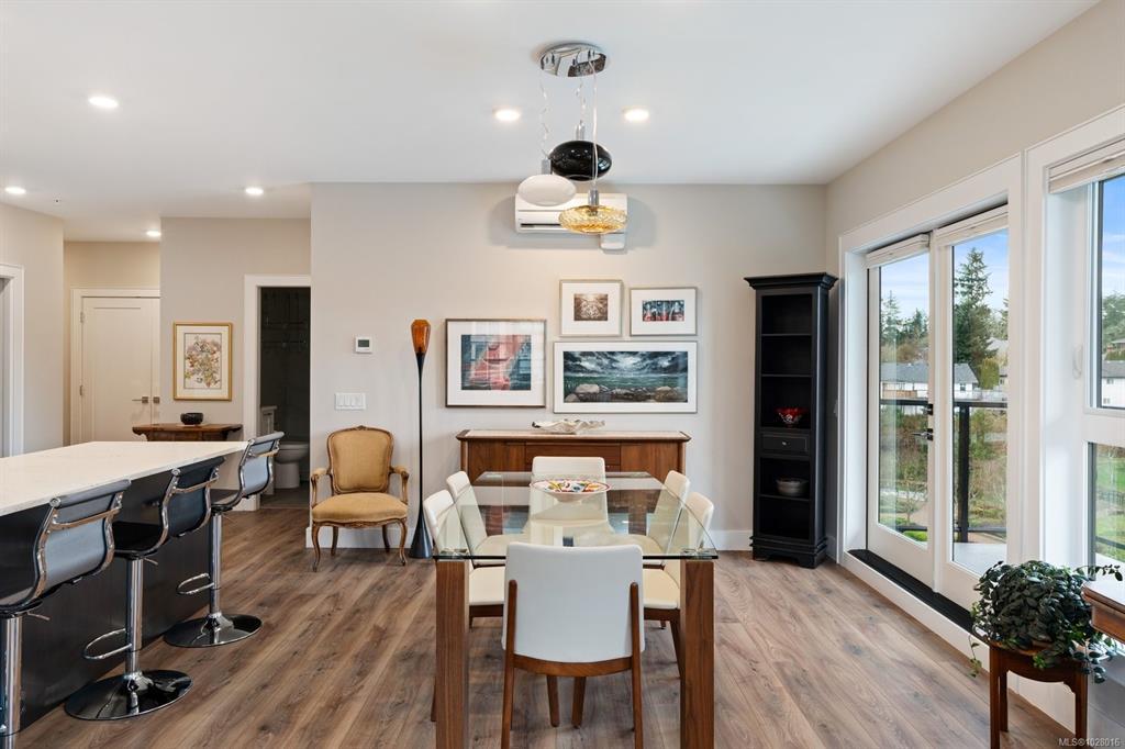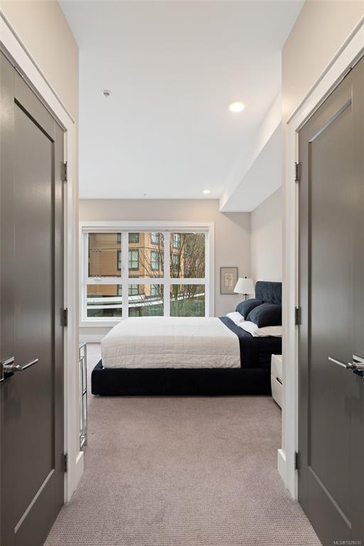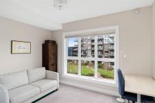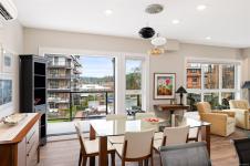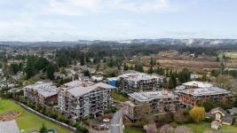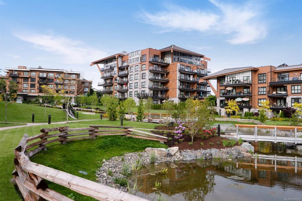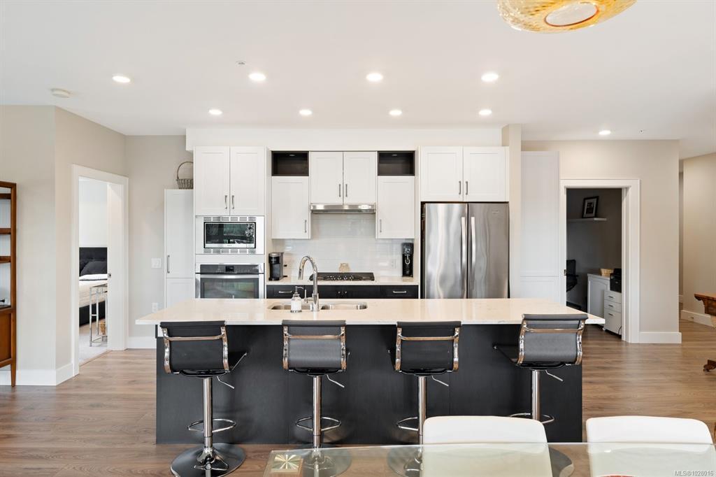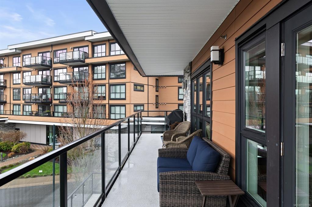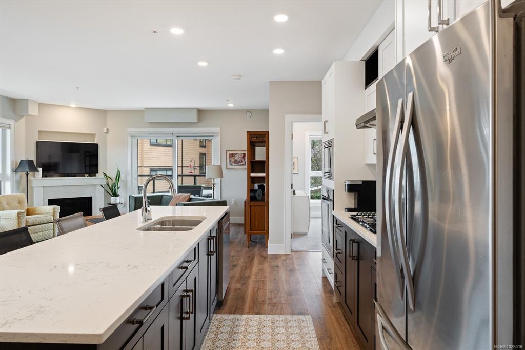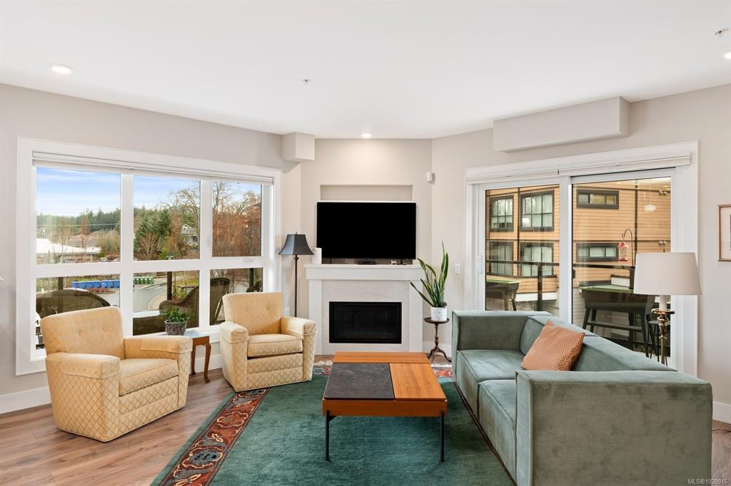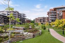 Like-new corner residence at Travino offering 1,335 sq.ft. of bright, refined living w/ 2 beds, 2 baths + den. One of the most desirable layouts w/ well-separated bedrooms & a spacious open-concept living & dining area. Step onto the impressive 312 sq.ft. wraparound deck w/ westerly exposure overlooking beautifully landscaped grounds. The chef-inspired kitchen features quartz counters, a large island, gas range, built-in wall oven, & ample cabinetry. Modern finishes, & a cozy gas fireplace create a warm, elegant space ideal for relaxing or entertaining. The generous primary offers a luxurious 5-piece ensuite w/ soaker tub & separate shower. Includes underground parking w/ EV charging & storage. Residents enjoy exceptional amenities incl rooftop patio, gym, games room, bike storage, dog wash station, & lounge w/ kitchen. Award-winning Built Green Gold Certified w/ solar-assisted HVAC & hot water included in strata fees. Steps to shops, parks, trails, & transit. Simply move in and enjoy!