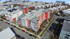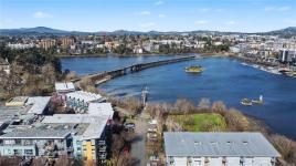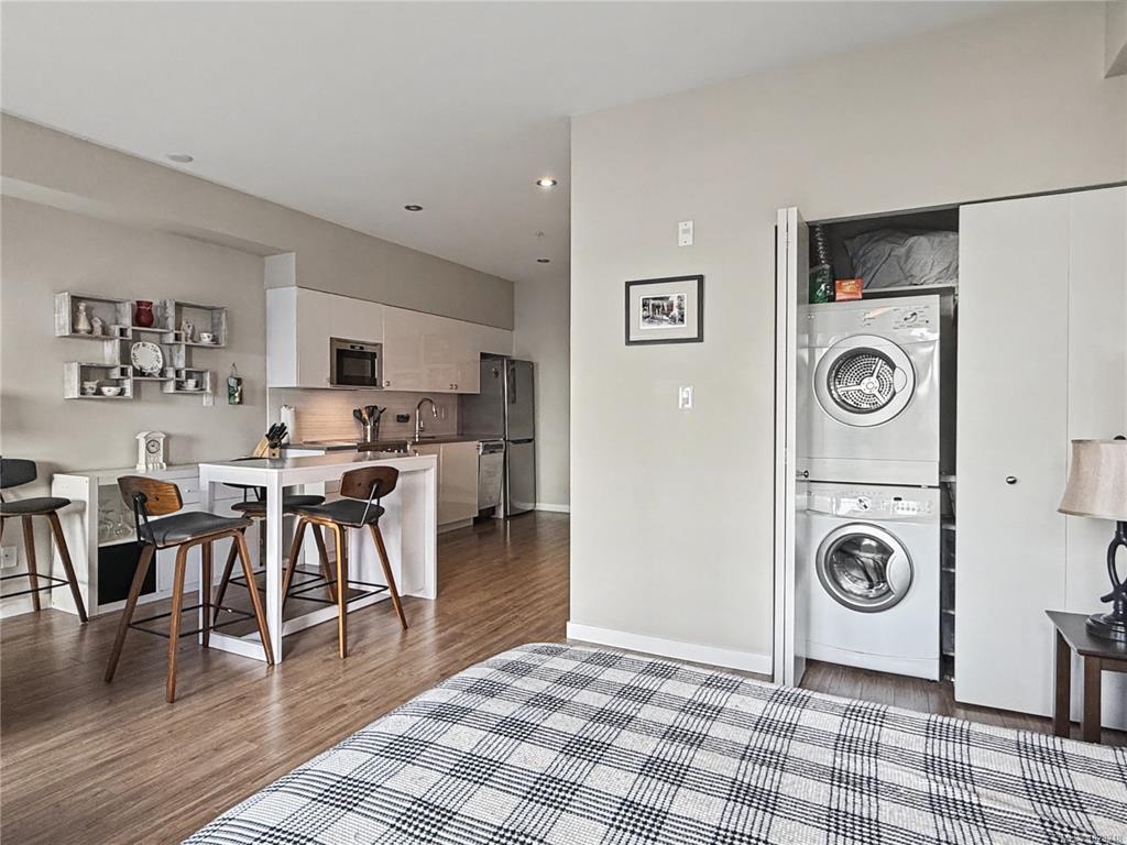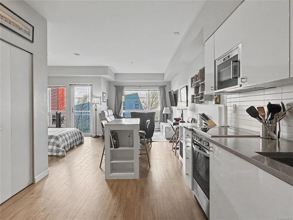 Wake up steps from the water. This bright, well-designed and spacious-feeling studio at The RailYards sits right on the Gorge Waterway and Galloping Goose Trail — kayak launch, paddleboard put-in, and the iconic Trestle all within easy reach. A quiet, tucked-away enclave that still gets you downtown in minutes. Inside you'll enjoy 9-ft ceilings, open layout, quartz countertops, stainless appliances, heated tile floors, in-suite laundry, and a Murphy bed that keeps your space flexible. The sheltered balcony works year-round. Westside Village is steps away for daily essentials. Underground parking, storage locker, bike storage, and kayak storage included. Pet friendly, well-managed strata. Come and imagine life at the intersection of active and easy.