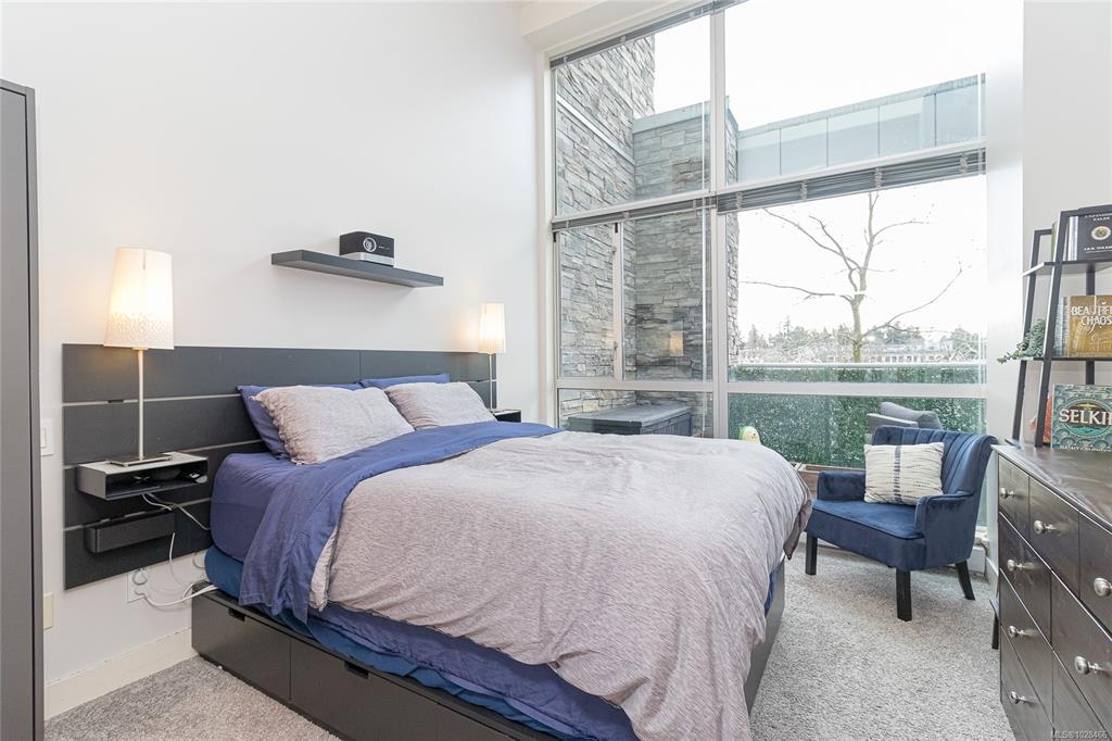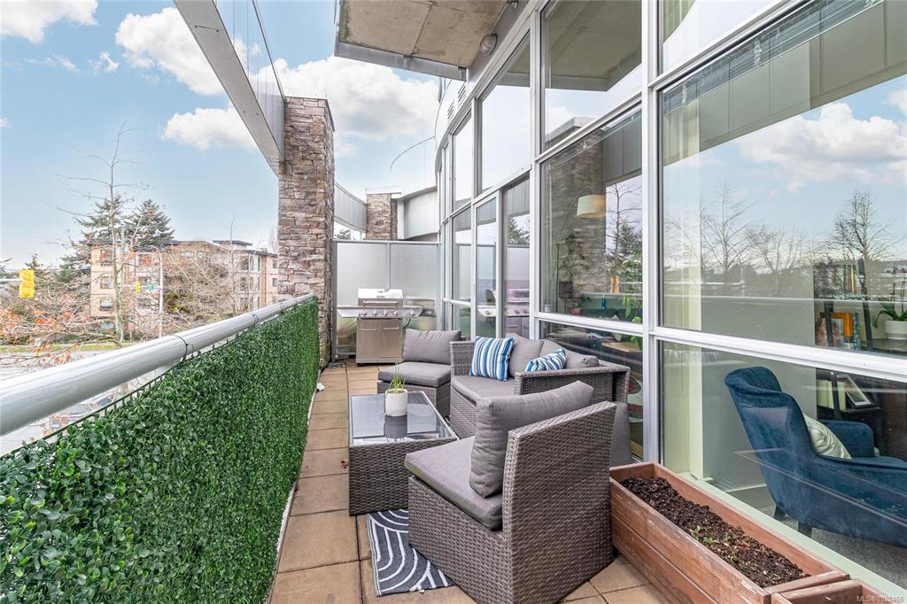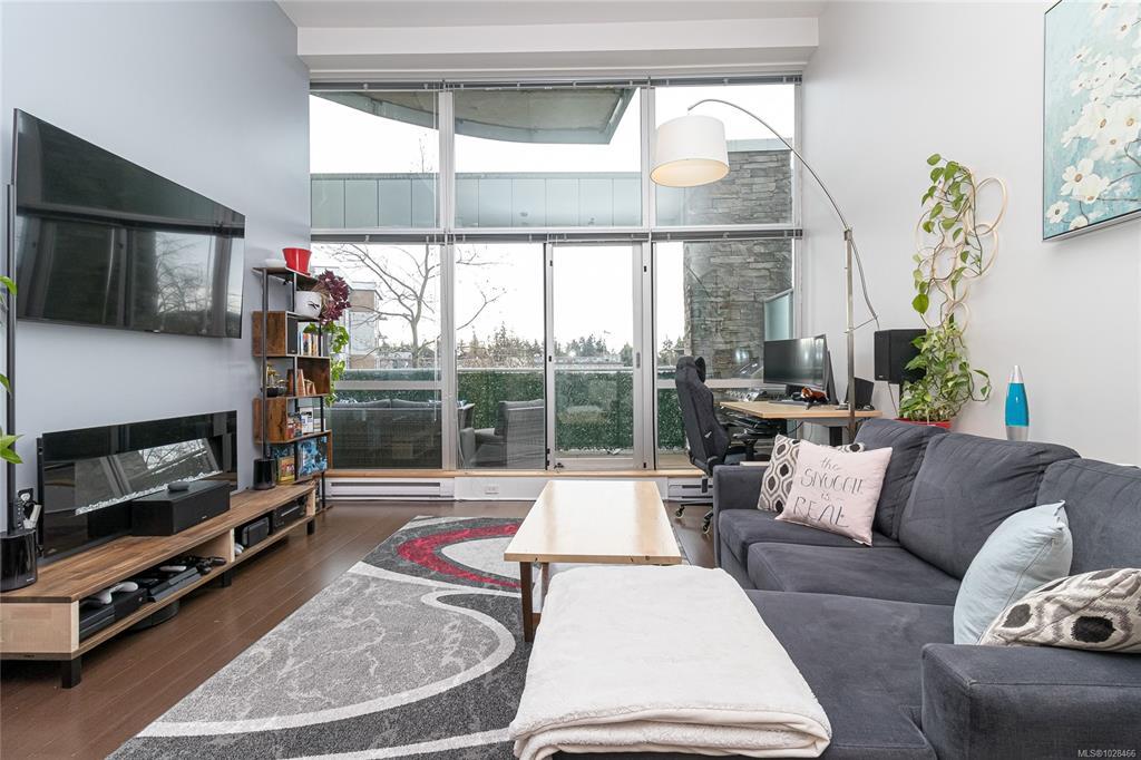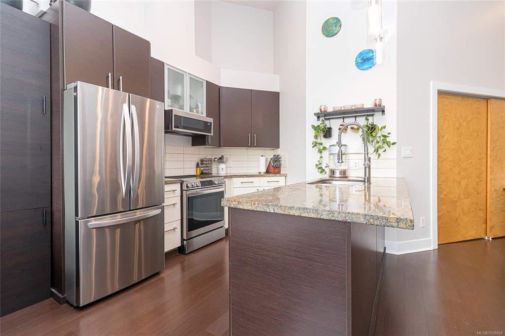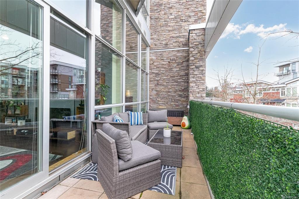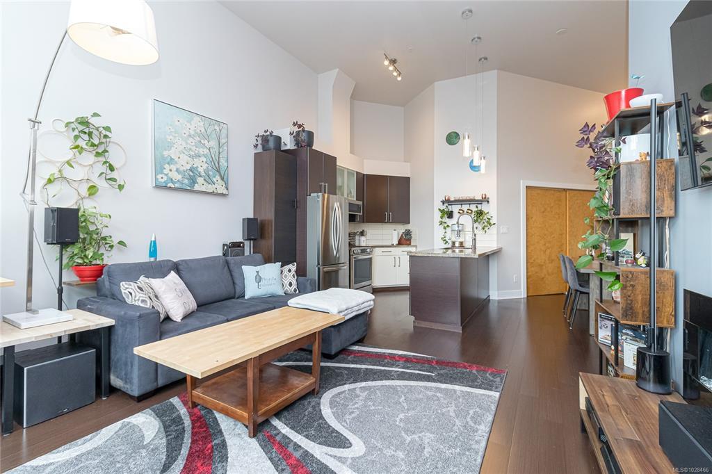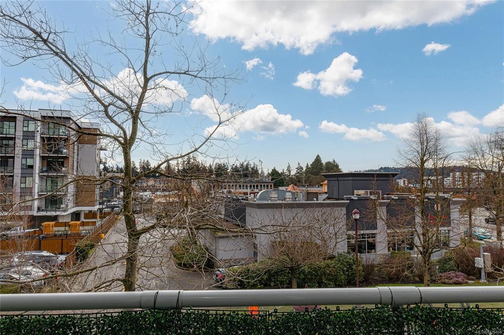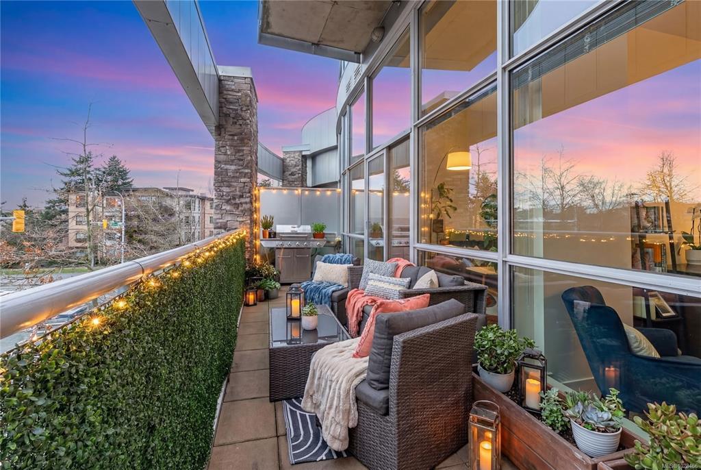 Located in the sought-after Reflections building, this modern and spacious condo offers stylish living in the heart of Langford. From the moment you walk through the door, you’ll be awed by the soaring 13'5" ceilings and floor-to-ceiling windows that fill the home with natural light. The bright, open-concept layout features gleaming hardwood floors and a contemporary design. The kitchen is finished with granite countertops, tiled backsplash, stainless steel appliances, and sleek cabinetry, flowing seamlessly into the living area. Enjoy the large south-facing deck, perfect for entertaining, container gardening, or relaxing while taking in the sunset. The primary bedroom offers high ceilings, a walk-through closet, & ensuite. The second bedroom/den is ideal for a home office or guest room. Reflections is known for its striking curved architecture and amenities including a rooftop running track & outdoor pool. Just steps to Goldstream Village shops, cafes & restaurants. Come see it today!