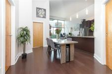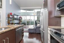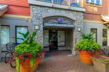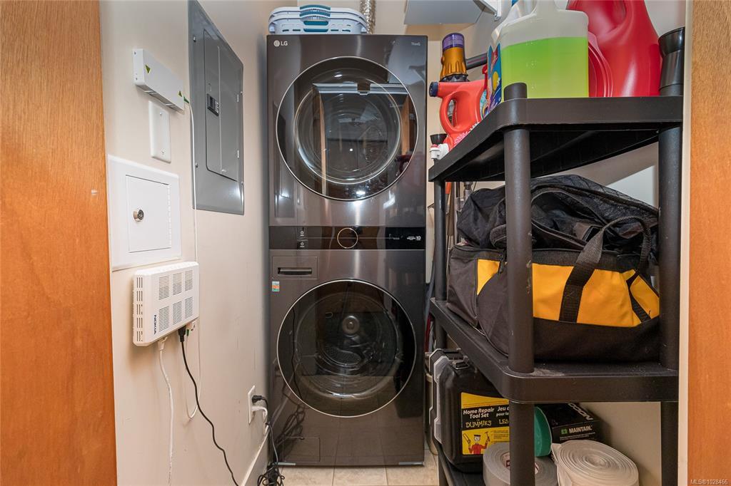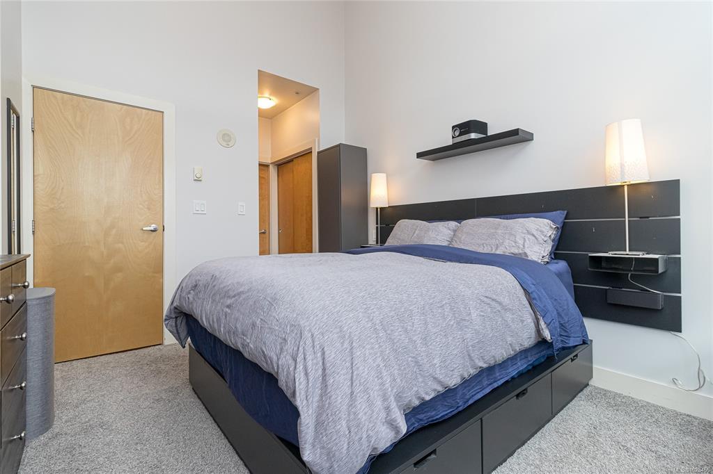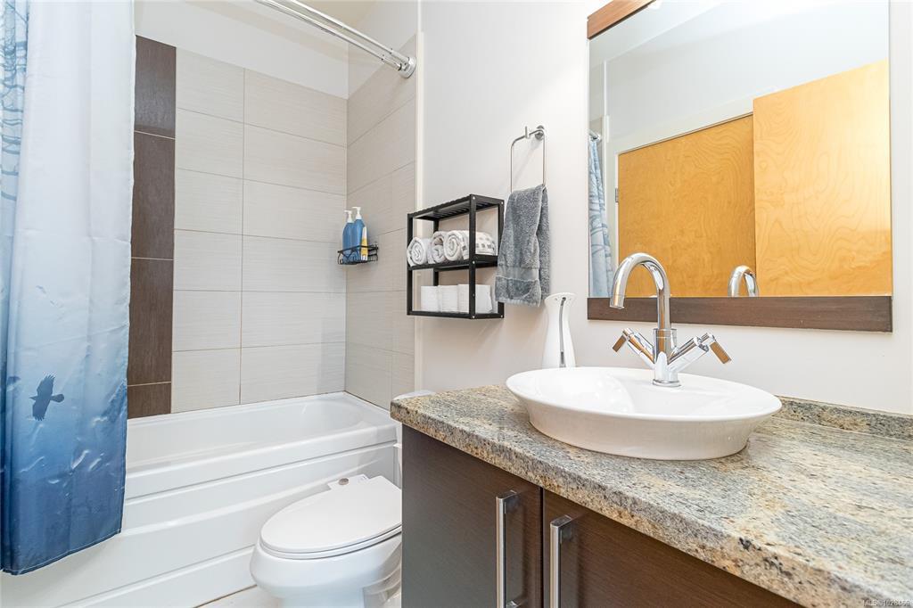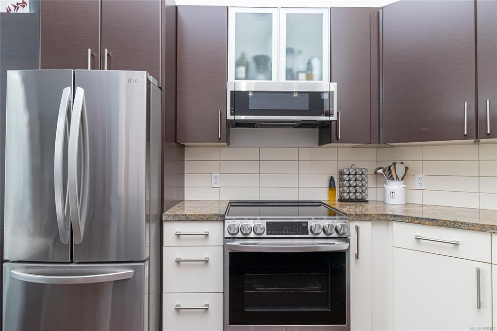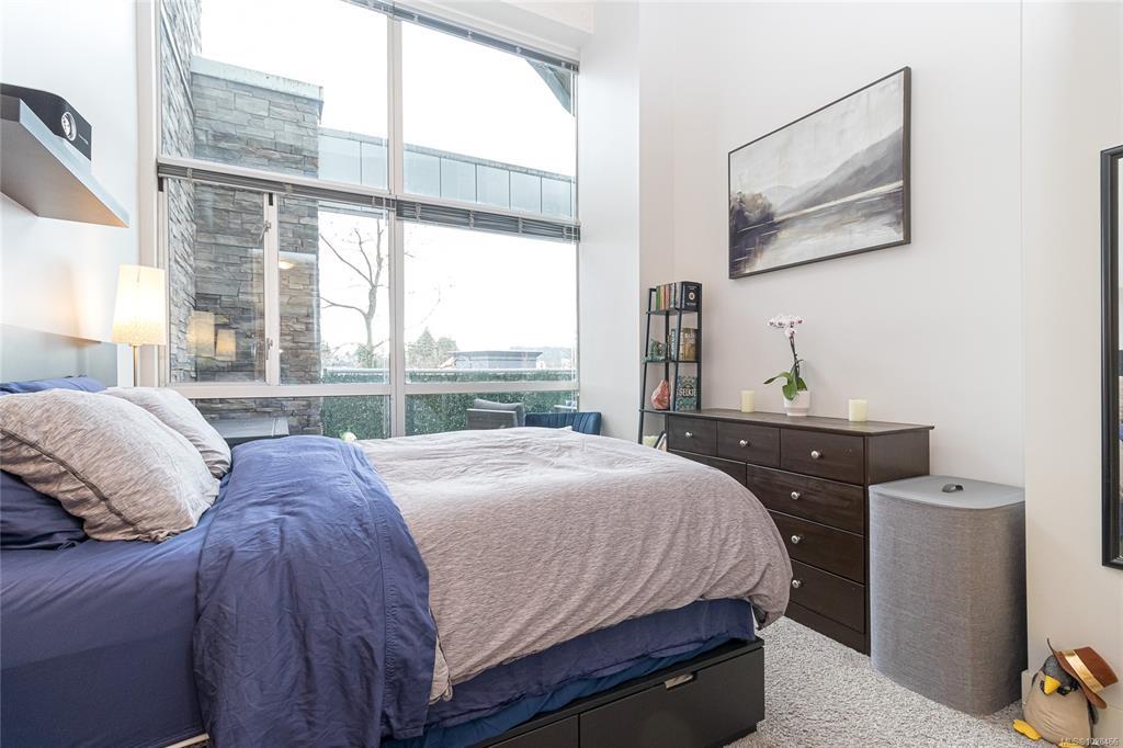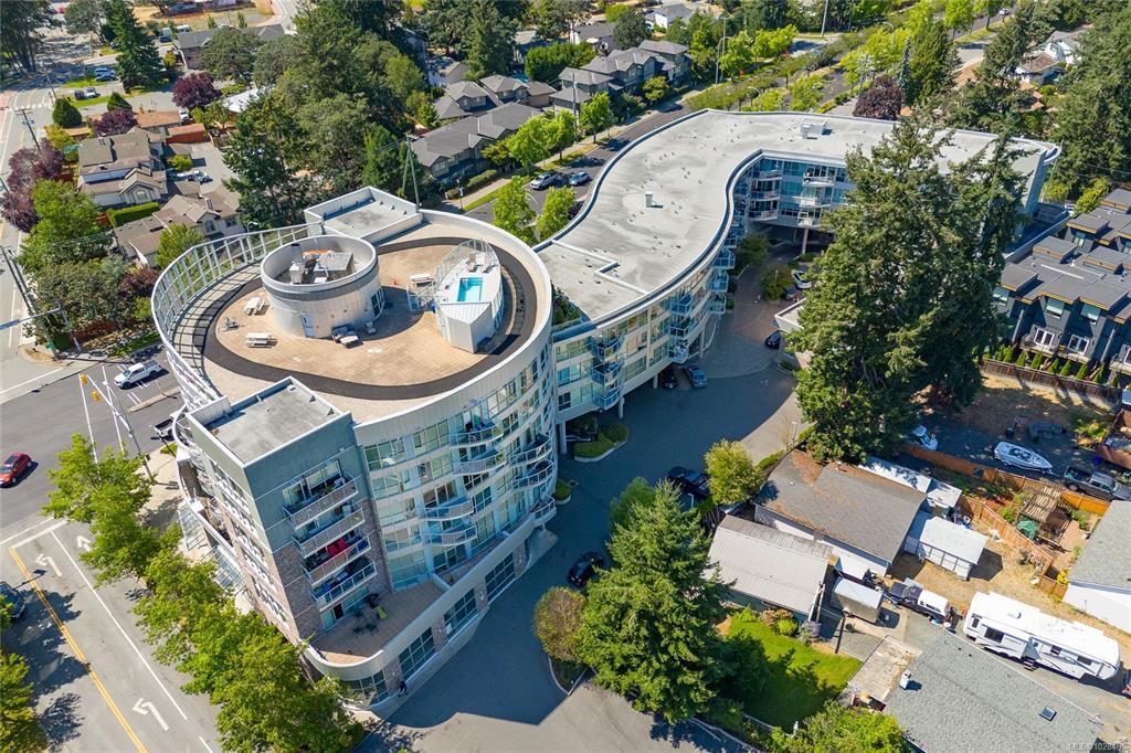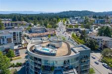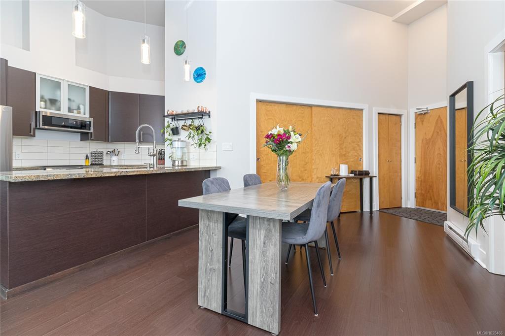 Located in the sought-after Reflections building, this modern and spacious condo offers stylish living in the heart of Langford. From the moment you walk through the door, you’ll be awed by the soaring 13'5" ceilings and floor-to-ceiling windows that fill the home with natural light. The bright, open-concept layout features gleaming hardwood floors and a contemporary design. The kitchen is finished with granite countertops, tiled backsplash, stainless steel appliances, and sleek cabinetry, flowing seamlessly into the living area. Enjoy the large south-facing deck, perfect for entertaining, container gardening, or relaxing while taking in the sunset. The primary bedroom offers high ceilings, a walk-through closet, & ensuite. The second bedroom/den is ideal for a home office or guest room. Reflections is known for its striking curved architecture and amenities including a rooftop running track & outdoor pool. Just steps to Goldstream Village shops, cafes & restaurants. Come see it today!