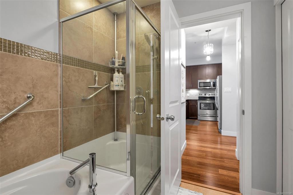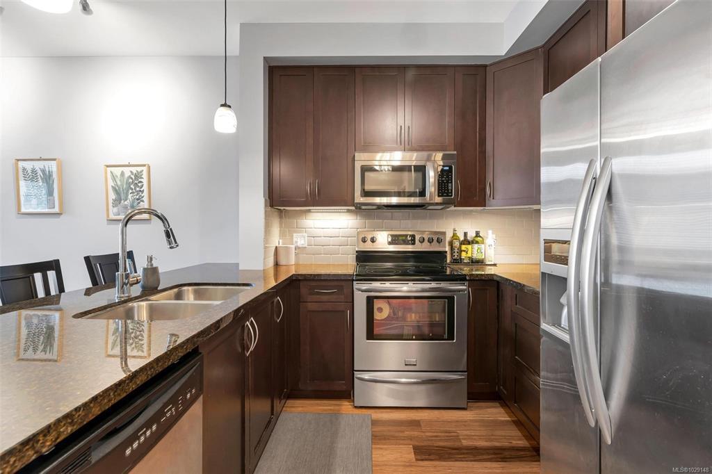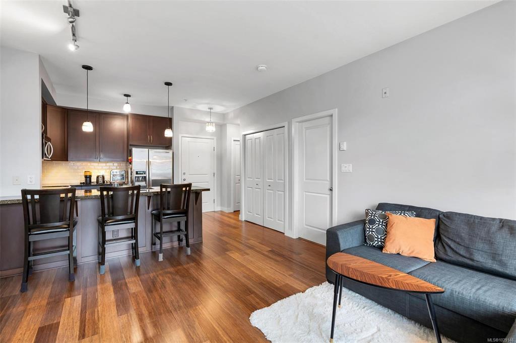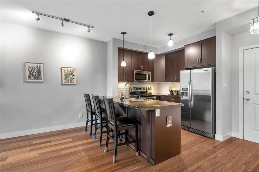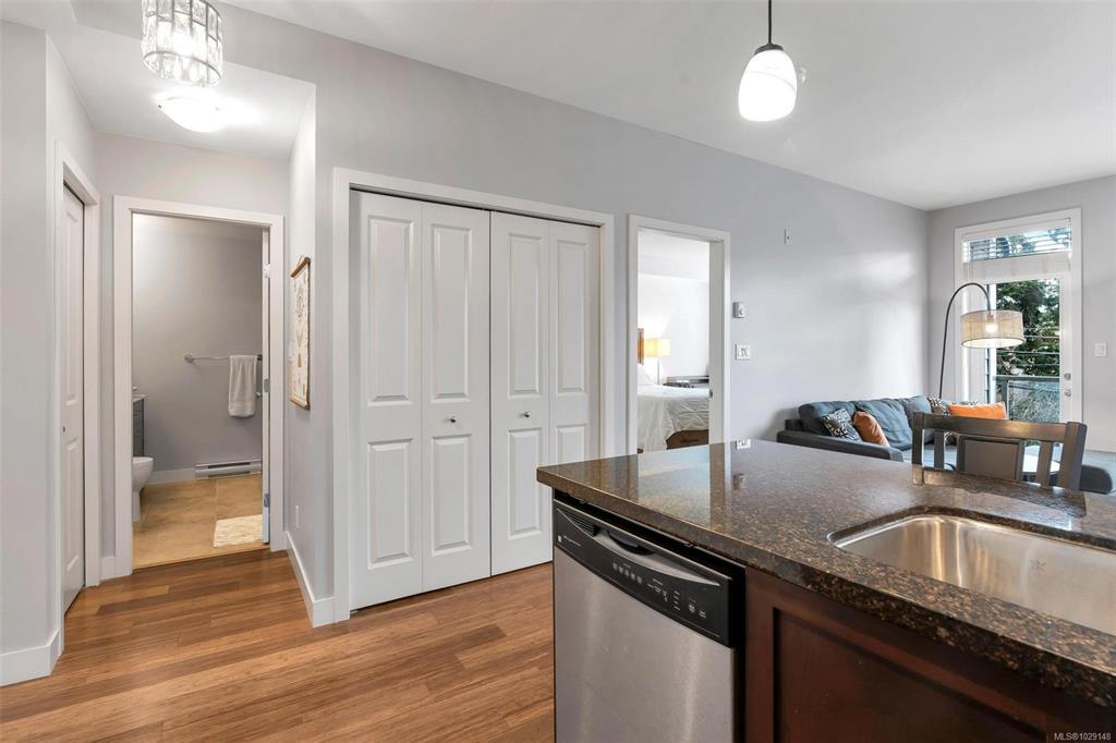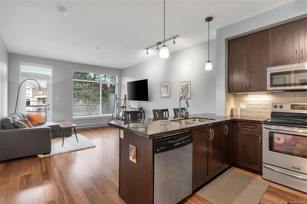 Welcome to this 1 bed, 1 bath condo in the heart of Langford. Built in 2009, this bright and functional home offers 721 sq ft of comfortable living, ideal for first-time buyers, downsizers, or investors. Located on the 3rd floor, the unit features 9 ft ceilings and an efficient open-concept layout. The kitchen offers granite countertops, tile backsplash, and stainless steel appliances, flowing into the main living space. The spacious bedroom is complemented by a bathroom with both a separate shower and soaker tub. Includes 1 secure underground parking stall and a storage locker. Ideally situated next to Royal Colwood Golf Course and just minutes to shopping, restaurants, transit, and everyday amenities. A great opportunity to enter the market in one of Langford’s most convenient locations.