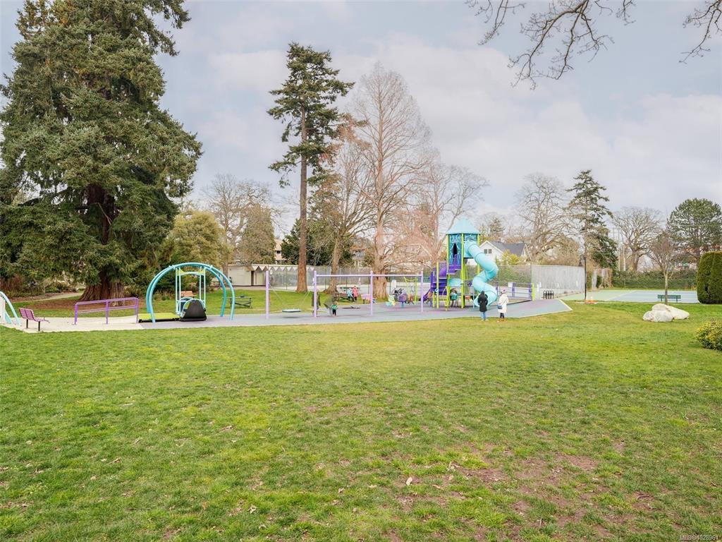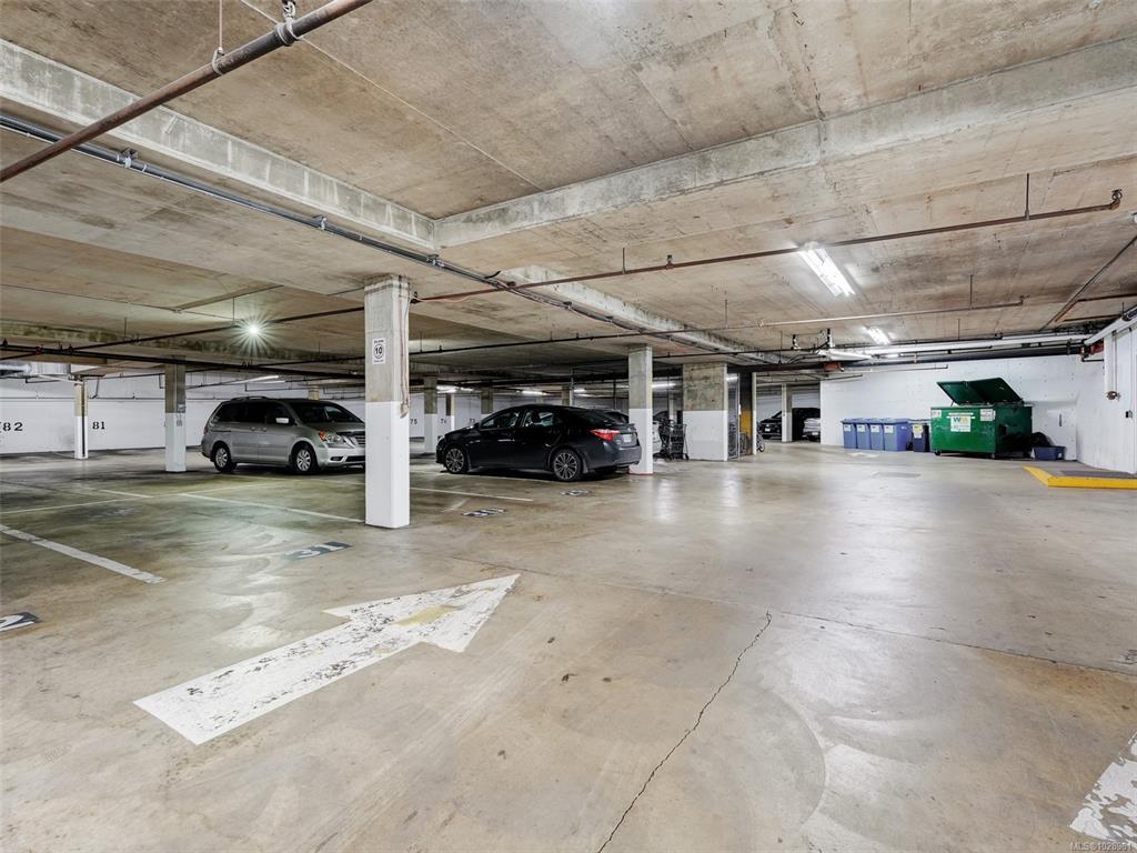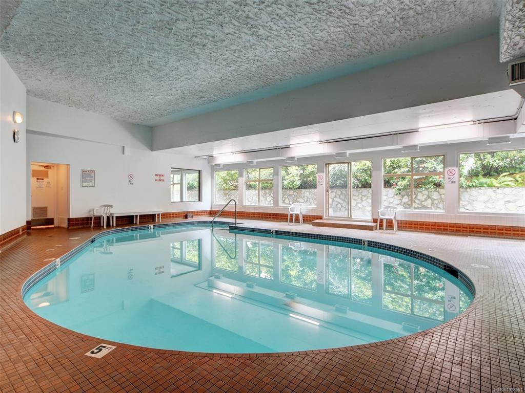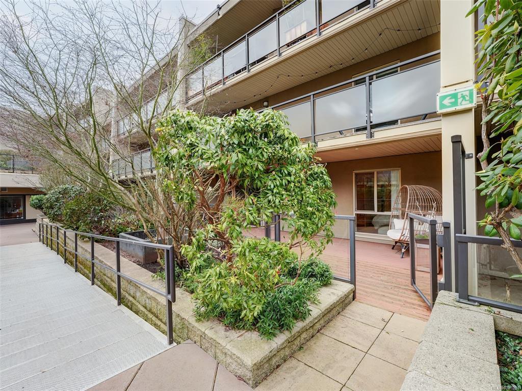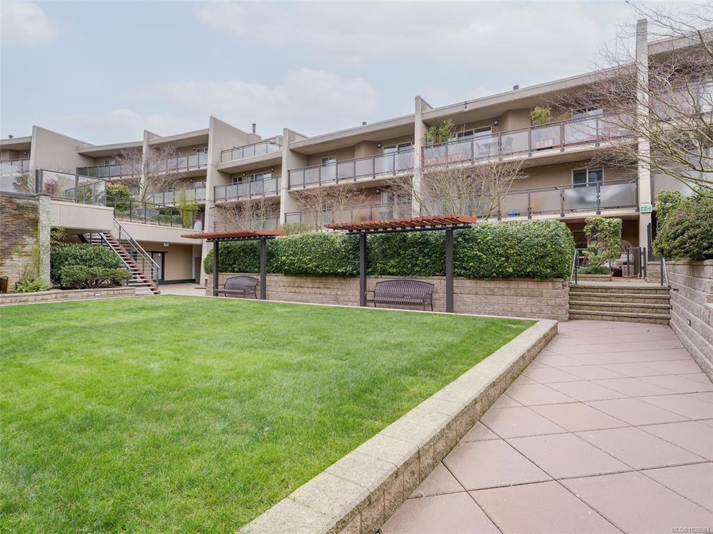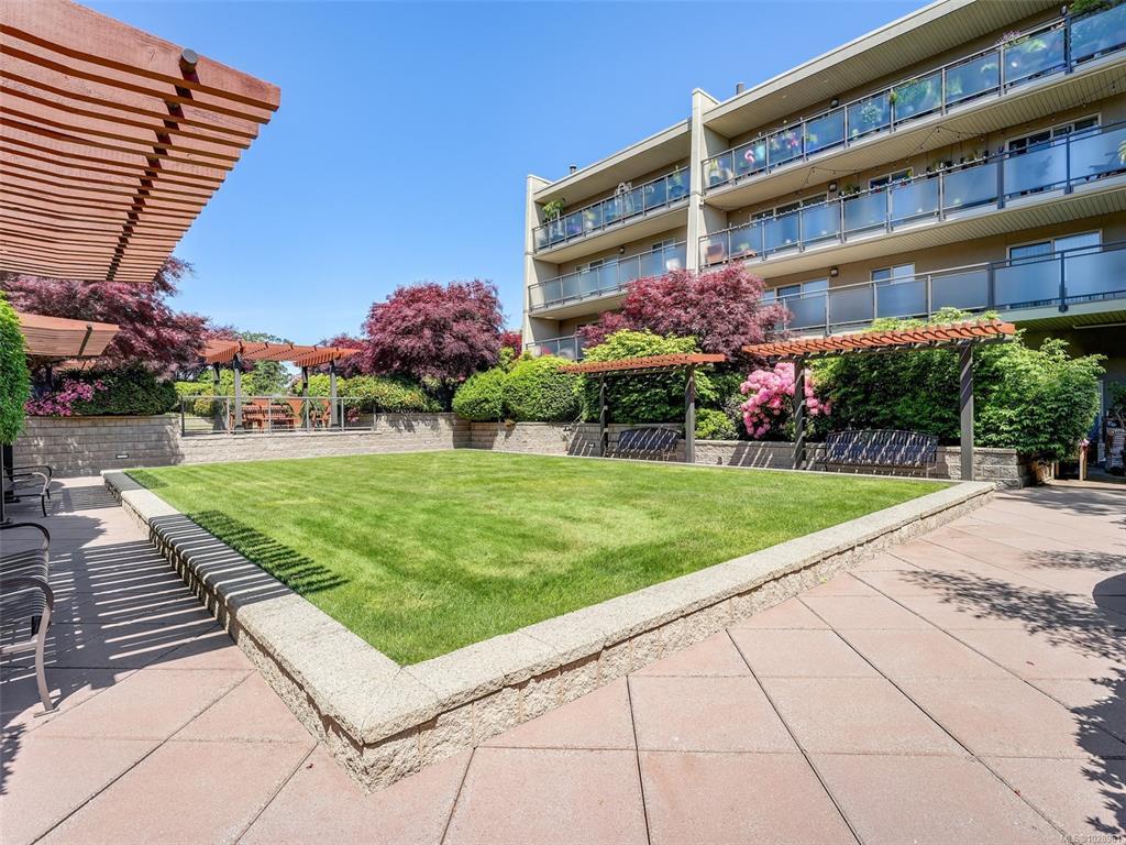 Feel the peacefulness of this private and spacious 1 Bedroom home that overlooks the beautiful landscaped courtyard gardens from its expansive patio. More spacious than many 2 bedrooms and NOT ON GROUND LEVEL. This home is in a prime location within a highly desirable building. It is ideal for those who value privacy, quiet, and generous space. Tastefully updated with a sleek kitchen offering glass-front cabinetry, stainless-steel appliances & engineered hardwood flooring. The Stadacona Centre is a well-managed complex within easy walking distance to Downtown, Oak Bay Village, the Dallas Road waterfront, Royal Jubilee Hospital, parks, tennis, Craigdarroch Castle, Government House & conveniently located en route to Camosun, UVIC & more. Building amenities include indoor pool, sauna, hot tub, gym, library/office, workshop, EV charging, meeting and games room. Parking & storage included. Enjoy comfort, privacy, convenience & nearby amenities. This home is a MUST SEE!