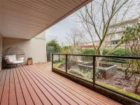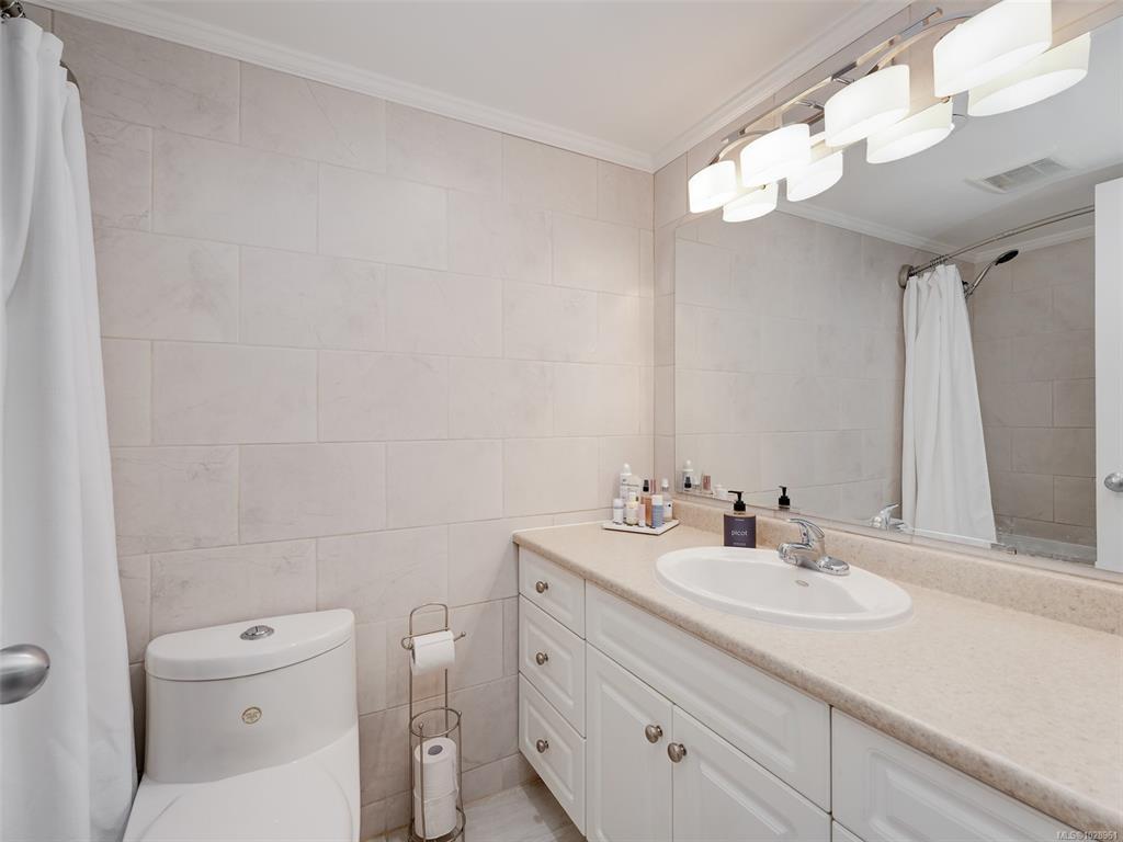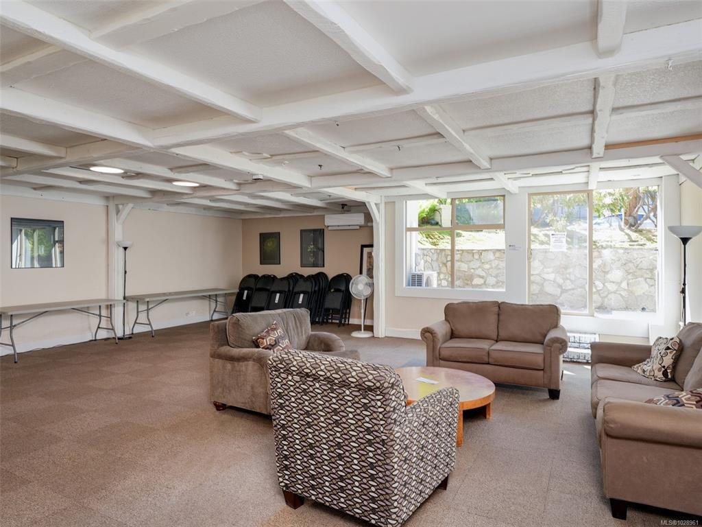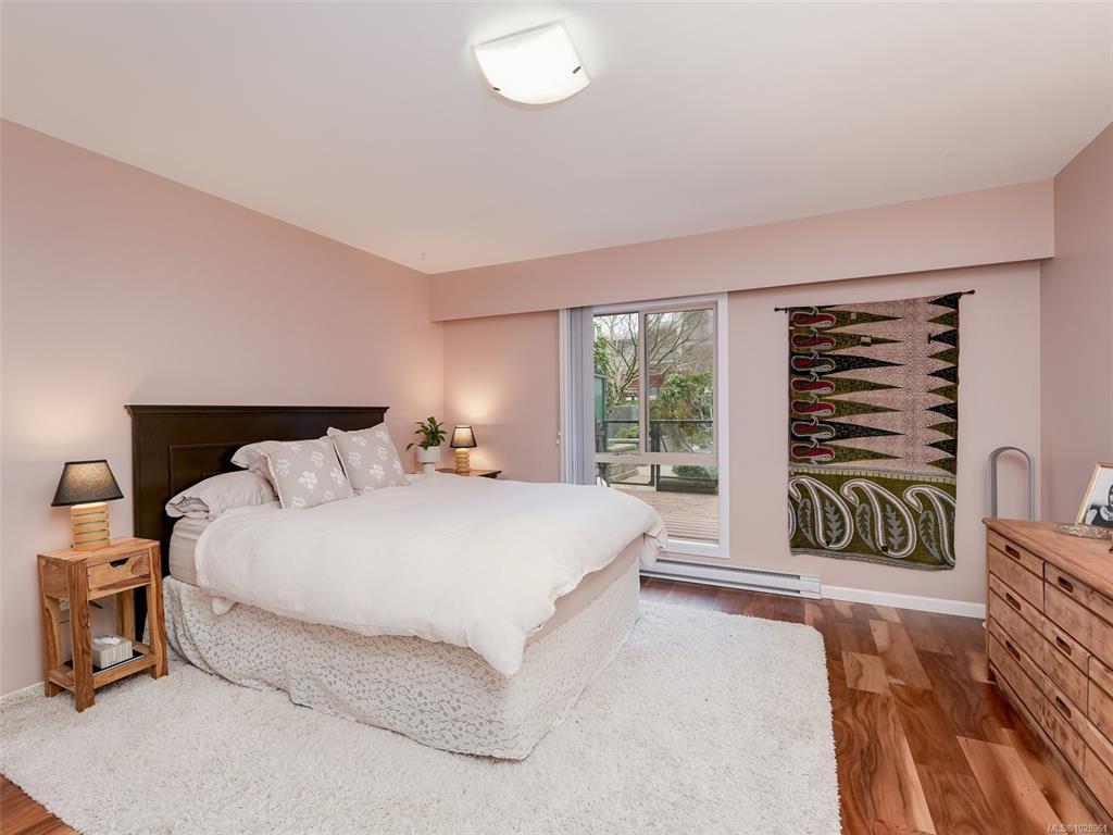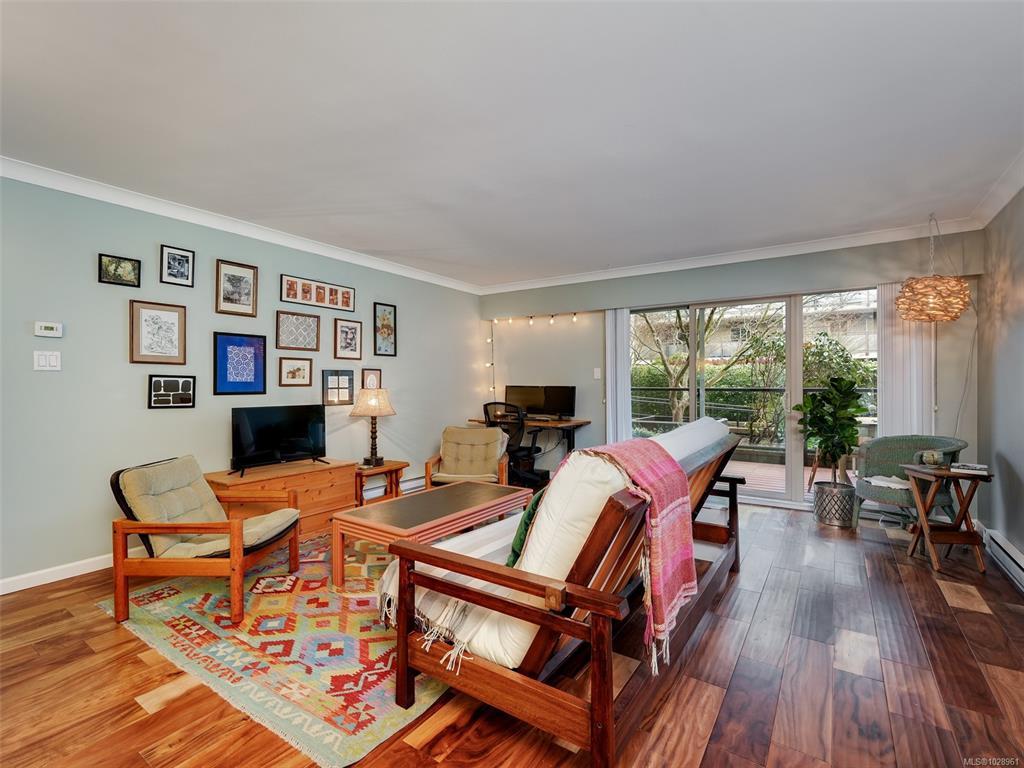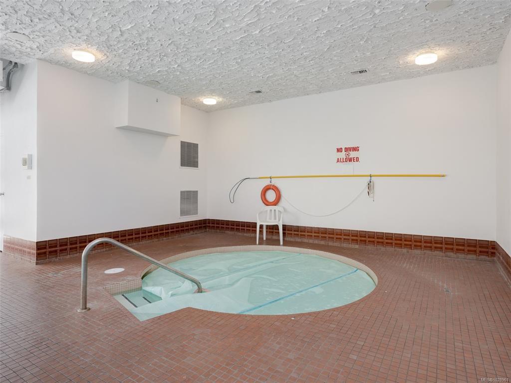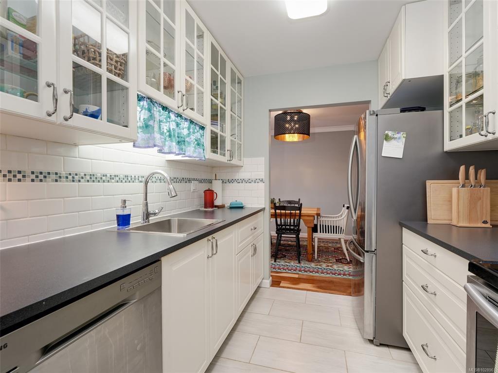 Feel the peacefulness of this private and spacious 1 Bedroom home that overlooks the beautiful landscaped courtyard gardens from its expansive patio. More spacious than many 2 bedrooms and NOT ON GROUND LEVEL. This home is in a prime location within a highly desirable building. It is ideal for those who value privacy, quiet, and generous space. Tastefully updated with a sleek kitchen offering glass-front cabinetry, stainless-steel appliances & engineered hardwood flooring. The Stadacona Centre is a well-managed complex within easy walking distance to Downtown, Oak Bay Village, the Dallas Road waterfront, Royal Jubilee Hospital, parks, tennis, Craigdarroch Castle, Government House & conveniently located en route to Camosun, UVIC & more. Building amenities include indoor pool, sauna, hot tub, gym, library/office, workshop, EV charging, meeting and games room. Parking & storage included. Enjoy comfort, privacy, convenience & nearby amenities. This home is a MUST SEE!