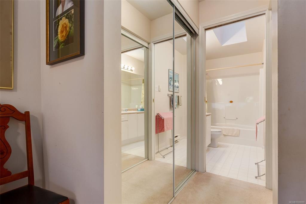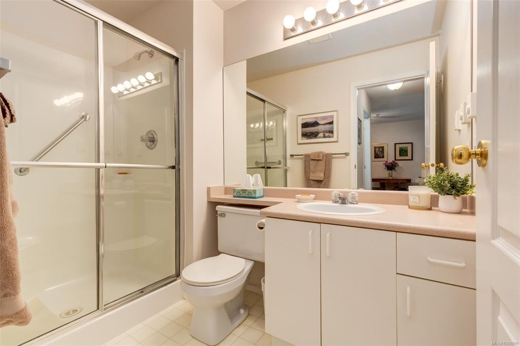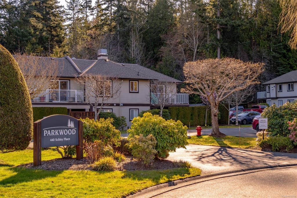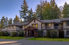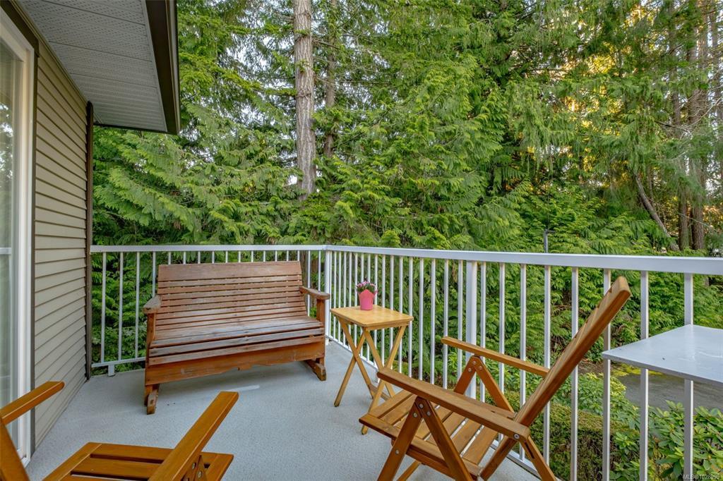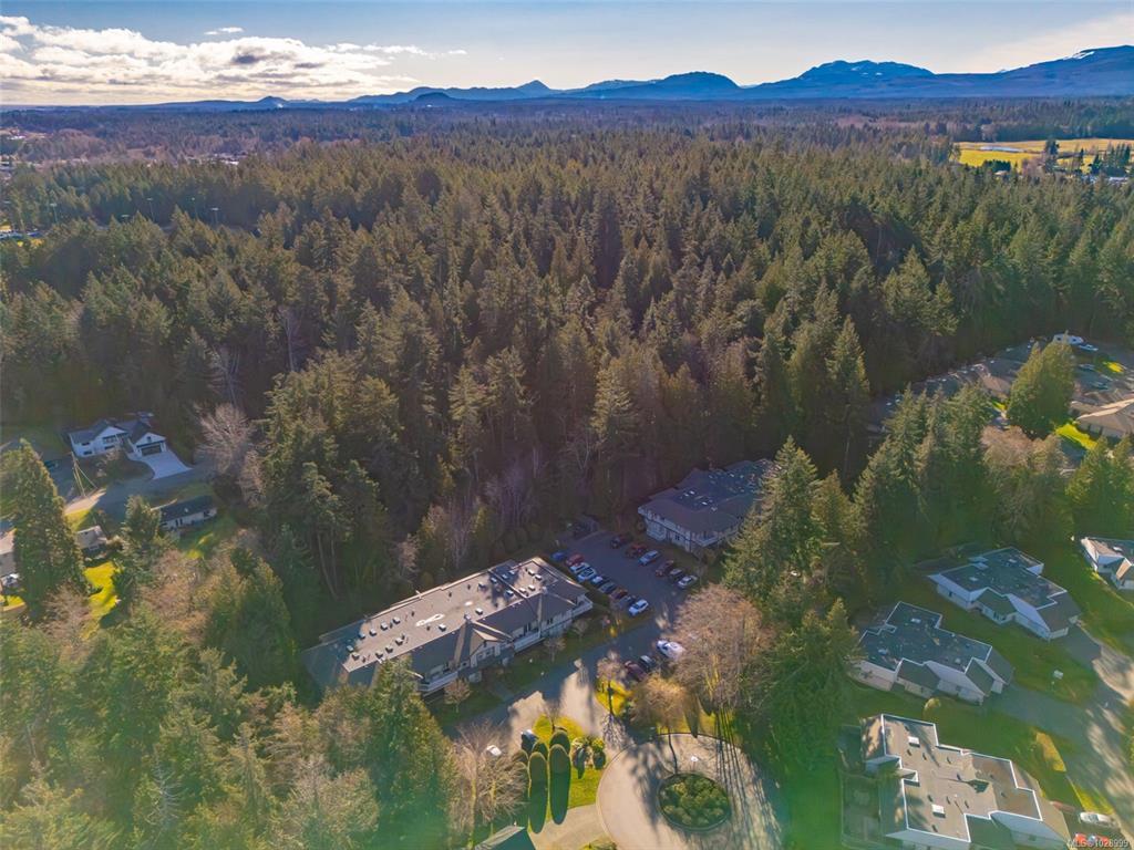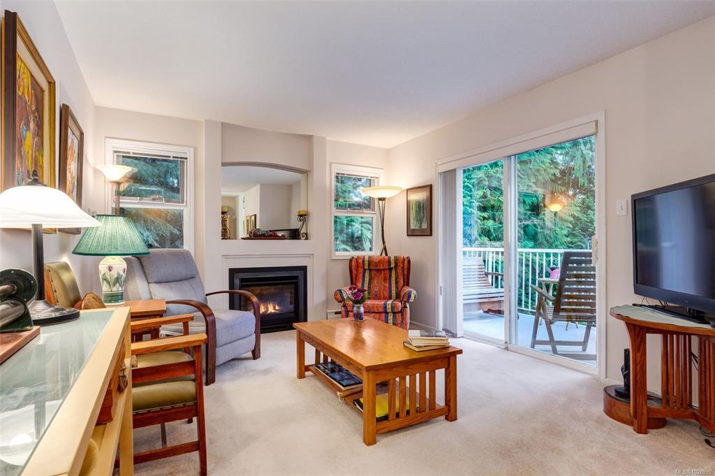 Welcome to Parkwood! This well-maintained, top-floor corner unit offers unmatched privacy and a bright, airy interior bathed in natural light from skylights. The spacious 2-bedroom, 2-bathroom layout features a cozy living area with a natural gas fireplace and a primary suite complete with a walk-through closet and ensuite. Enjoy ultimate peace of mind with a brand-new hot water tank, alongside the convenience of in-suite laundry, a large storage locker, and a private balcony overlooking lush gardens and mature trees. Perfectly situated in a highly desirable, well-managed building that provides secure entry and elevator access near bus routes, you are just steps from the Ravensong Wood trails leading directly to the village for shopping, dining, and the aquatic centre, or a short, easy stroll to the ocean. Ample resident and visitor parking is available; please verify all data and measurements if important to the purchase.