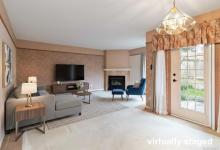 French doors open to a private garden with a flagstone patio, irrigated perennial borders, and mature trees—a rare find in townhouse living.
