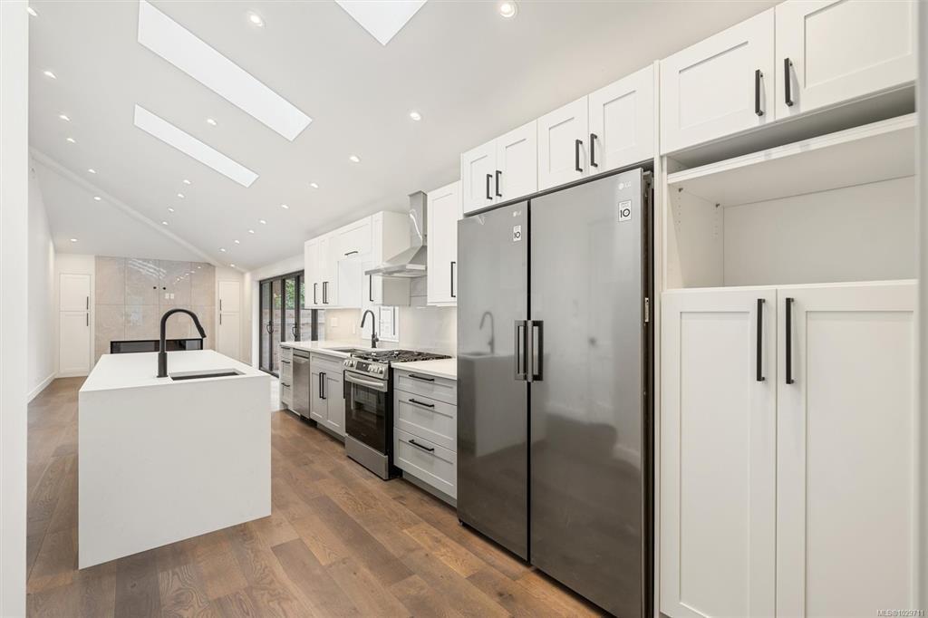 Discover modern luxury at 5281 Santa Clara Ave in sought-after Cordova Bay. This fully renovated home on a large private lot blends high-end finishes with flexible living. Features include: Gorgeous wide-plank wood flooring throughout, multi zone heating & air conditioning, heated floors, Two gourmet kitchens, sound insulated walls and floors, Sun-drenched private deck overlooking peaceful surroundings, Gas fireplace, 12 foot vaulted ceilings, black hardware, and custom cabinetry. Bright, open layout offers multiple bedroom/office options plus expansive outdoor space. Step into pure modern elegance with this completely reimagined home that delivers wow-factor at every turn. Move-in ready with quality updates from top to bottom.