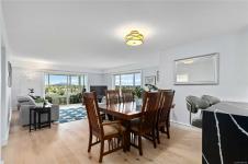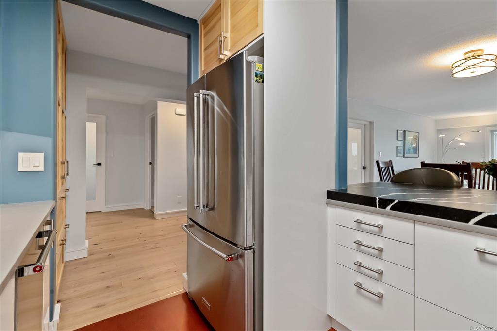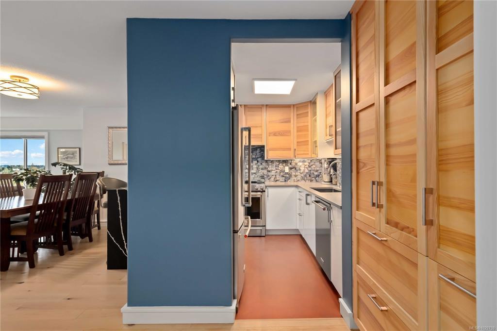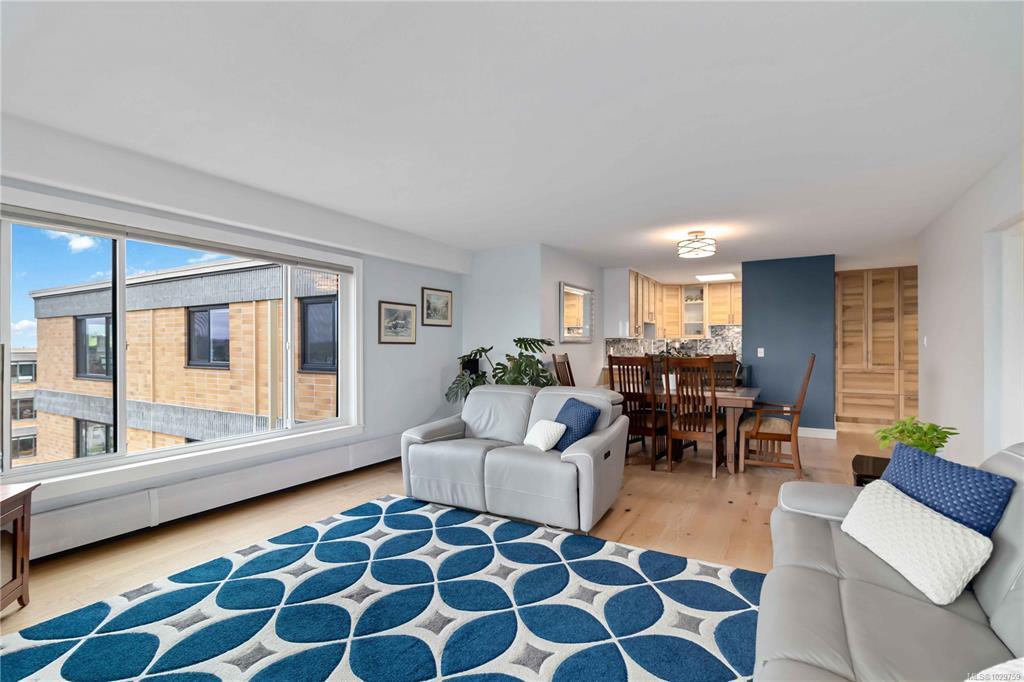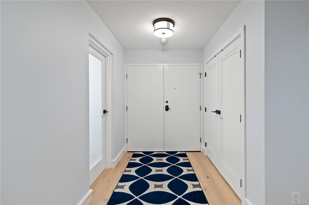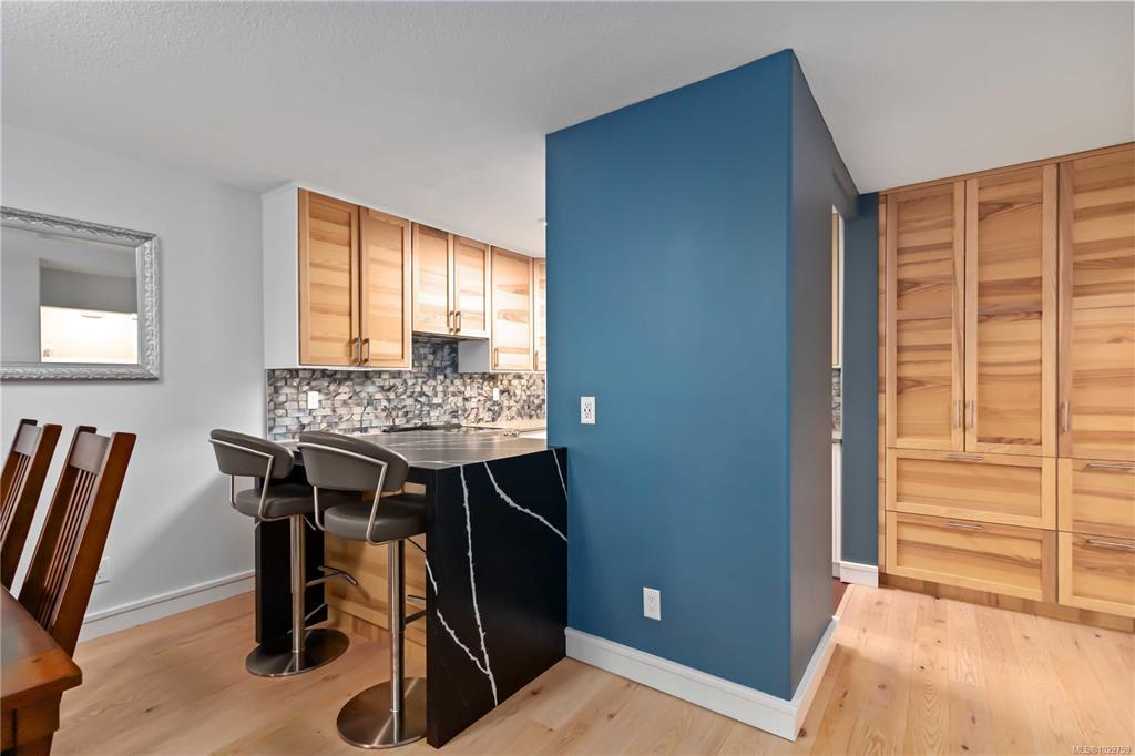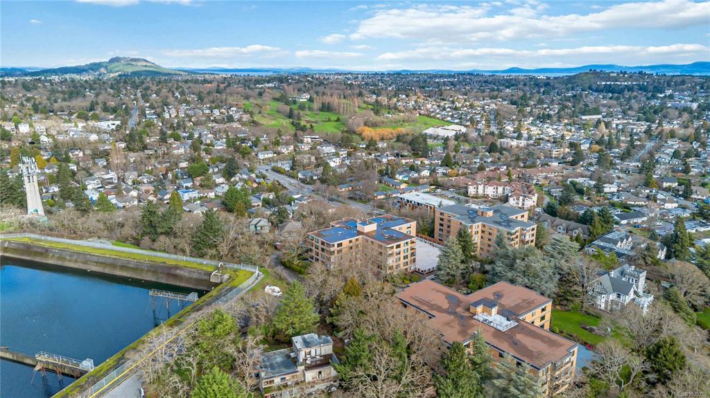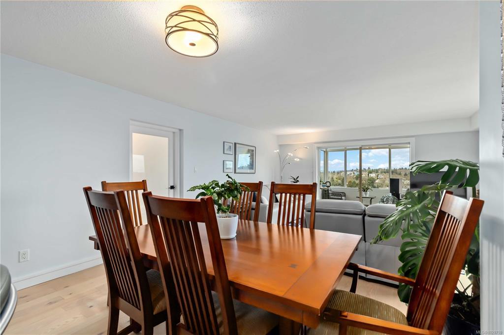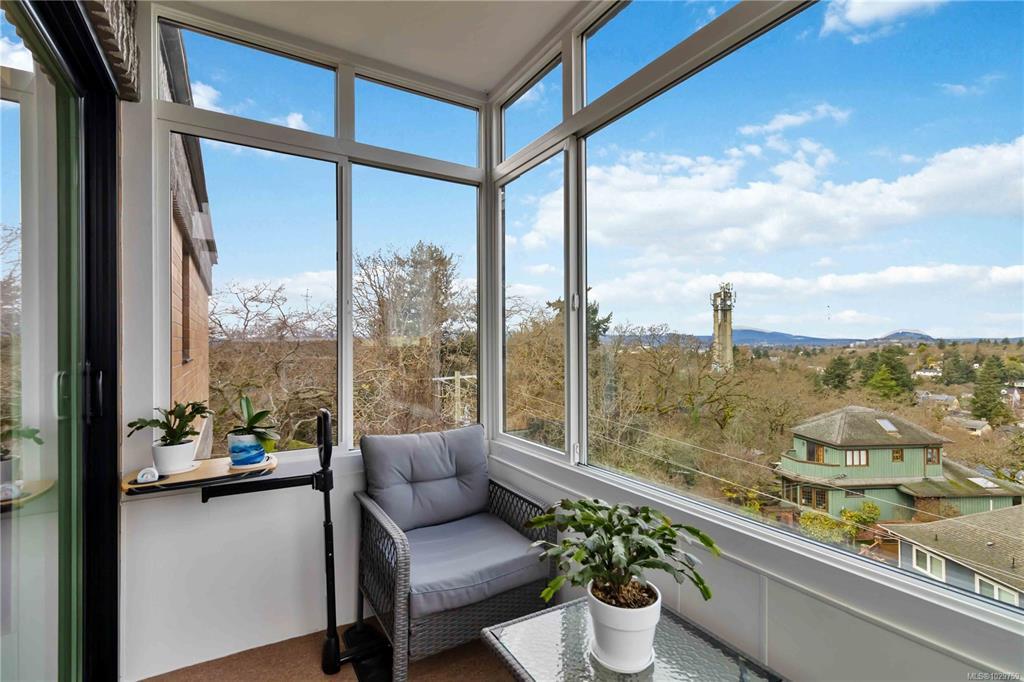 Discover a stunning top-floor residence with breathtaking city & mountain views. Recently renovated, it features soft-close millwork, SS appliances, & quartz countertops. Enjoy beautiful oak flooring, luxurious wool carpets, & new energy-efficient windows throughout. The spacious open layout connects the kitchen, living, & dining areas, perfect for entertaining. The primary suite includes a generous walk-in closet & an updated 4-piece ensuite. Additional highlights include a modern guest bath & a versatile solid mahogany wall-bed. Relax in the enclosed balcony while soaking in the views, or explore the surrounding treed area that will not be developed, offering a serene natural escape. Take a leisurely stroll to nearby Summit Park, where waterfowl & birdlife thrive. Centrally located, this gem is minutes from downtown, dining, & Victoria's attractions. The well-maintained steel & concrete building offers secure parking, an indoor pool, sauna, & beautifully landscaped grounds.