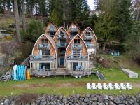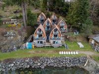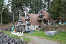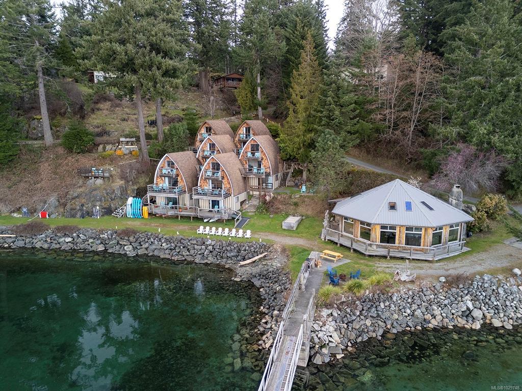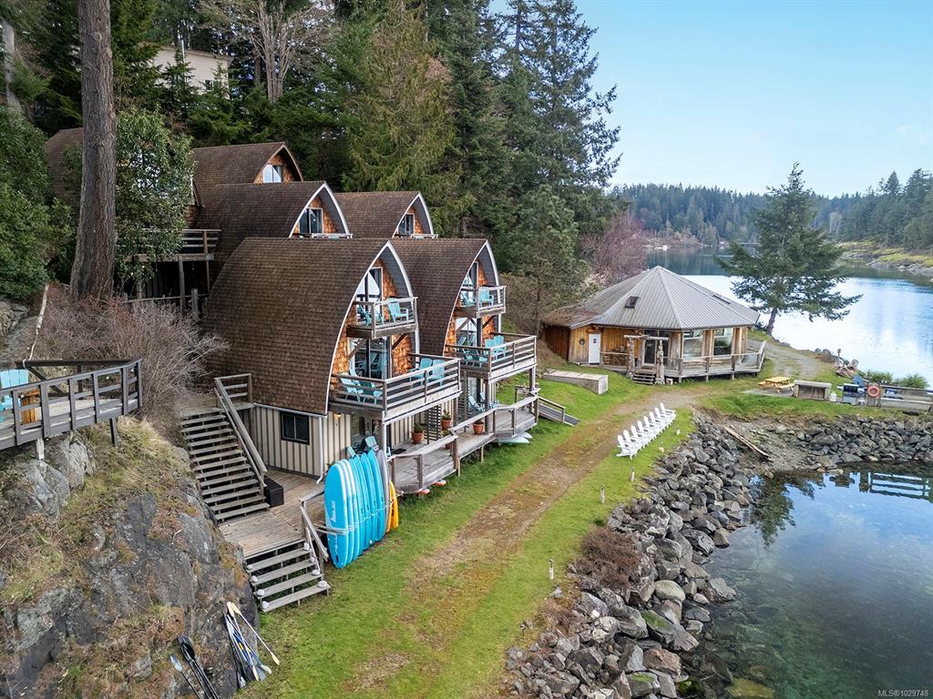 Rare opportunity to acquire an oceanfront hospitality property in Gowlland Harbour on the protected west side of Quadra Island, just a 10 minute ferry ride from Campbell River. Set on just over 2 acres with more than 490 feet of ocean frontage, the property features 6 distinctive cathedral arch chalets containing 11 accommodation suites, each positioned to capture stunning harbour views. Improvements include a 1,800 sq ft log pavilion; 1,220 sq ft workshop with loft studio; a 2,000 sq ft main residence with 4 bedrooms plus an office; and a separate 2 bedroom guest cabin. In total the property offers approximately 9,753 sq ft of finished space with 16 bedrooms and 16 bathrooms. The protected deep water marina and potential for a 600 foot dock provide an estimated 1,000 feet of moorage, making this an exceptional marine access property. Zoned C-2 commercial, the property offers potential for tourism & related commercial uses. Property is currently tenanted; viewings subject to tenancy.