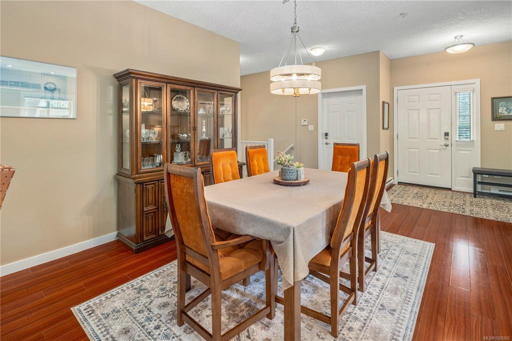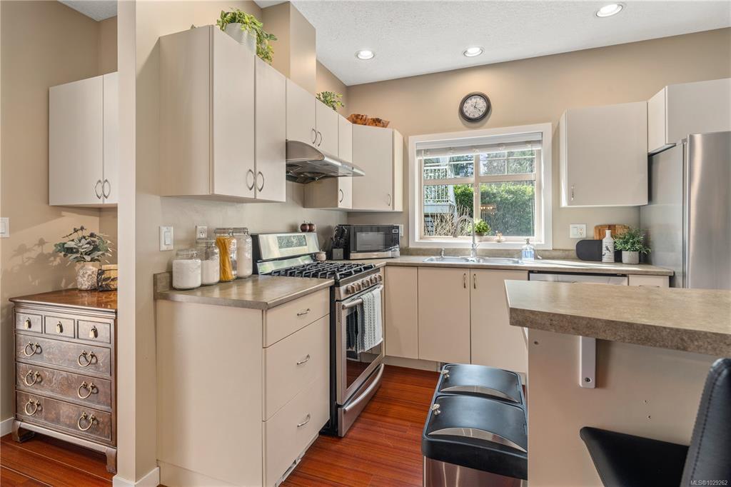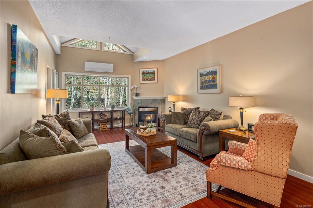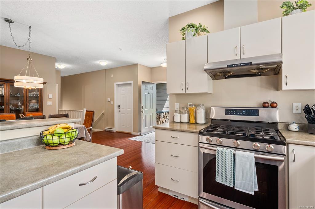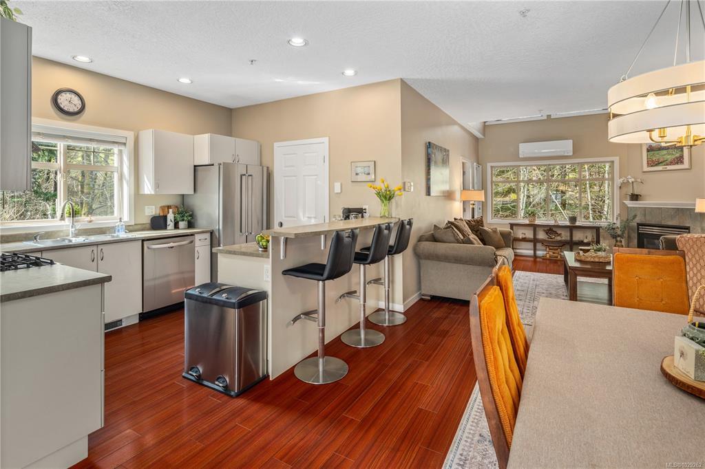 Bright, spacious and open, this fantastic end-unit townhouse, in one of Bear Mountain’s most desirable neighbourhoods, is just moments from the golf course and resort. Just under 2,500 sq ft, this open concept plan features living room with vaulted ceilings, gas fireplace and deck that overlooks the private backyard. Kitchen with newer stainless appliances, gas range, peninsula/breakfast bar, walk in pantry plus formal dining area. Large main floor primary suite with 4 pc bath and walk-in closet plus 2nd bdrm/home office. Down you’ll find a games/family rm, exercise area, and 2 additional bdrms (4th has no closet) perfect for teens. Walk-out access to patio and private yard to enjoy summer afternoons. Bonus heat pump offers year round comfort. Double garage provides parking and room for storage. 2 pets permitted. This is a quiet, well kept strata, close to walking trails, schools, and amenities.