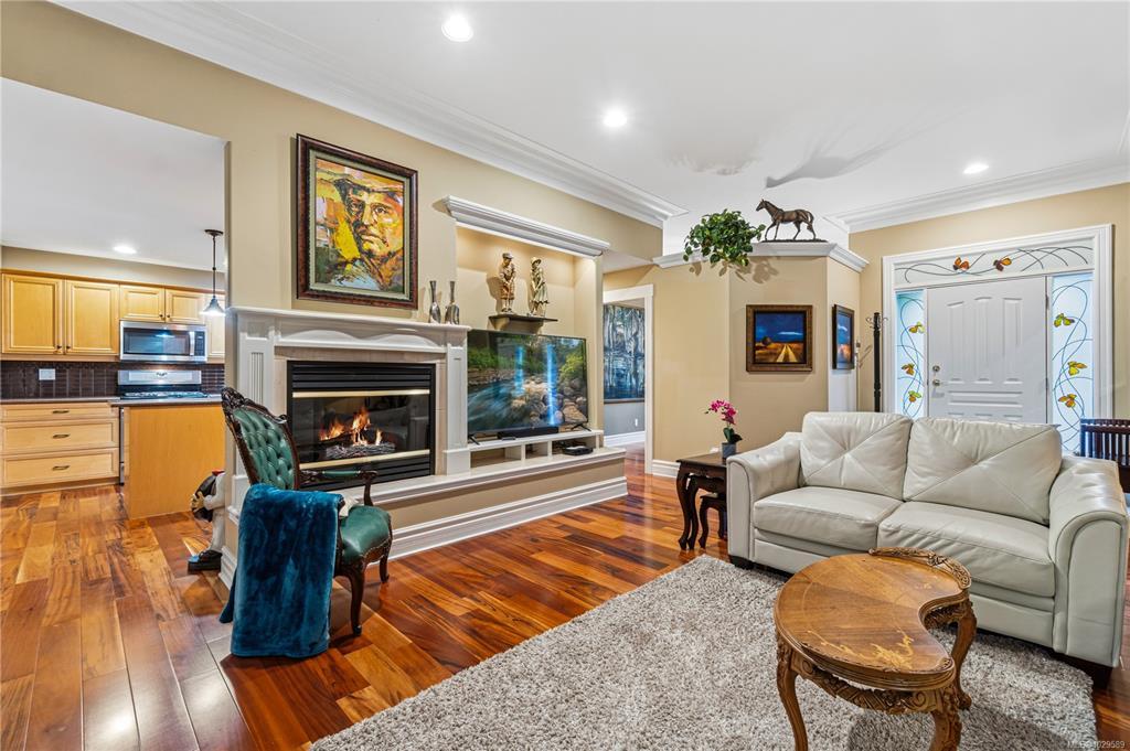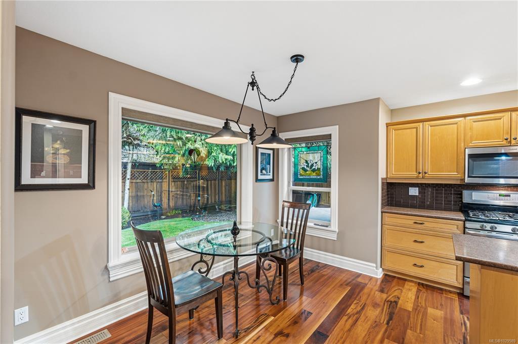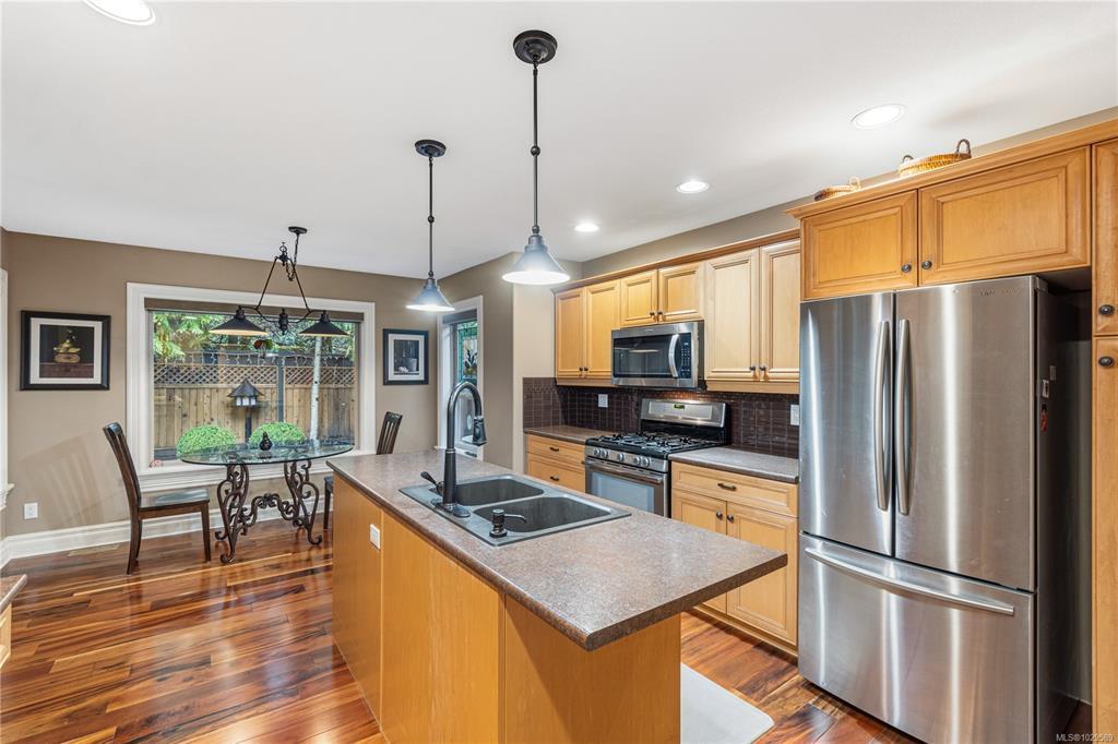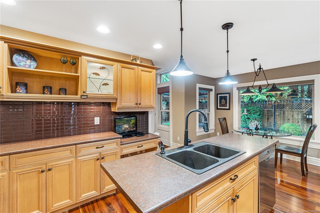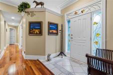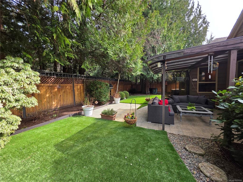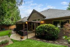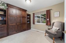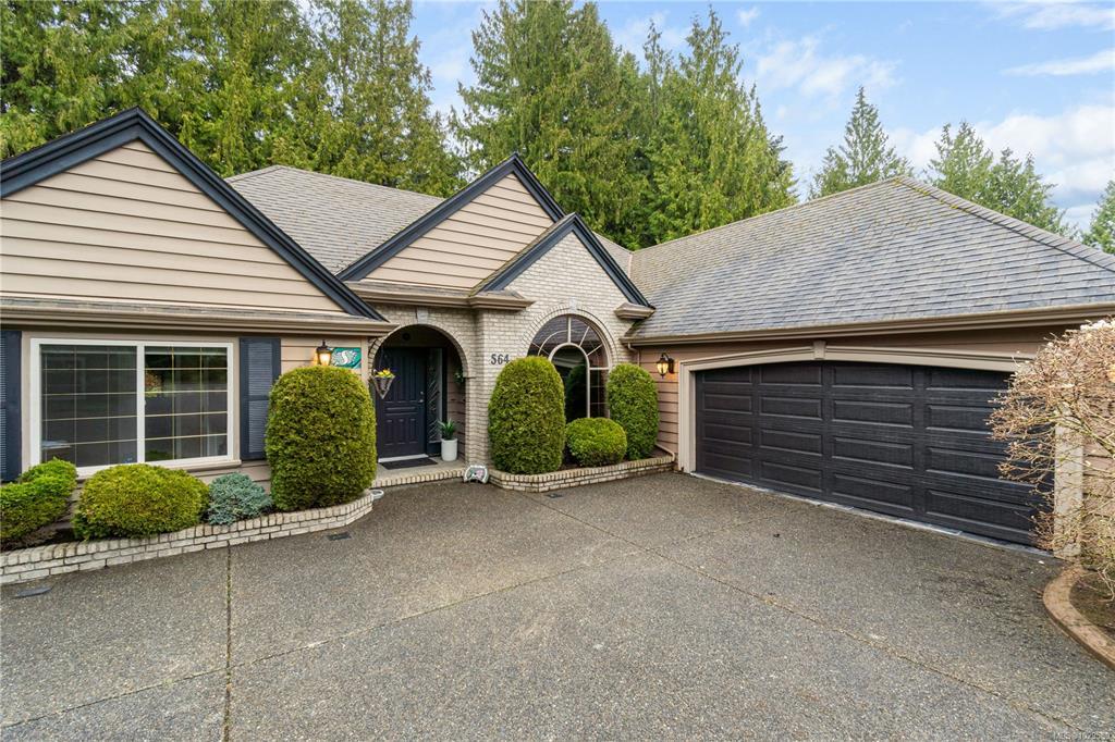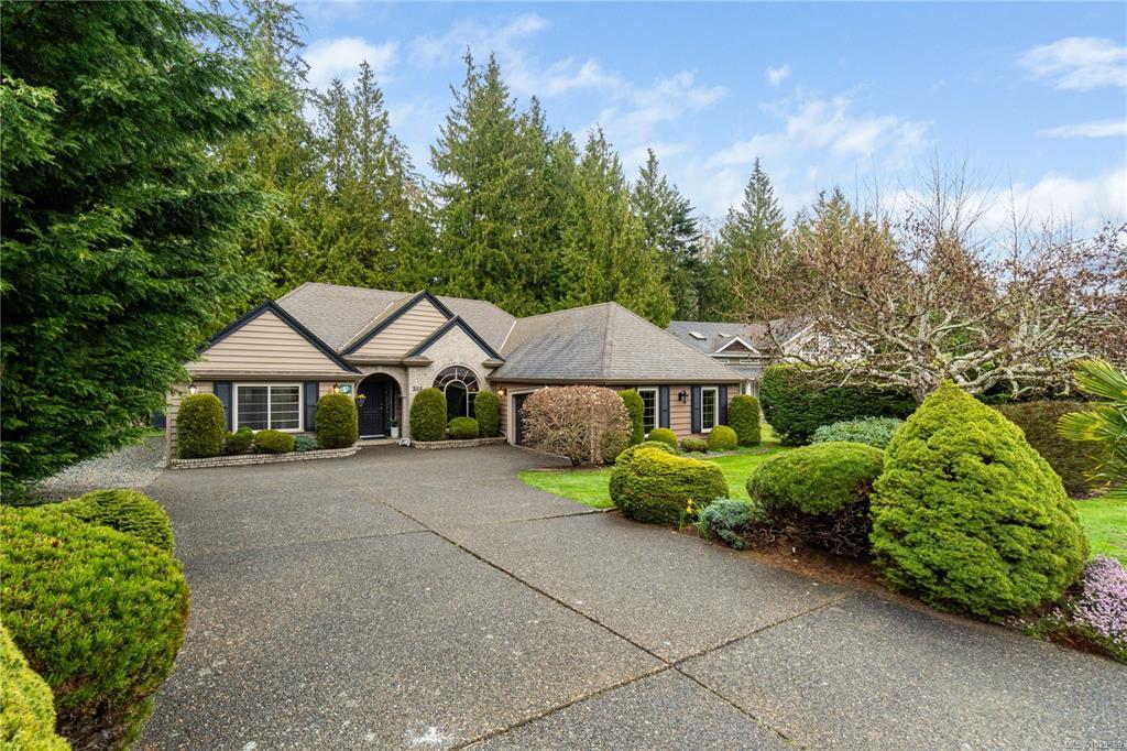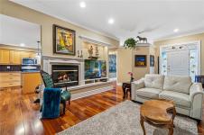 This 1750 sq. ft. rancher is tucked away in a quiet cul-de-sac in the lovely Evergreens subdivision. The bright kitchen features an eating area, island, pantry, under-cabinet lighting, hardwood flooring, glass backsplash, gas stovetop, Stainless steel appliances, plus decorative cabinet glass. The park-like backyard backs onto green space for added privacy. Inside, there’s a separate dining room with French doors, a great room with a gas fireplace, 10 ft. ceilings with detailed molding, and dual doors to a private glass covered patio. The home offers 2 bedrooms with cheater access to their own bath, There's also a guest bath and a spacious primary en-suite with tile flooring, soaker tub, large separate shower, and his-and-hers walk-in closets. The home features newer custom window coverings, and a newer hot water tank. The well-kept yard has in-ground sprinklers, concrete curbing for easy maintenance, RV parking, and a 14 x 6 detached shed. This home is truly move-in ready.