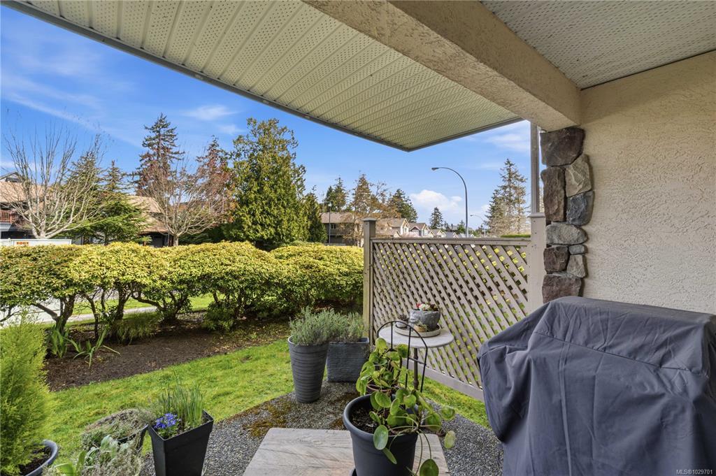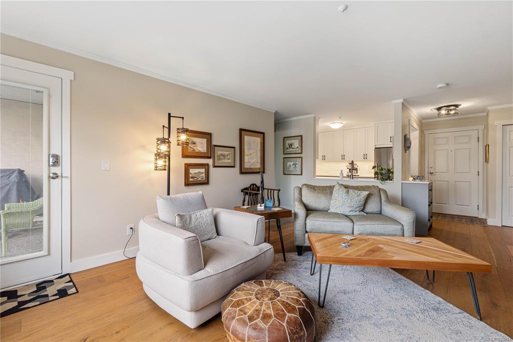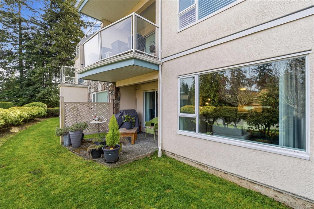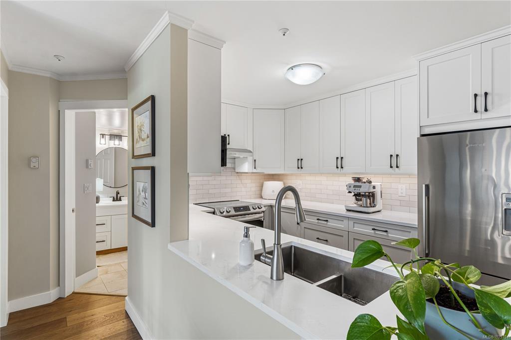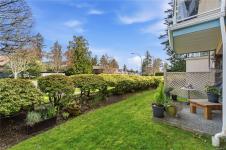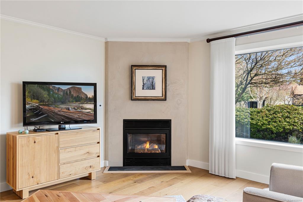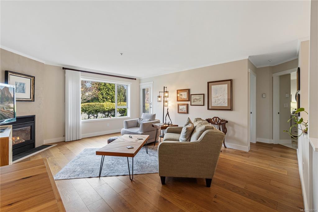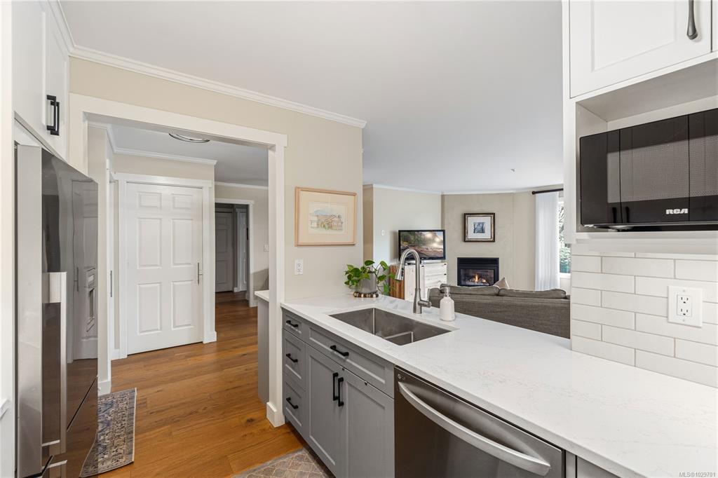 Bright, modern, and move-in ready ground-floor condo in desirable Rocky Point! This beautiful 2 bed, 2 bath home features bedrooms on opposite sides for privacy. Updated kitchen with newer Fisher & Paykel fridge and new stove/oven, plus new flooring, light fixtures, and gas fireplace surround. Large windows bring in abundant natural light throughout the home. Enjoy a private patio with hedging and flowers—perfect for relaxing. Spacious primary bedroom offers two double closets and an ensuite, while the second bedroom or den includes built-in shelving and sliding doors to the patio. In-unit laundry with storage. Quiet, well-maintained building with a healthy strata. No age restrictions, most rentals allowed, some pets permitted (see bylaws). Covered parking, extra spot for fee. Bike room, utility room and storage locker near the unit. Walk to several parks, incl. Neck Point, 2 schools, and the ocean—a perfect blend of low-maintenance living and coastal lifestyle. A must see - book NOW!