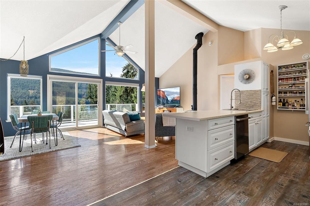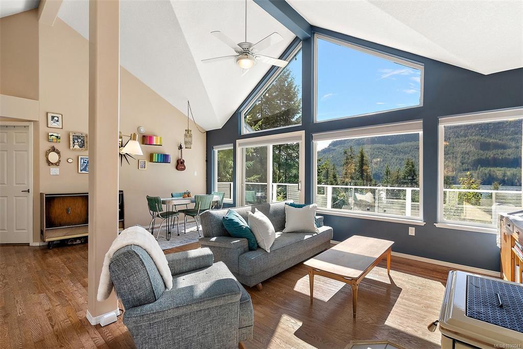 Welcome to this exceptional West Coast retreat set on 1.4 acres of private, forested land overlooking the beauty of Lake Cowichan. Designed for both lifestyle and versatility,this rare offering features three distinct spaces, creating an elevated opportunity for multi-generational living or curated income potential.The main residence is filled with natural light, showcasing expansive windows that frame stunning lake views. With 2 bedrooms and 1.5 bathrooms, the home flows seamlessly onto a breathtaking wraparound deck complete with a swim spa—an ideal setting for refined outdoor living.A detached studio adds a layer of flexibility, offering a 1-bedroom suite above with a dedicated office and playroom below—perfect for guests, extended family, or short-term rental.The impressive two-bay shop with loft space is a standout feature, ideal for collectors,or hobbyists.Surrounded by nature and just moments from the lake, this is a property that effortlessly blends privacy and possibility.