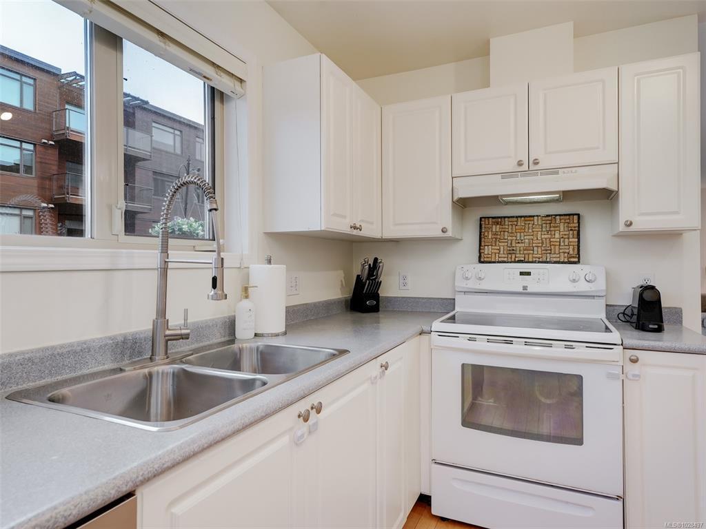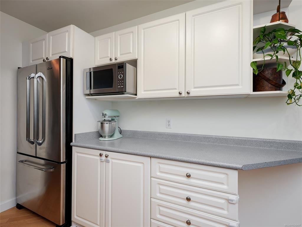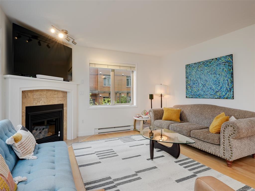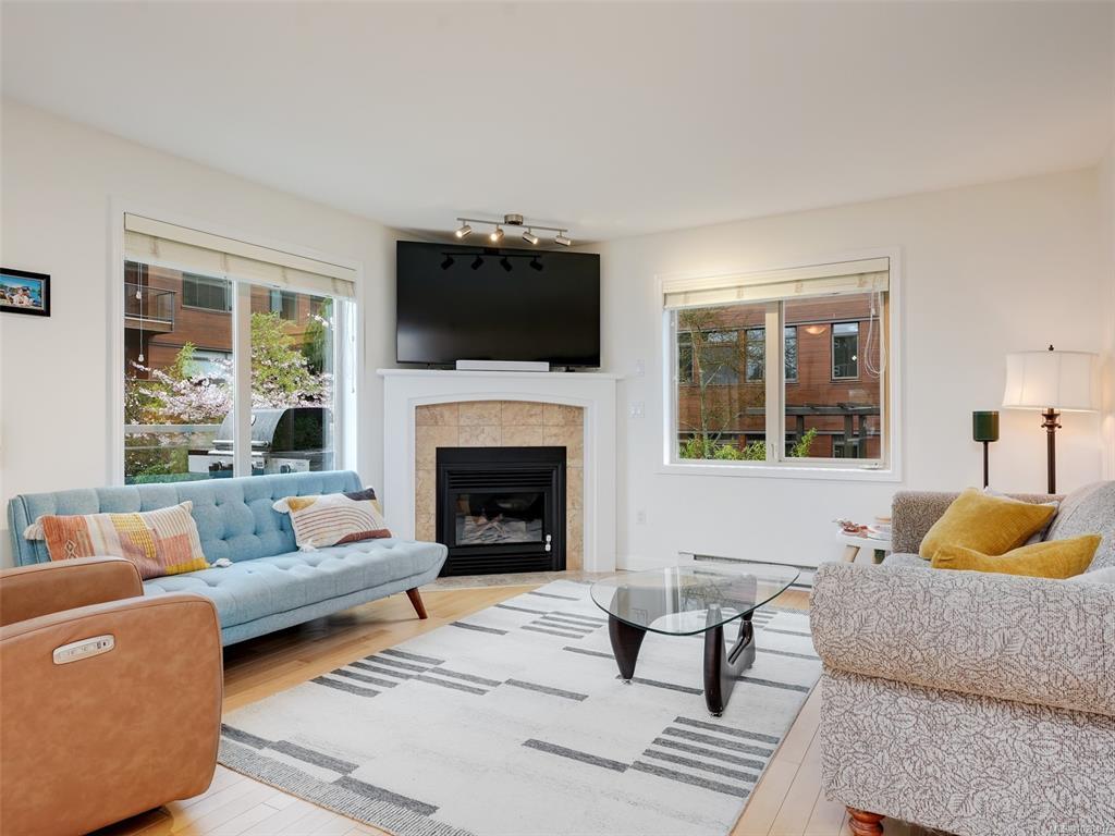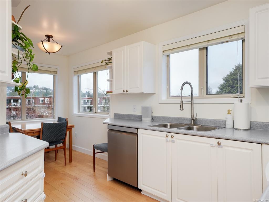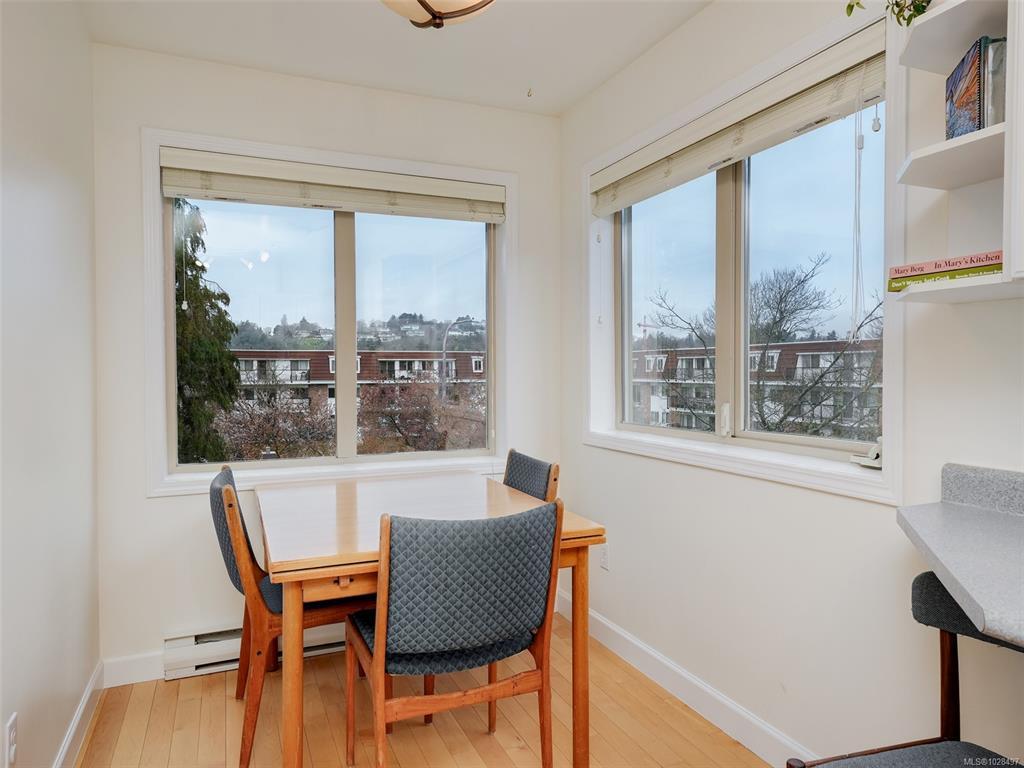 Open House Saturday 1-3. Location, location, location! Welcome to this bright and spacious 3rd-floor end unit in the highly sought-after Mt Tolmie neighbourhood, just steps from UVic & Camosun College. Offering 1,088 sq ft of thoughtfully designed living space, this home is filled with natural light thanks to its large windows and light finishes. The open-concept living and dining area features a cozy gas fireplace and opens to a spacious balcony—perfect for relaxing or summer BBQs. The kitchen offers ample space with a bonus eating nook with windows. You'll love the hardwood floors throughout and the well-planned layout provides excellent separation between the two bedrooms, ideal for privacy. The generous primary suite includes a large walk-in closet and a 3-piece ensuite with glass shower. In-suite laundry behind modern barn doors, secure underground parking and separate storage included. Set in a well-maintained building close to parks, trails, shopping, and amenities.