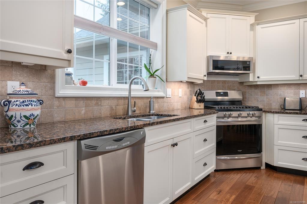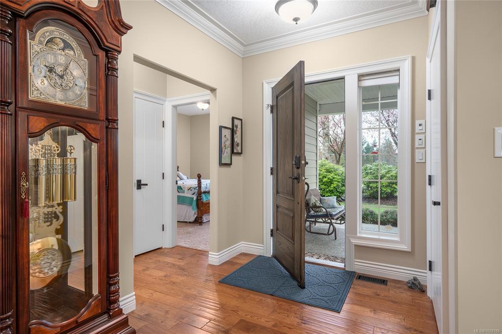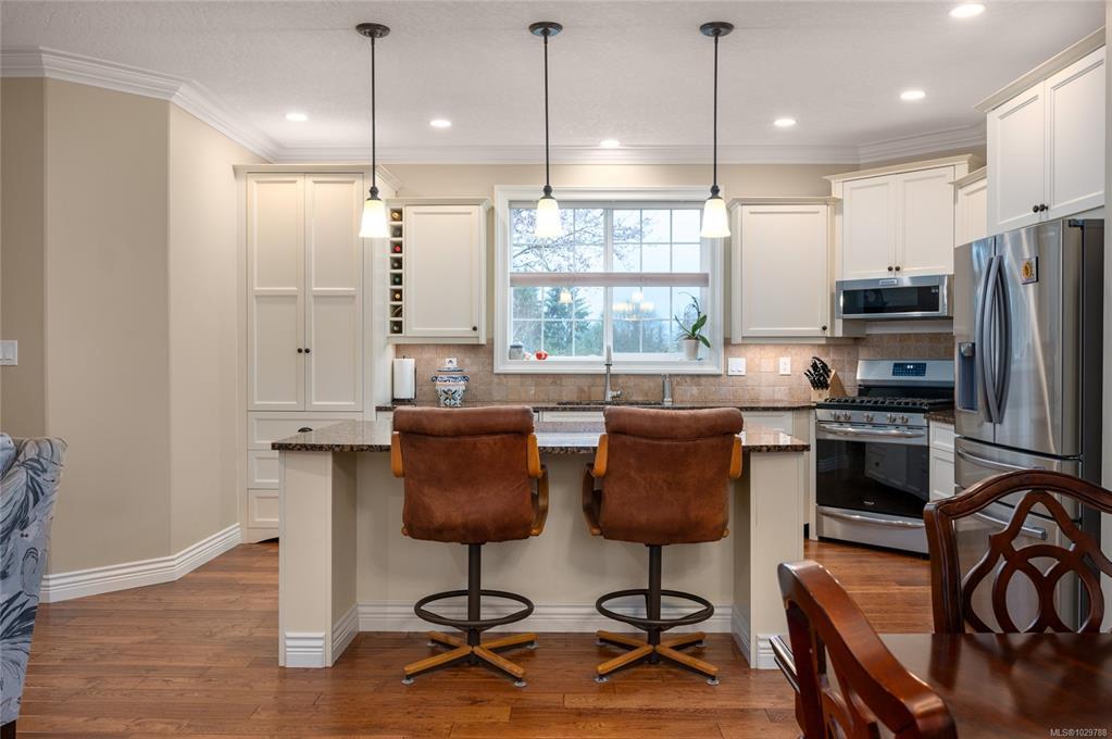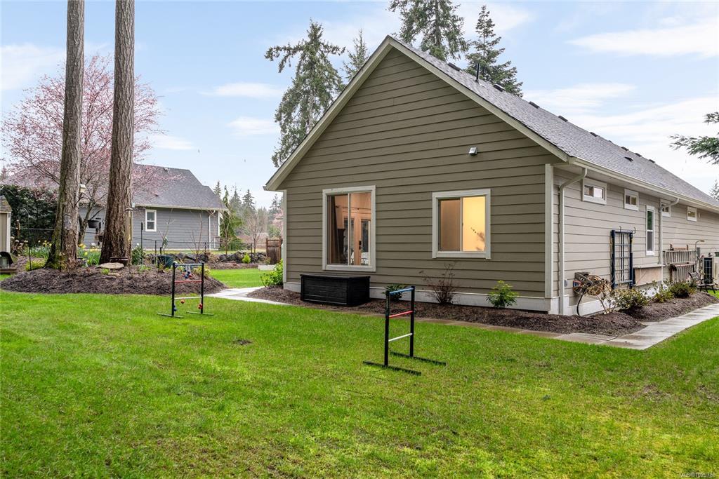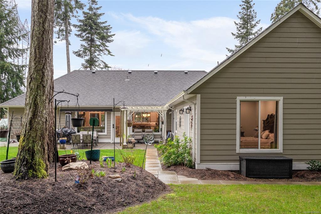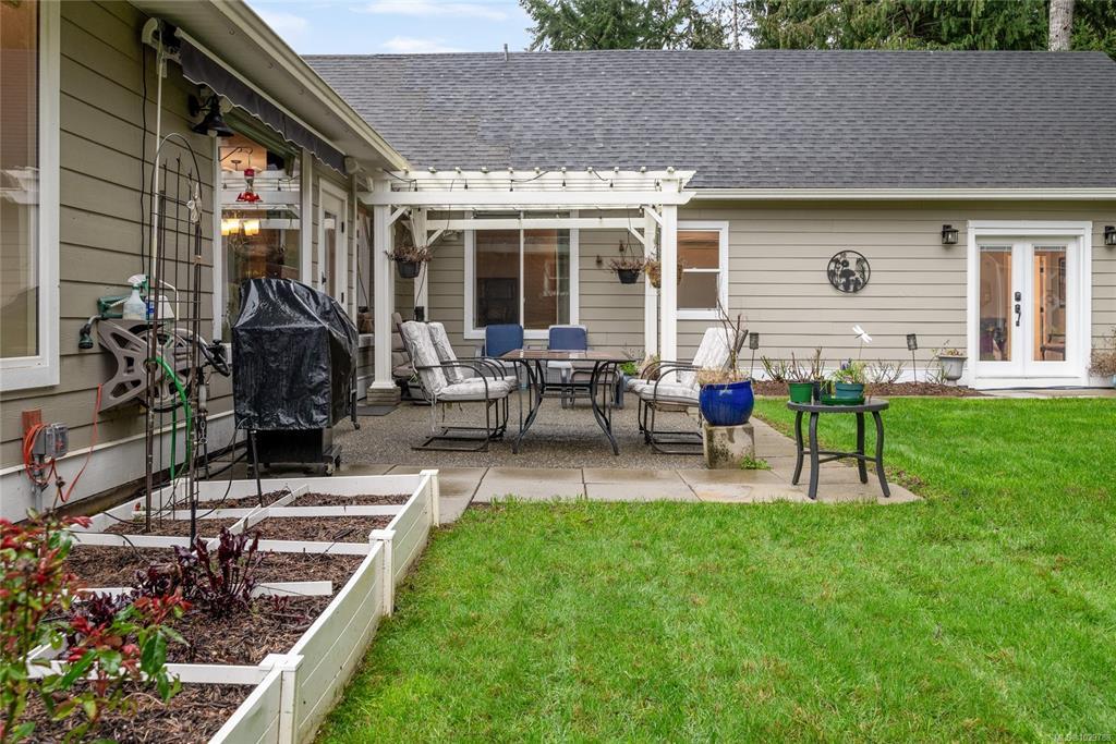 Welcome to Nile Landing—where refined country living meets coastal charm. This exquisite 3-bed, 3-bath & family room executive rancher spans over 2,296 sqft of thoughtfully curated elegance, showcasing soaring 9’ ceilings, crown moulding, & a seamless open-concept design. The chef-inspired kitchen dazzles w/quartz counters, gas fireplace range & s/s appliances, flowing effortlessly into a grand dining space & sunlit living room with picturesque views of the lush, private yard. Retreat to the luxurious primary suite, walk-in closet,& spa-like ensuite. Two other sizeable bedrms, a 4-pc bath, & a laundry rm with a sink complete the well-laid-out floor plan. Outdoor space is beautifully maintained & has a charming patio area-great for BBQing! Bonuses:h/pump, tons of storage, generator, pergola & garden shed. Outdoors, a beautifully landscaped sanctuary awaits, backing onto the serene Nile Creek Trail, just moments from the beach, marina & a short drive to Qualicum Beach & Bowser amenities.