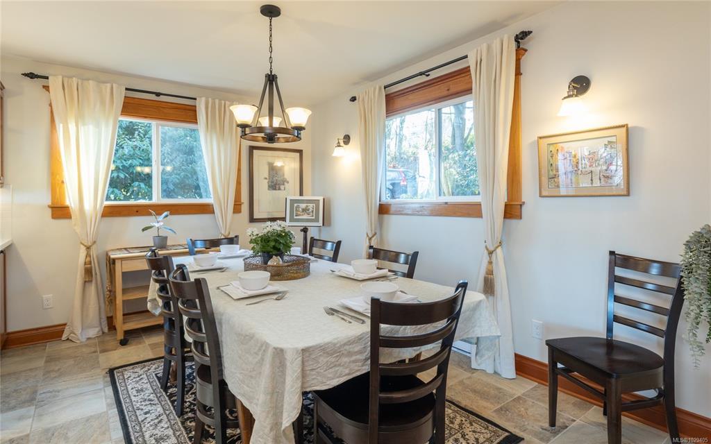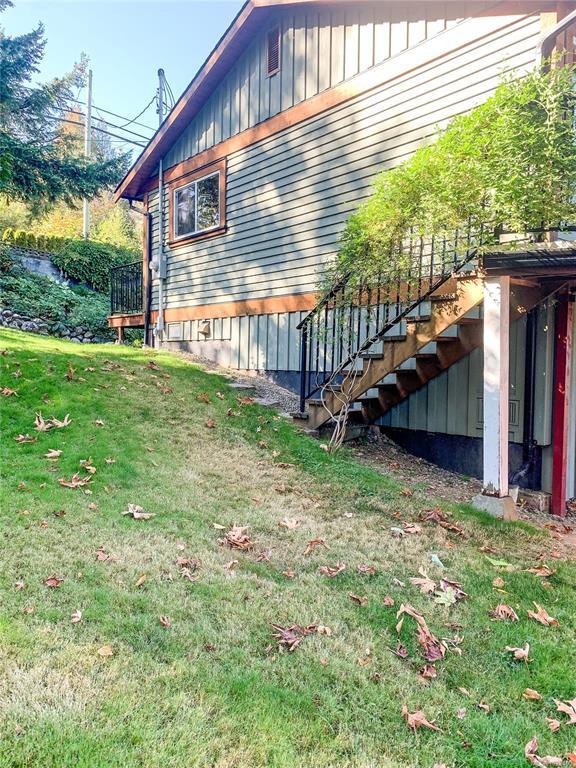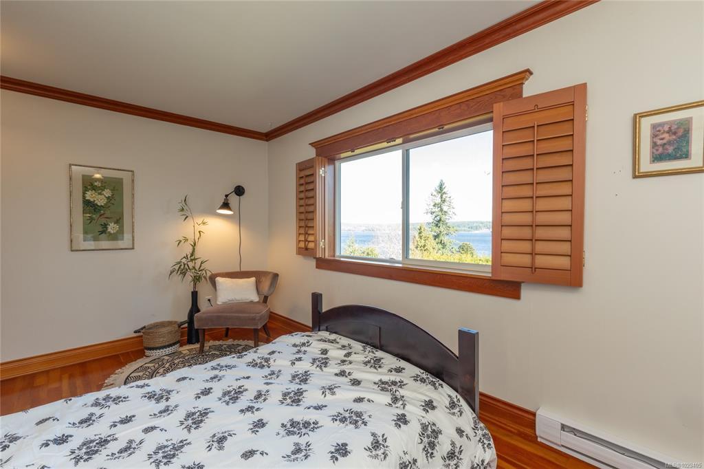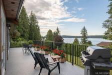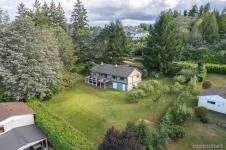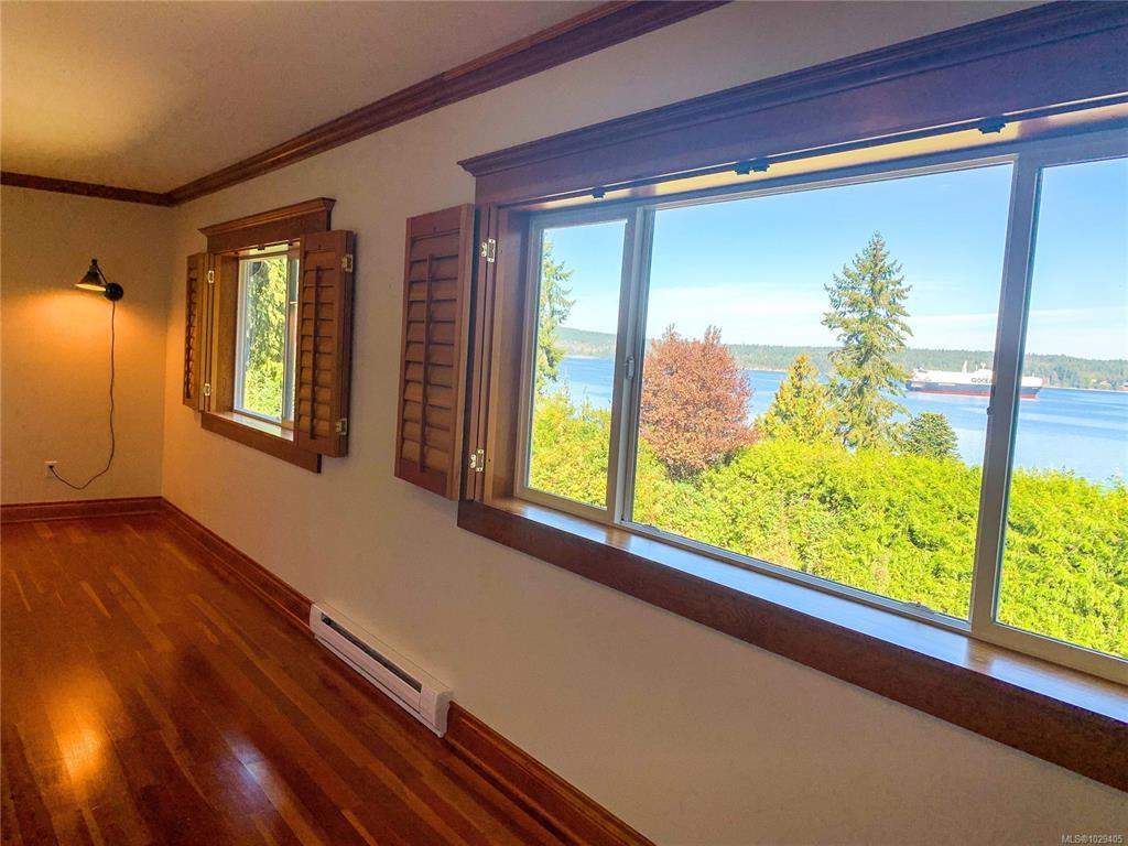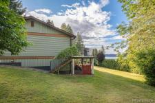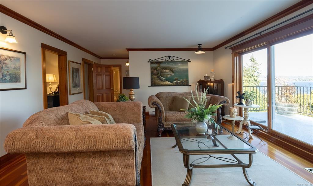 Stunning ocean views and refined craftsmanship define this beautifully renovated home just south of Ladysmith, overlooking the Stuart Channel. Rich wood accents, hardwood flooring, and custom finishes create a warm yet elevated feel throughout. The main level opens to a bright living space with a feature fireplace and expansive views, flowing into a thoughtfully designed kitchen with quartz counters, apron sink, and quality cabinetry. Indoor and outdoor living connect seamlessly, with a rear deck ideal for morning coffee or evening entertaining surrounded by mature landscaping and fruit trees. The spacious primary suite offers a walk in closet and ensuite, complemented by a den or office on the main. The walk out lower level provides additional living space, bedroom, and versatility for hobbies or guests. A forested path to nearby beach access completes this exceptional West Coast lifestyle.
