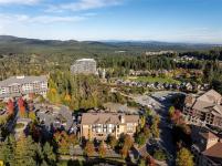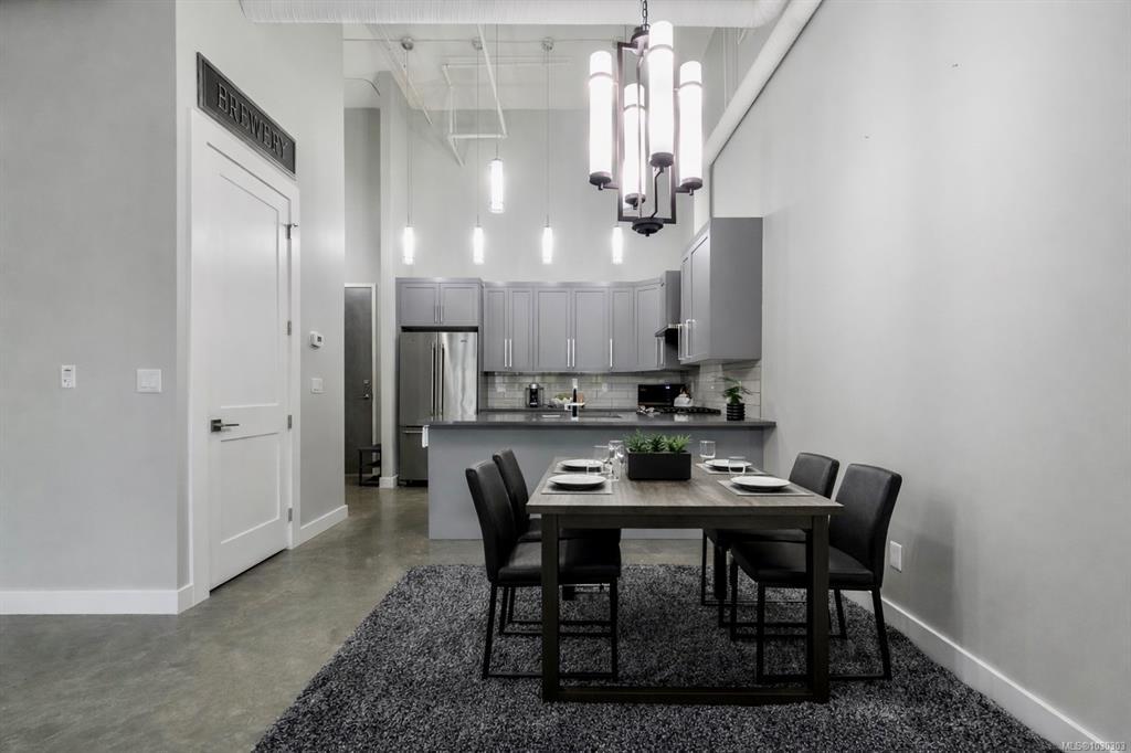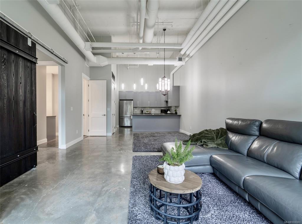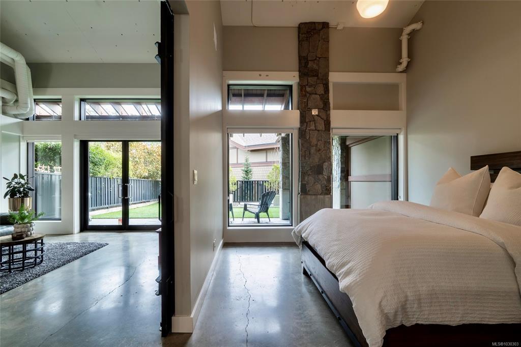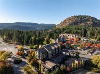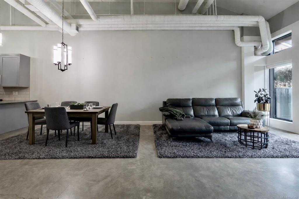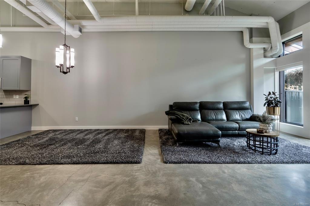 THE LOFTS AT BEAR MOUNTAIN! Prestigious residences in a steel and concrete building originally quality-built for commercial use. This industrial-chic, 1 bed + den home offers 1,000+ sqft of contemporary living with soaring 14-foot ceilings, floor to ceiling windows, polished concrete floors and a bright, open layout. A sleek kitchen complete with quartz countertops, gas range, high-end stainless appliances, oversized double sink, stylish shaker cabinets and high top bar. Revel in a spa-inspired bathroom with heated floors, dual sinks, separate water closet and spacious walk-in shower. Double doors lead to a massive, private backyard perfect for indoor/outdoor entertaining. Additional highlights include a heat pump, secure underground parking, storage locker and pet-friendly with no size limit. Steps from world-class golfing, a fitness centre with heated outdoor pool, Jack's Place and the Westin Resort. Discover an unbeatable lifestyle in a one-of-a-kind building; a truly rare offering.