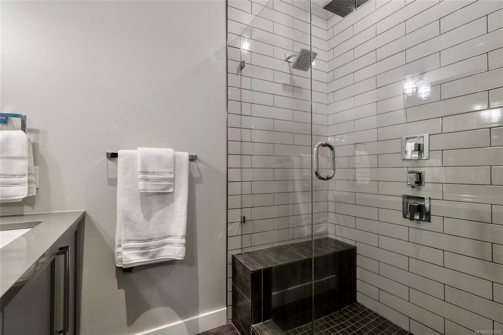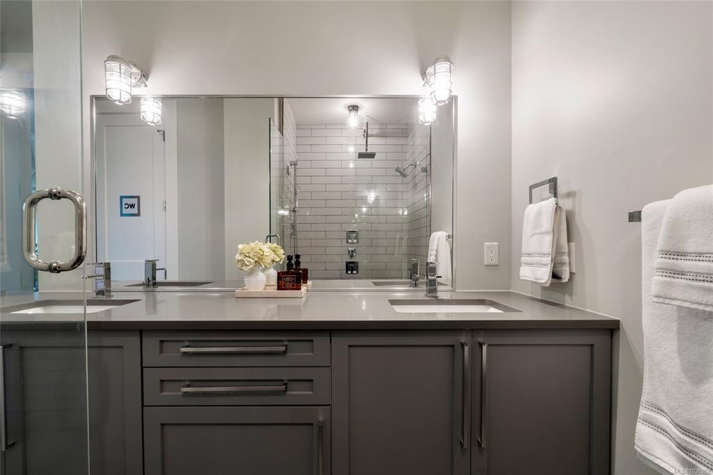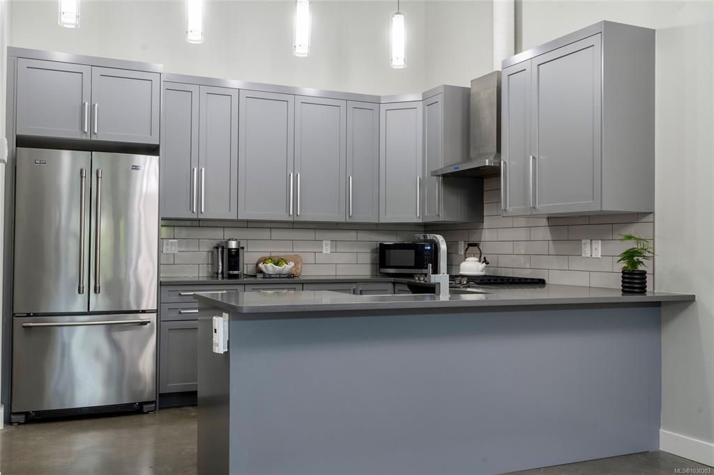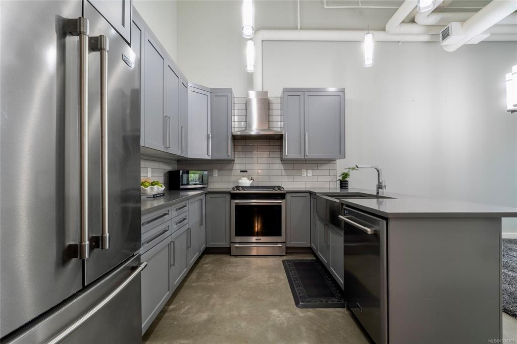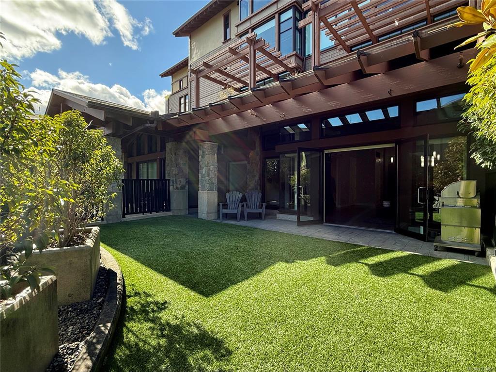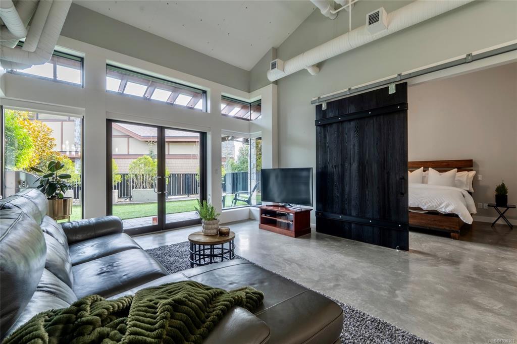 THE LOFTS AT BEAR MOUNTAIN! Prestigious residences in a steel and concrete building originally quality-built for commercial use. This industrial-chic, 1 bed + den home offers 1,000+ sqft of contemporary living with soaring 14-foot ceilings, floor to ceiling windows, polished concrete floors and a bright, open layout. A sleek kitchen complete with quartz countertops, gas range, high-end stainless appliances, oversized double sink, stylish shaker cabinets and high top bar. Revel in a spa-inspired bathroom with heated floors, dual sinks, separate water closet and spacious walk-in shower. Double doors lead to a massive, private backyard perfect for indoor/outdoor entertaining. Additional highlights include a heat pump, secure underground parking, storage locker and pet-friendly with no size limit. Steps from world-class golfing, a fitness centre with heated outdoor pool, Jack's Place and the Westin Resort. Discover an unbeatable lifestyle in a one-of-a-kind building; a truly rare offering.
