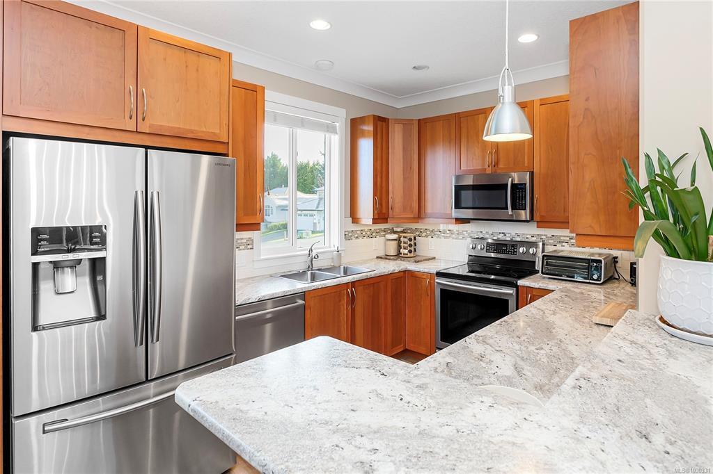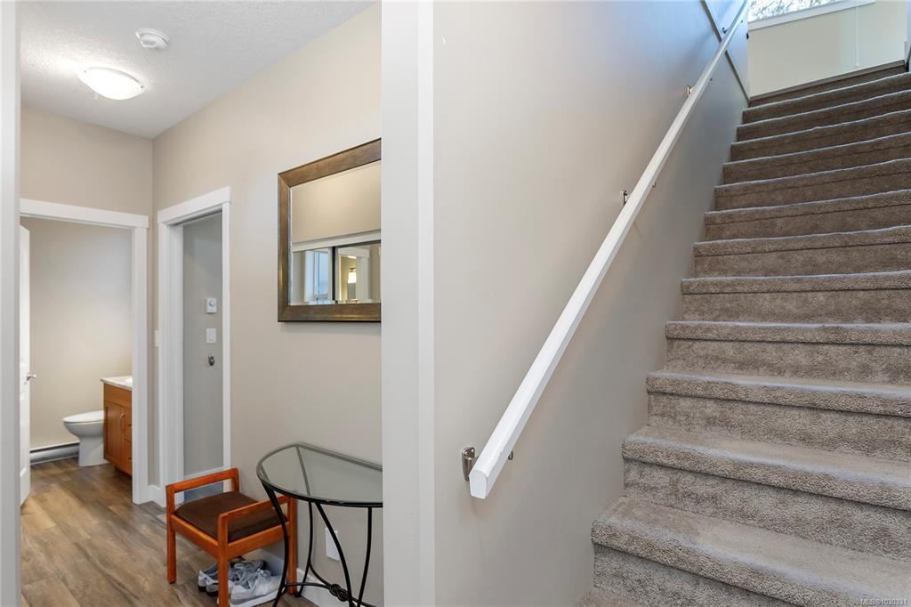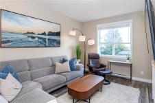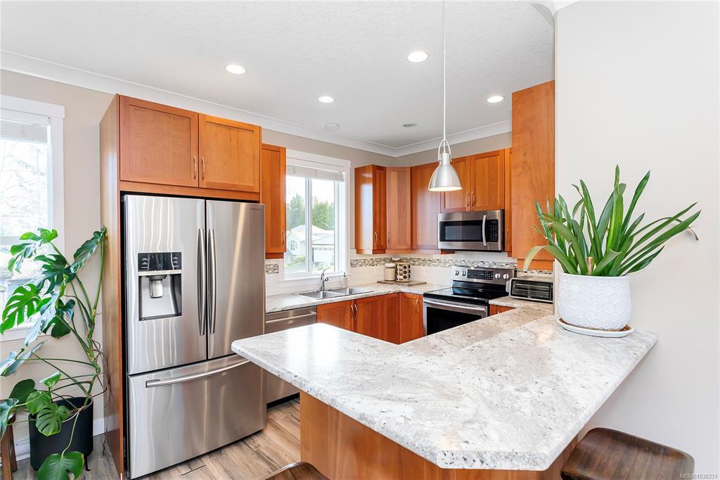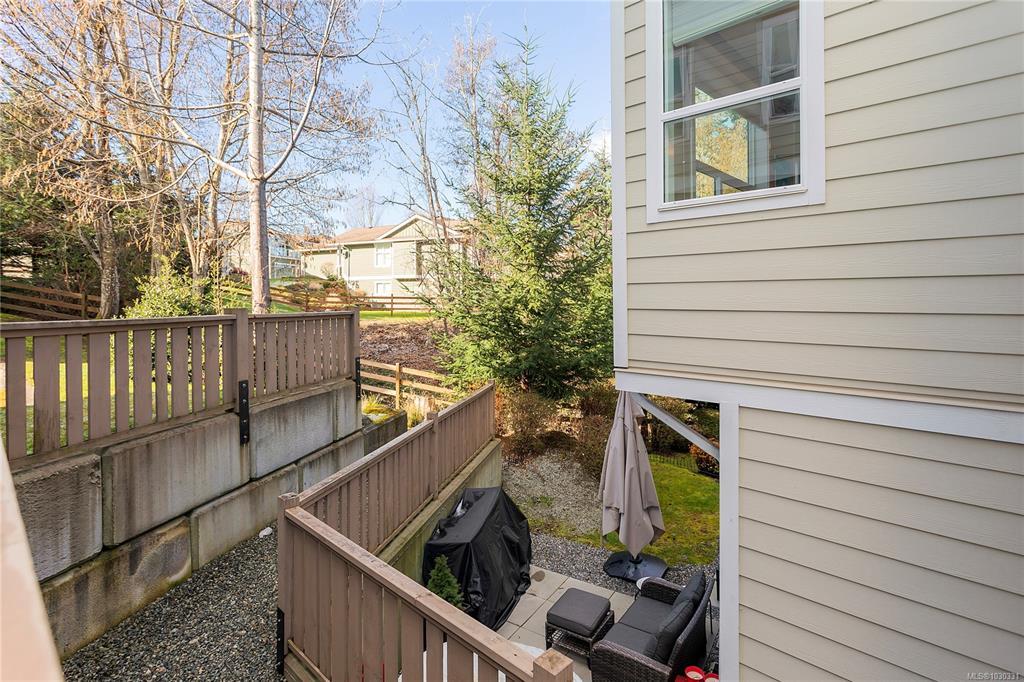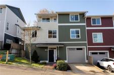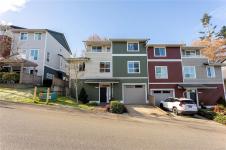 This beautiful end-unit townhome in North Nanaimo is perfect for first time buyers, growing families or empty nesters! Backing onto a quiet green space and a creek, this home benefits from a large, super private, ground level patio. Back inside you'll find that this 2016 build has a flexible layout that could work for almost anybody. Two bedrooms on the top floor, including the primary with a walk out, mountain-view balcony, as well as a 4-pc bathroom. The Main floor is naturally bright with big windows and flows seamlessly from the living room to the dining area and into the kitchen featuring cherry cabinets, ample storage and slide out pantry cupboards. The entry level includes the homes 3rd bathroom as well as the laundry area, and a 3rd bedroom that could easily be used as an office or family room. This room walks out to the large back patio area, stretching nearly 20' and bordered by mature trees, green space and a peaceful creek. You'll love living in the Parkwood neighbourhood!