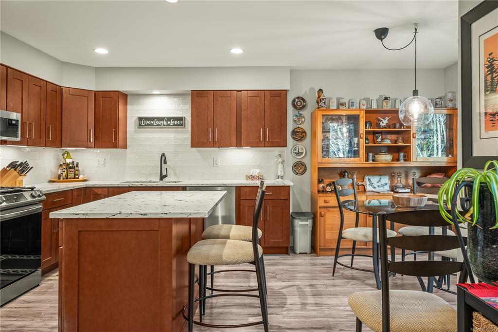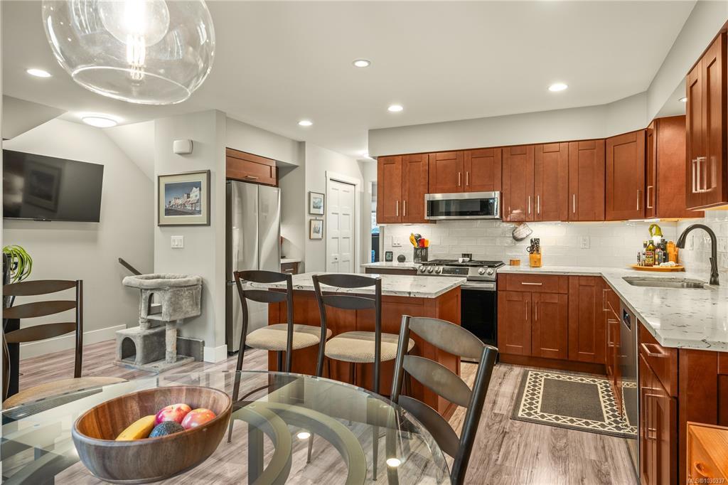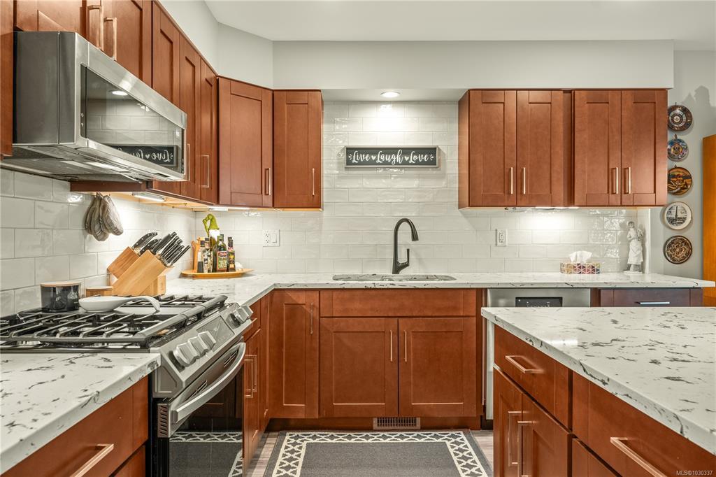Like-new & built in 2022 with NO GST, this modern 2-bed townhome offers the perfect balance of modern comfort and relaxed living in the heart of Chemainus. Ideally situated near golf, scenic walking trails, shopping, and local amenities, this move-in-ready home has been thoughtfully designed with quality finishes throughout. The kitchen features quartz countertops, ample cabinetry, gas range, a functional open-concept layout that flows seamlessly into the living space, complete with a cozy electric fireplace. Step outside to your private deck overlooking peaceful green space—perfect for morning coffee. The spacious primary is a true retreat, with an oversized walk in shower & heated floors. Enjoy gas forced-air heating, on-demand hot water, gas dryer, & upgraded window coverings. The rare 36-ft garage accommodates 2 vehicles, a workshop, home gym, or office, while the over-height crawlspace provides exceptional storage. Family, pet, and rental friendly—an outstanding opportunity!