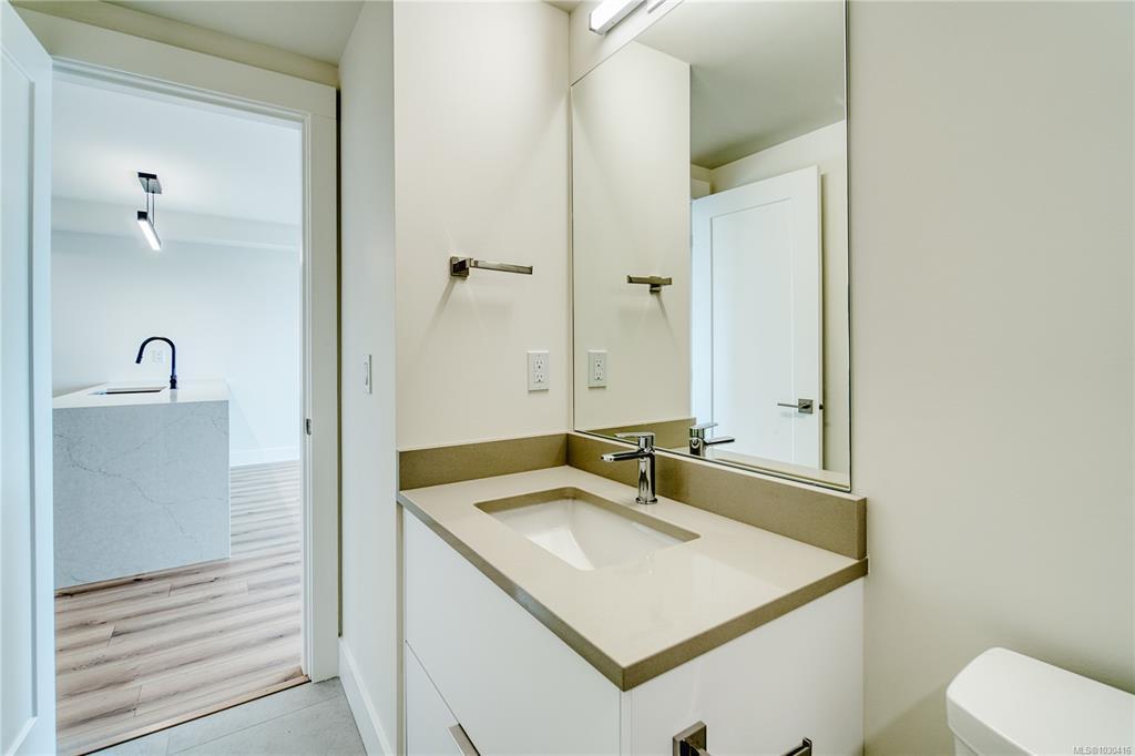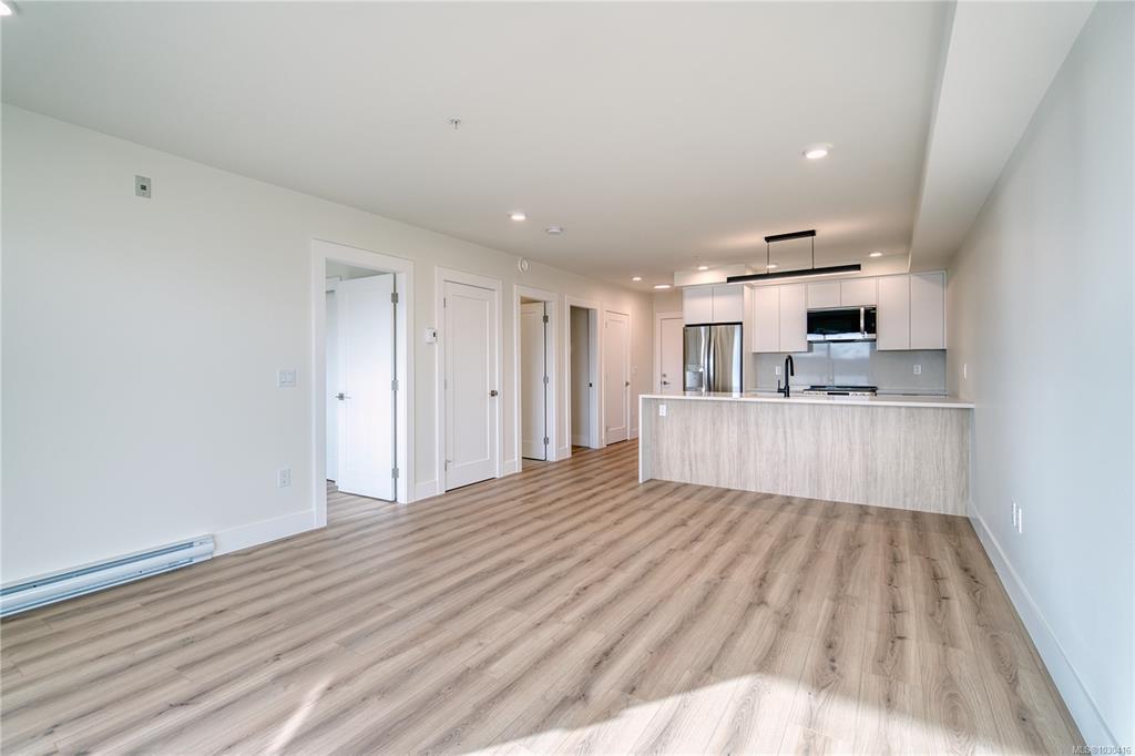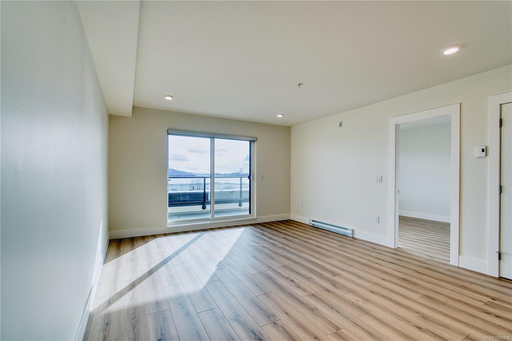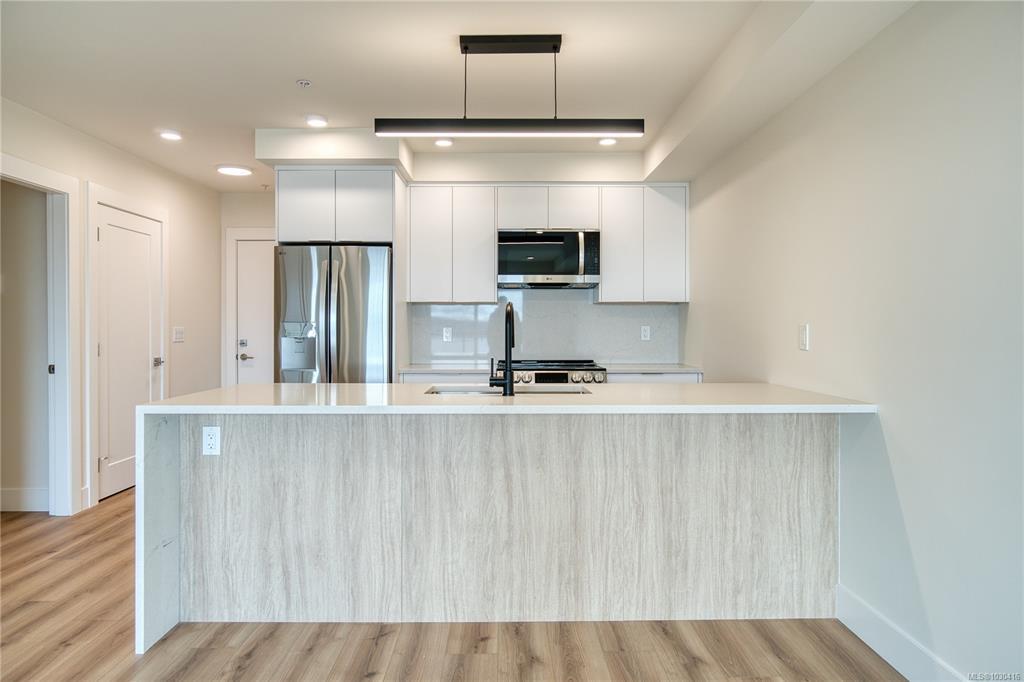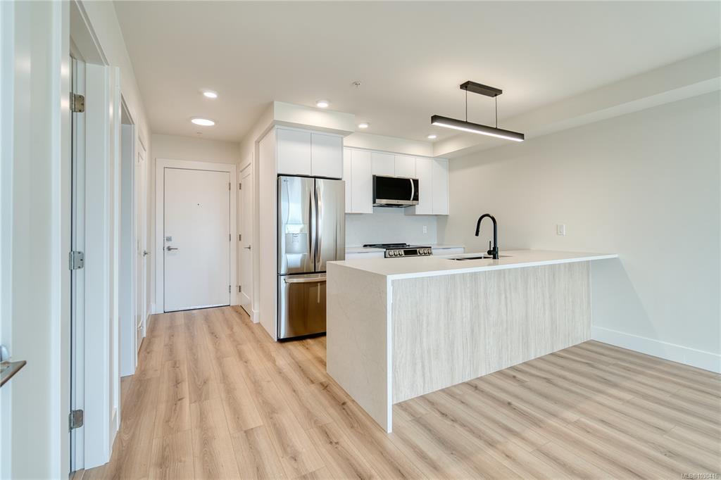 Welcome to Lumina in Harborview District, another principal property community in the heart of downtown Nanaimo, where city living meets coastal charm. Steps from the harbourfront, seawall, cafés, shops, parks, and Hullo Ferries, Lumina places you in the center of a growing, evolving district. Enjoy your mornings on the rooftop patio surrounded by lush greenspace and expansive ocean views. This beautifully designed 2-bedroom, 1-bath home features bright, open living with views of the harbour, city, and mountains — a striking blend of coastal beauty and urban energy. The kitchen stands out with waterfall-edge countertops, sleek cabinetry, and contemporary lighting, all contributing to a clean, modern aesthetic. Whether it’s a stroll along the waterfront, coffee with friends, or a rooftop sunset, this home connects you to the best of downtown — and the exciting future unfolding around it.
