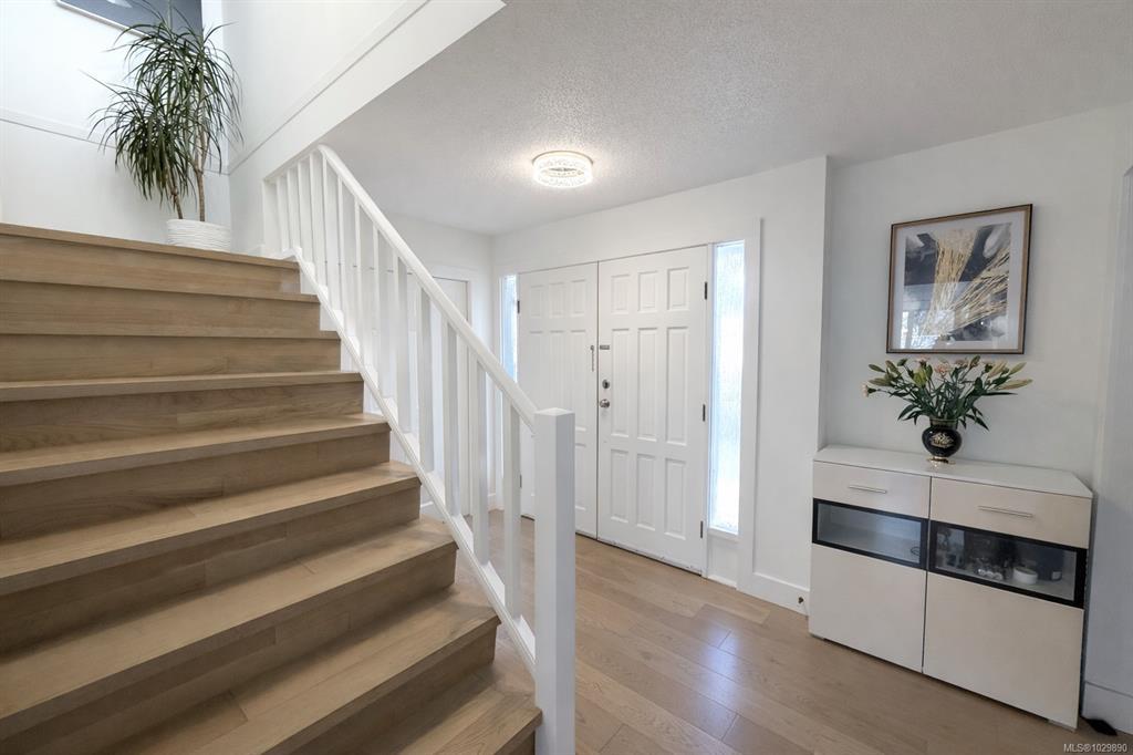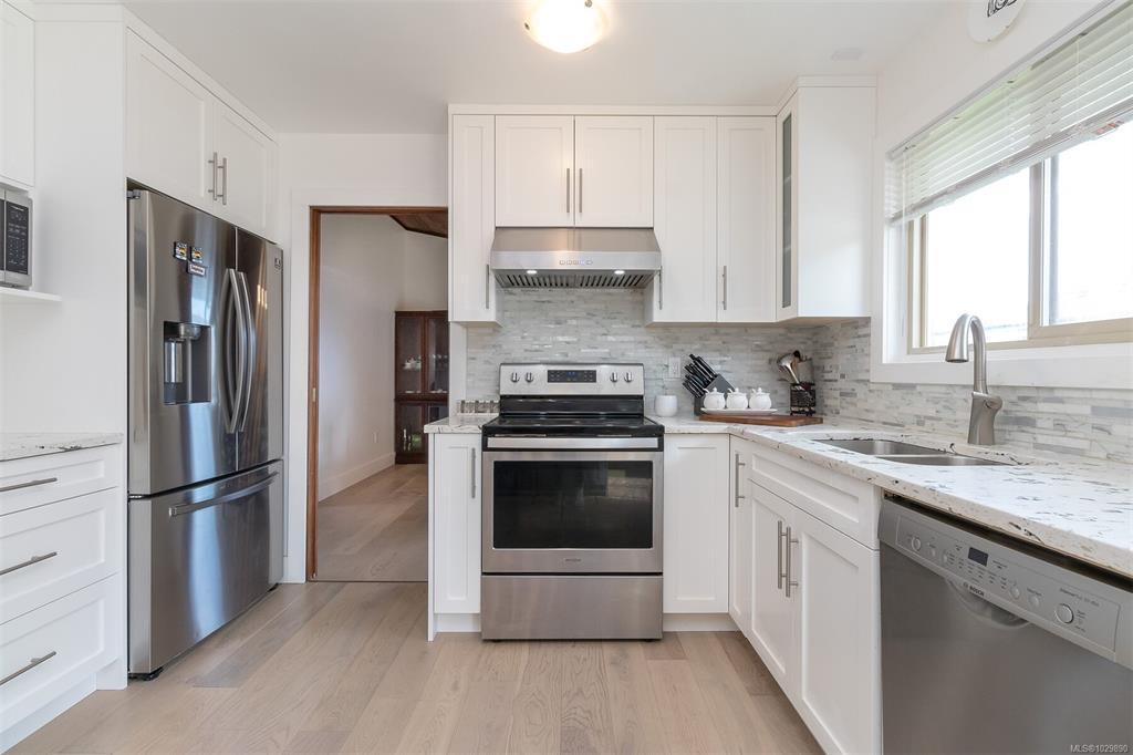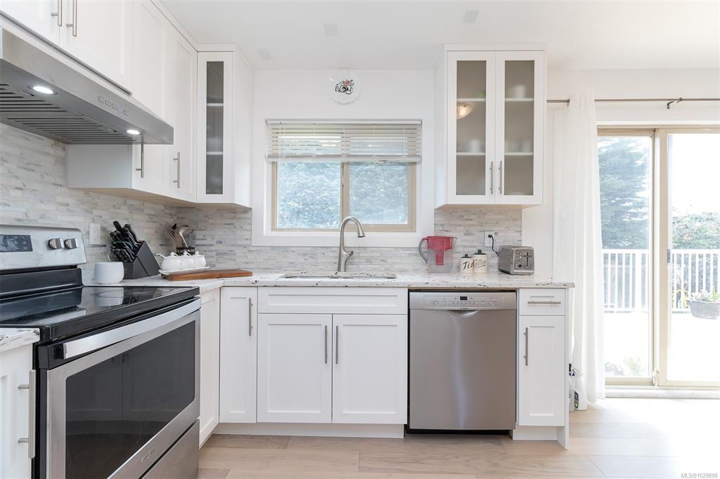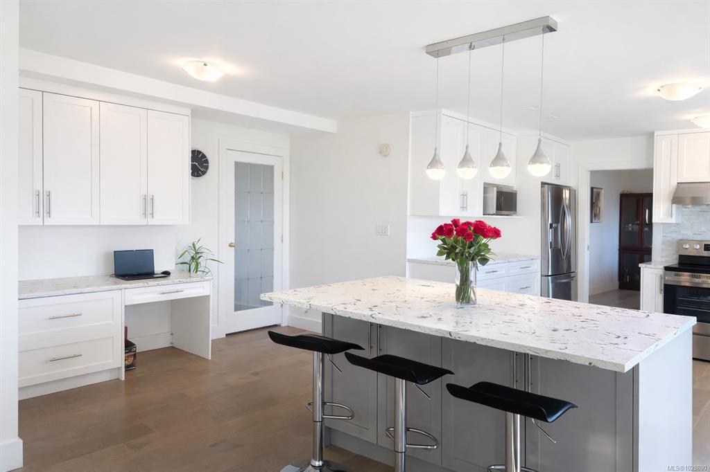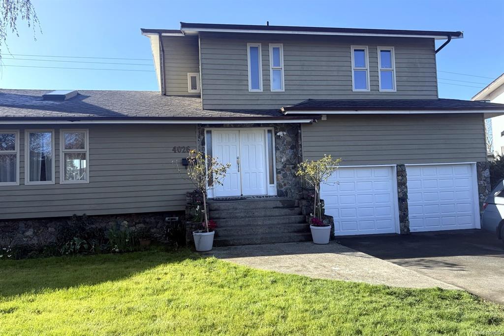 Updated 6 bed, 5 bath family home in the popular Gordon Head area. Features a spacious kitchen with quartz countertops, a large island, ample cabinetry, and a built-in office nook/desk. Stunning engineered hardwood floors run throughout the main and upper levels. Main and upper bathrooms include custom-made vanities with matching quartz countertops for a clean, cohesive finish. Main floor offers a bright and open living and dining area with high ceilings. French doors lead to a sunny deck and private backyard. Upstairs features 3 generously sized bedrooms and 2 full baths. The lower level includes a large living/media room, 3 bedrooms, 2 baths, and a double garage with 10’ ceilings. Newer deck and hot water tank (2026) Conveniently located close to schools, UVic, parks, shopping, and transit.
