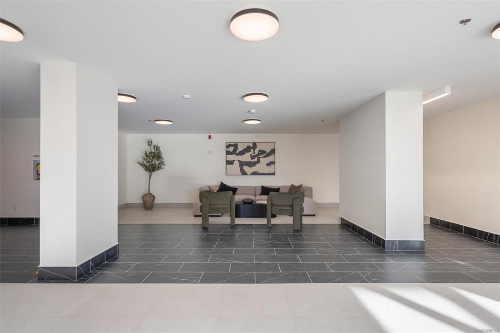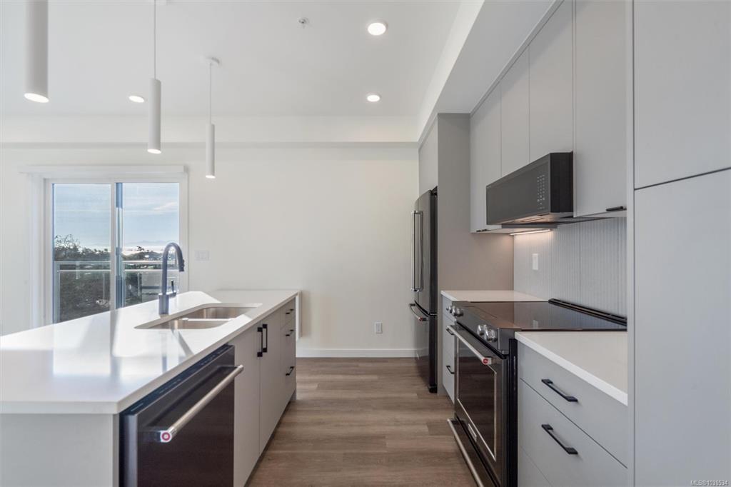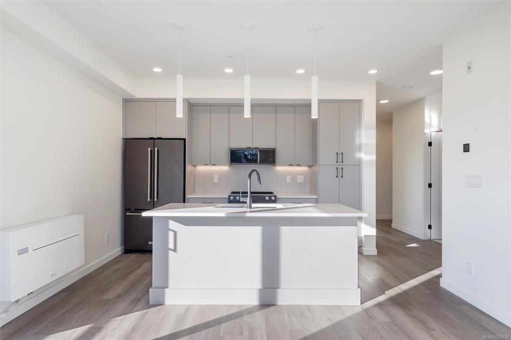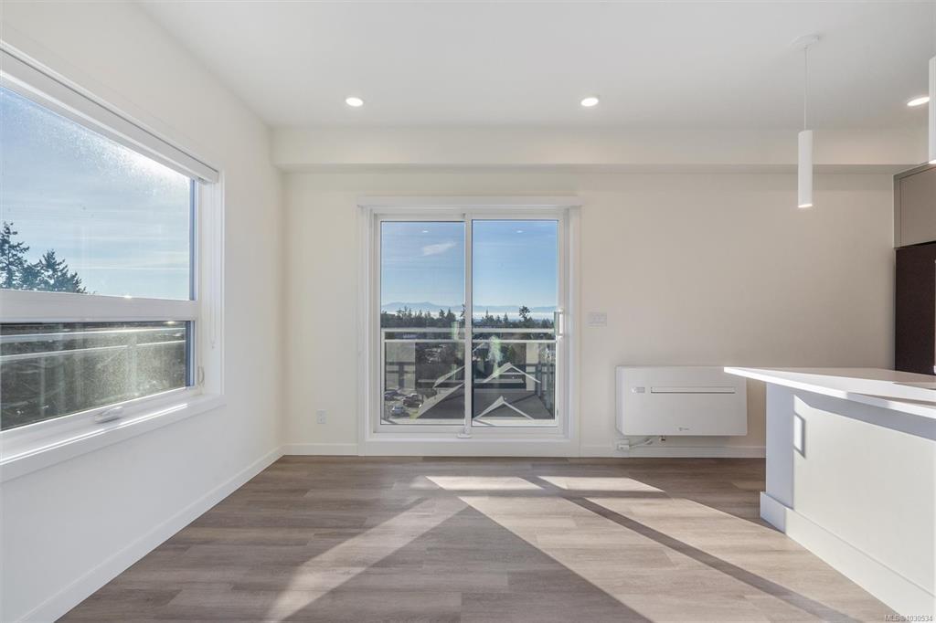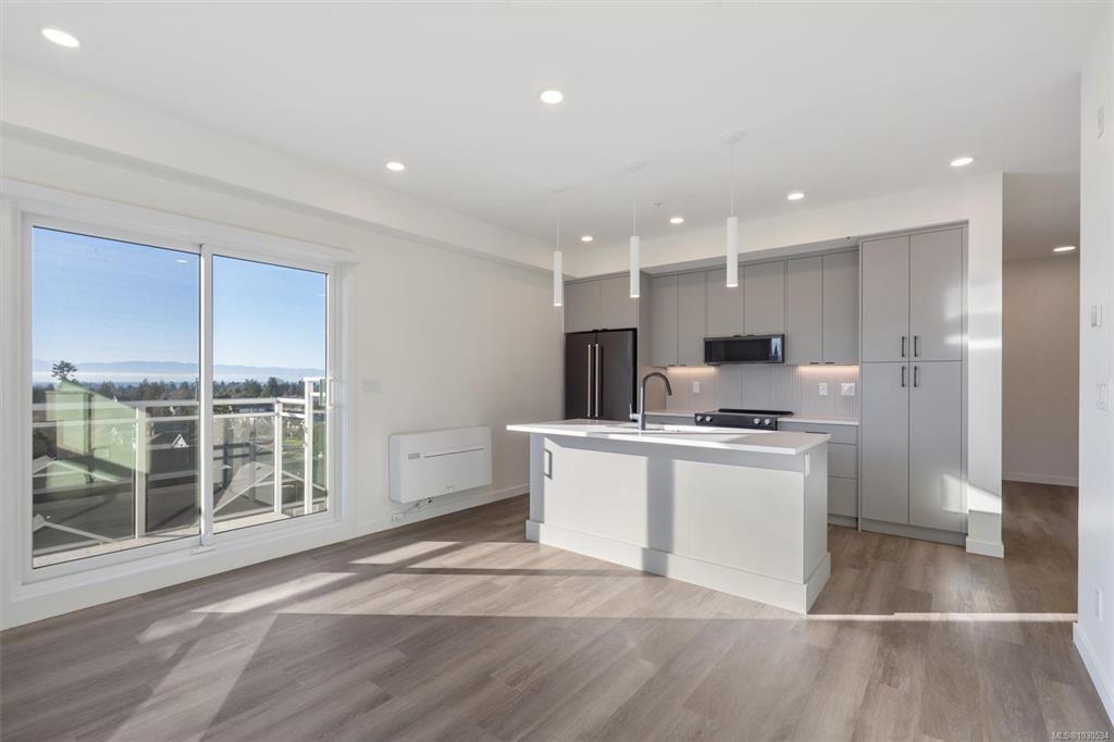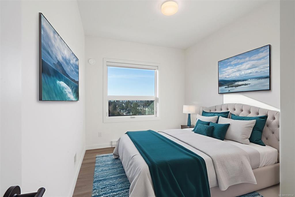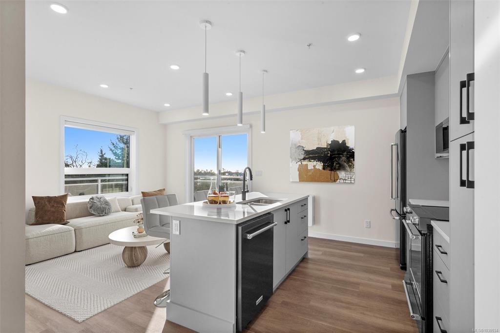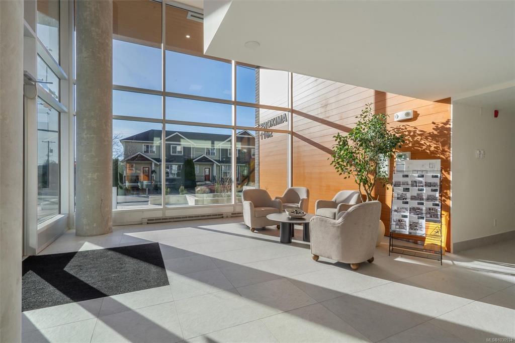 Welcome to The Proxima — a bright and stylish new 2-bedroom, 1-bath corner unit featuring a wrap-around balcony with views of the Olympic Mountains, and the ocean. Expansive windows on two sides flood the home with natural light, creating an airy and inviting atmosphere. The modern kitchen is equipped with KitchenAid appliance package, quartz countertops, and a spacious island perfect for entertaining. The living area offers warmth and comfort with an electric fireplace, with 2 bedrooms, and a four-piece bathroom with in floor radiant heat. Additional highlights include a heat pump with cooling, storage locker, and a secure underground parking stall. Residents enjoy shared amenities such as a meeting room, fitness center, and landscaped courtyard. Ideally situated on an easy bus route to downtown and within walking distance to Saxe Point, grocery stores, Saxe Point Pub, the library, Archie Browning Sports Arena, and more — this is urban living at its best.
