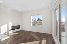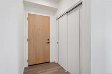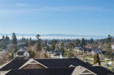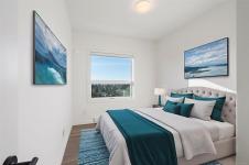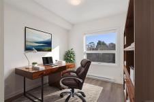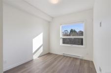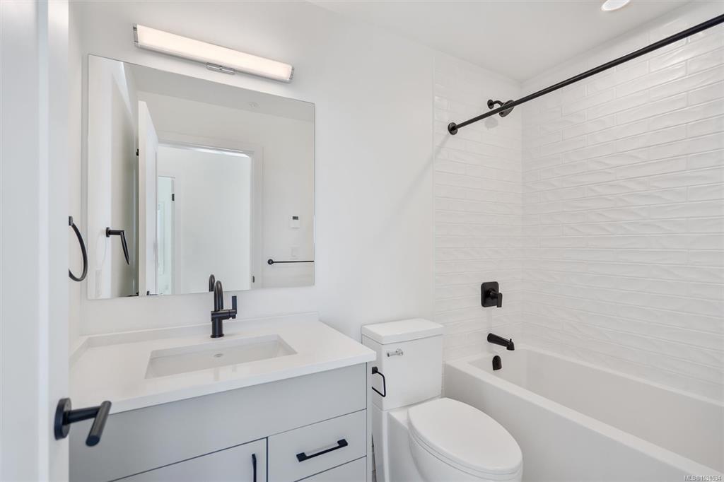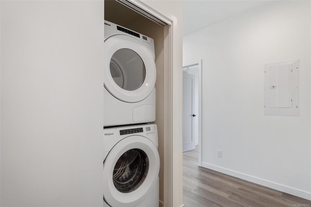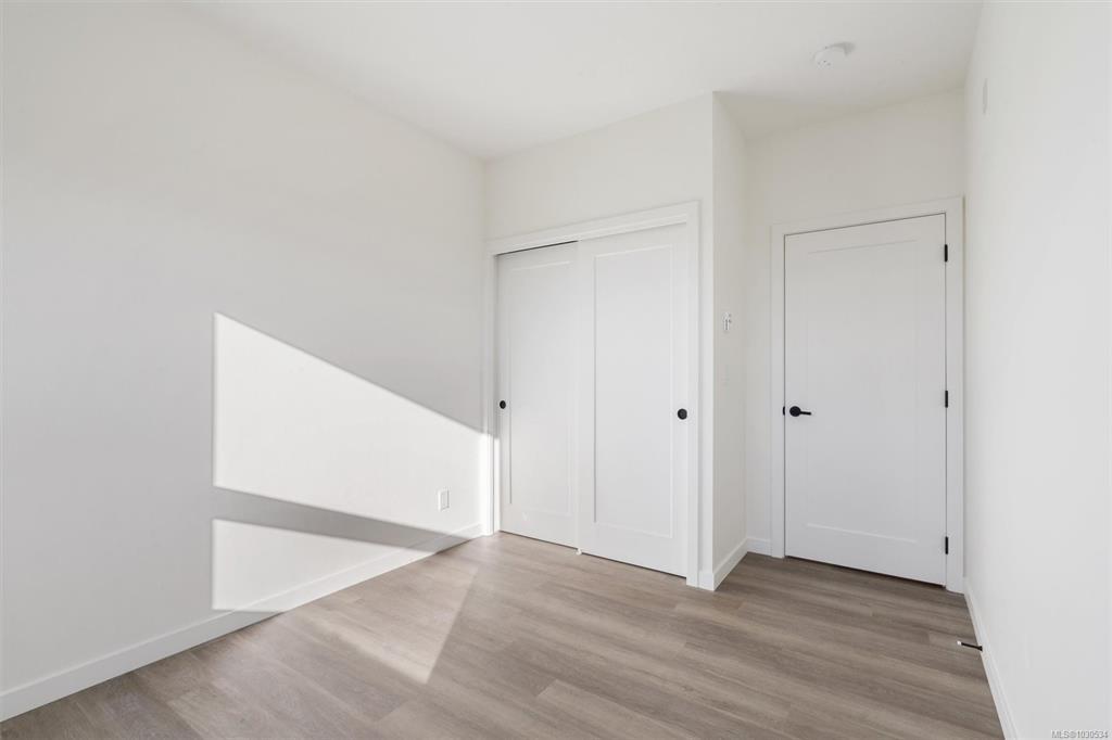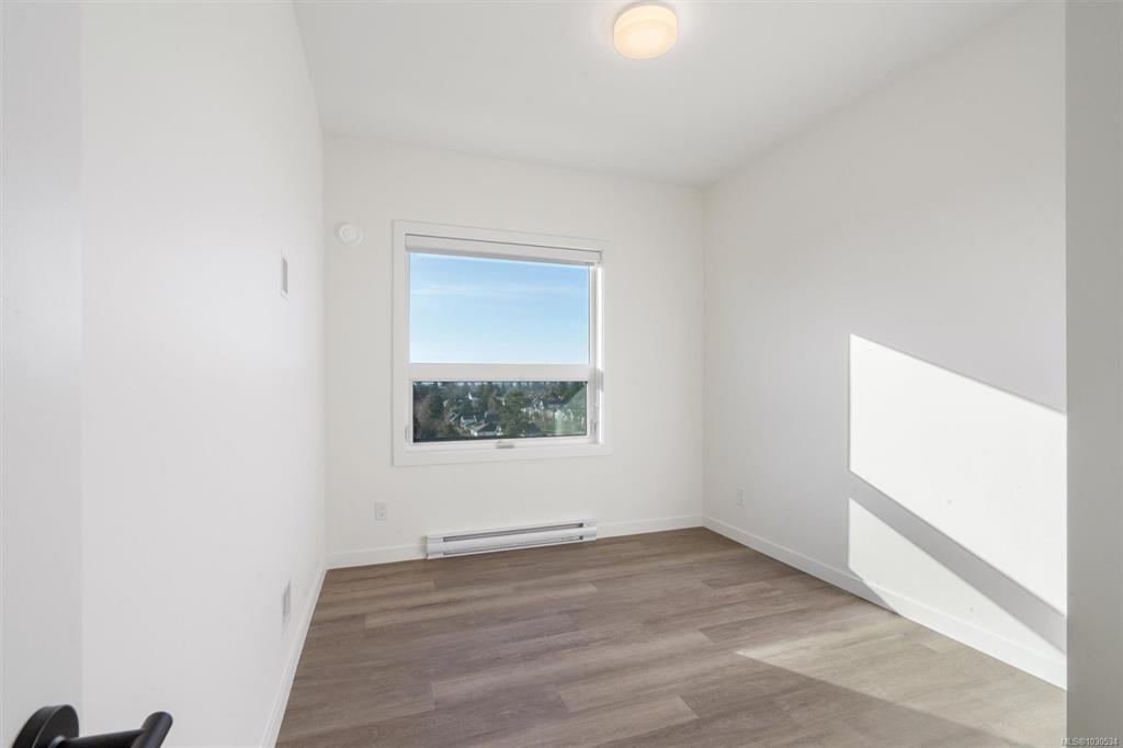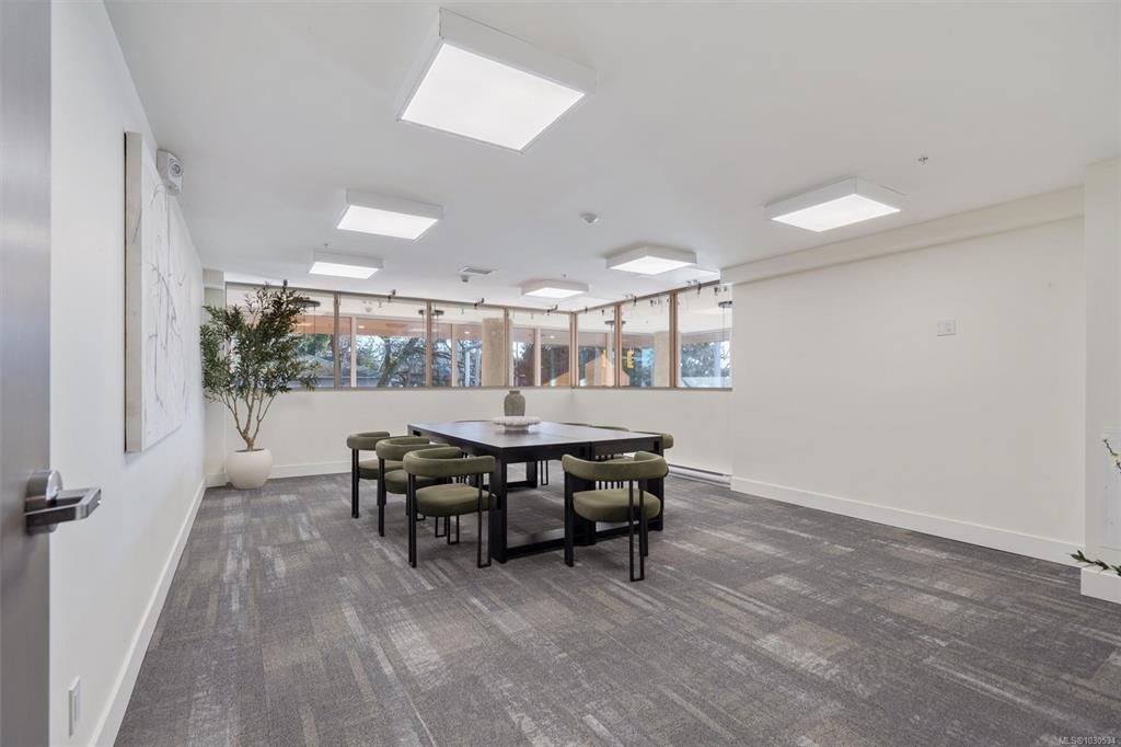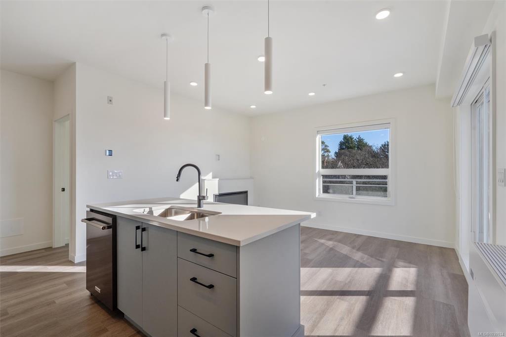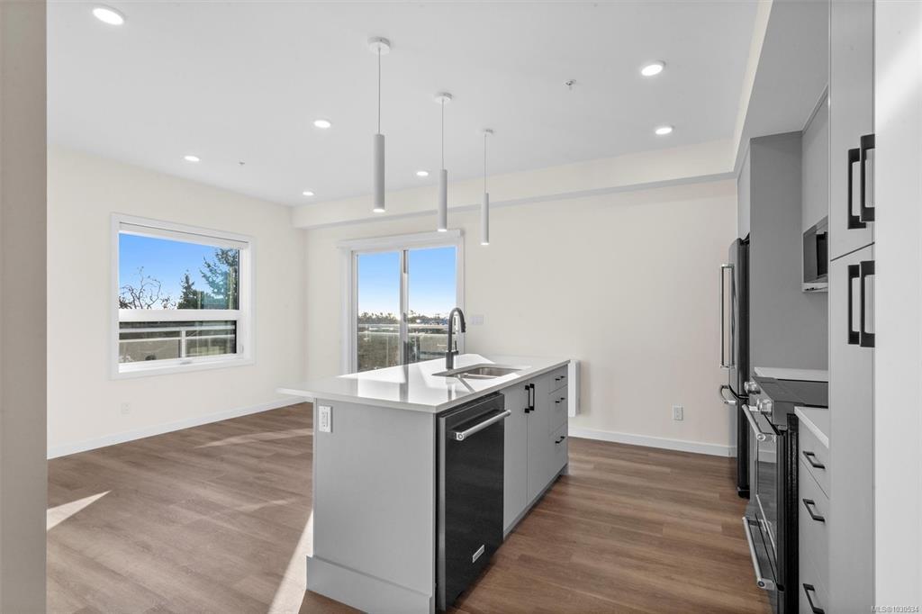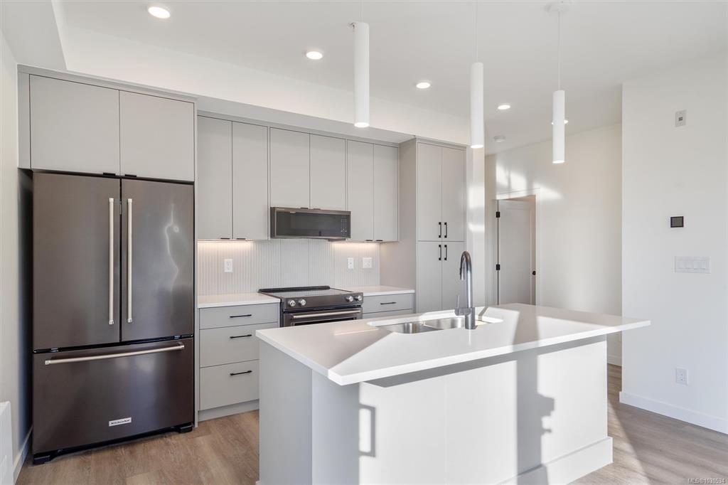 Welcome to The Proxima — a bright and stylish new 2-bedroom, 1-bath corner unit featuring a wrap-around balcony with views of the Olympic Mountains, and the ocean. Expansive windows on two sides flood the home with natural light, creating an airy and inviting atmosphere. The modern kitchen is equipped with KitchenAid appliance package, quartz countertops, and a spacious island perfect for entertaining. The living area offers warmth and comfort with an electric fireplace, with 2 bedrooms, and a four-piece bathroom with in floor radiant heat. Additional highlights include a heat pump with cooling, storage locker, and a secure underground parking stall. Residents enjoy shared amenities such as a meeting room, fitness center, and landscaped courtyard. Ideally situated on an easy bus route to downtown and within walking distance to Saxe Point, grocery stores, Saxe Point Pub, the library, Archie Browning Sports Arena, and more — this is urban living at its best.