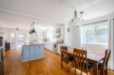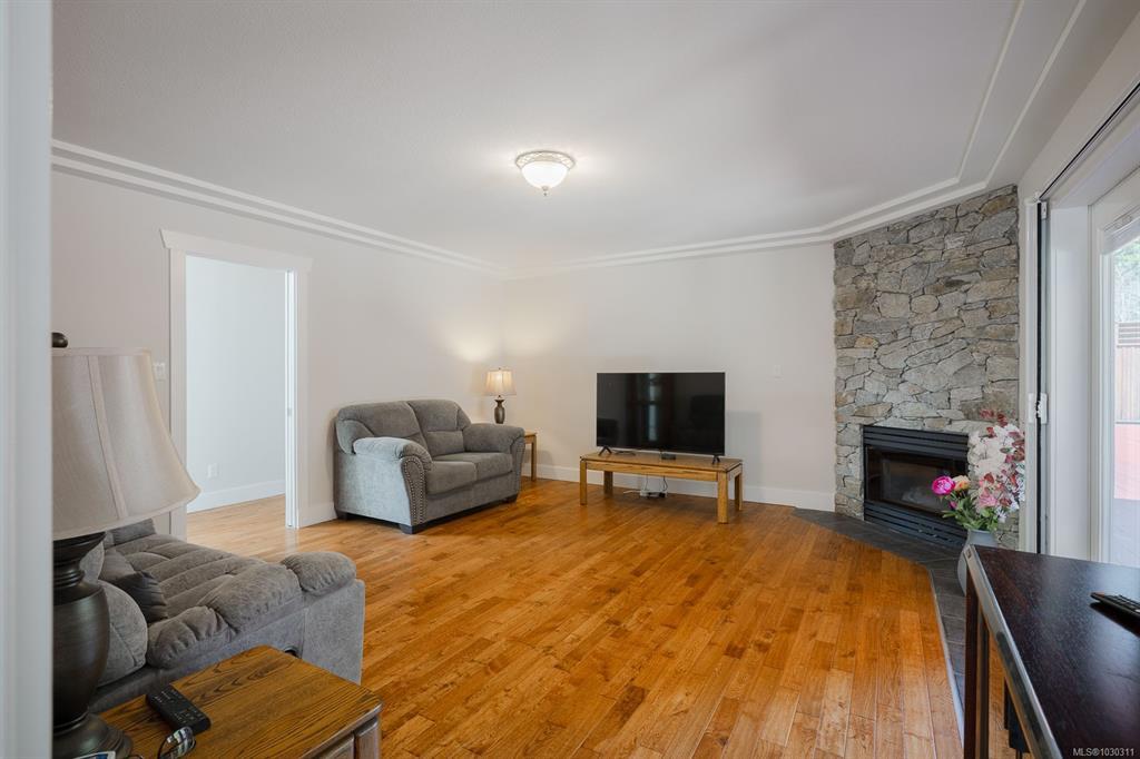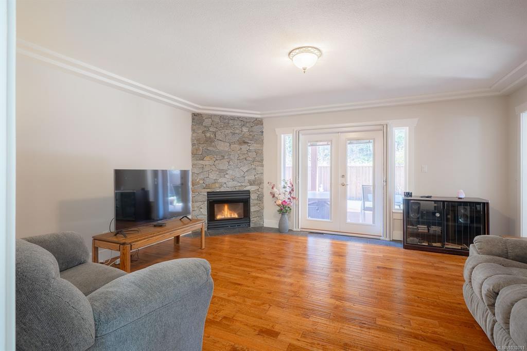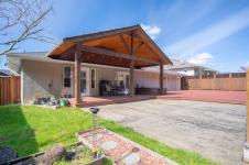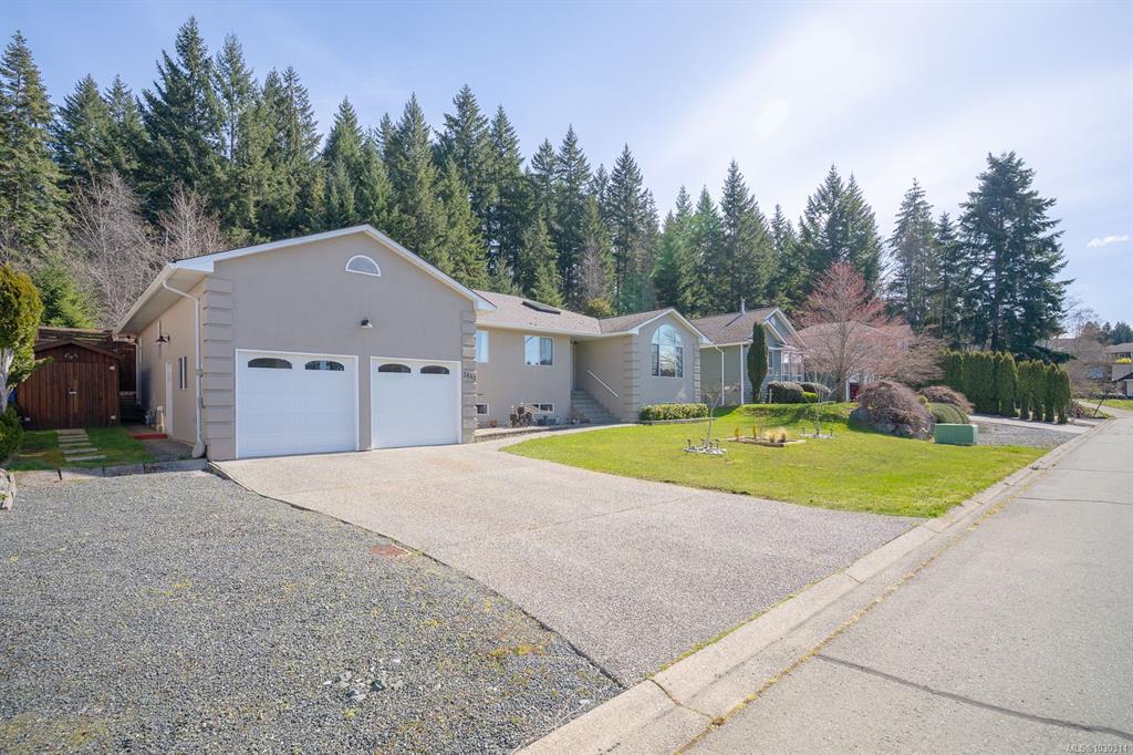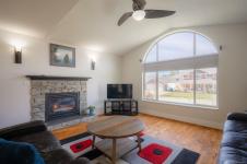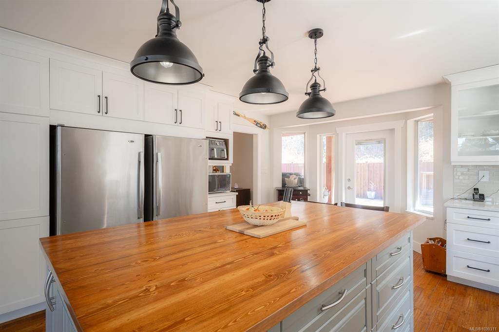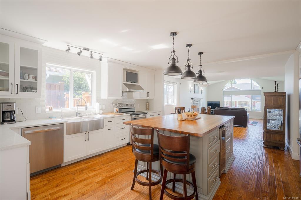 Welcome to this beautifully RENOVATED 3bed, 2bath rancher offering over 2,000 sq ft of living space in a highly DESIRABLE LOCATION. This home blends modern style with comfort and functionality. Step inside to an inviting open-concept layout featuring a spacious living room with gas fireplace and a stunning modern kitchen complete with a massive island with wine fridge, and a unique blend of quartz and wood countertops. A separate family room with a striking stone fireplace provides additional space. The home offers 3 generously sized bedrooms, including a primary retreat with walk-in closet and ensuite. Outside, the fully fenced backyard is designed for enjoyment with a large cedar deck, partially covered for year-round use, and views of surrounding trees. Additional features include an over-height double garage, RV or boat parking, and irrigation system. This is a move-in ready home that checks all the boxes: modern updates, great layout, and an ideal setting.