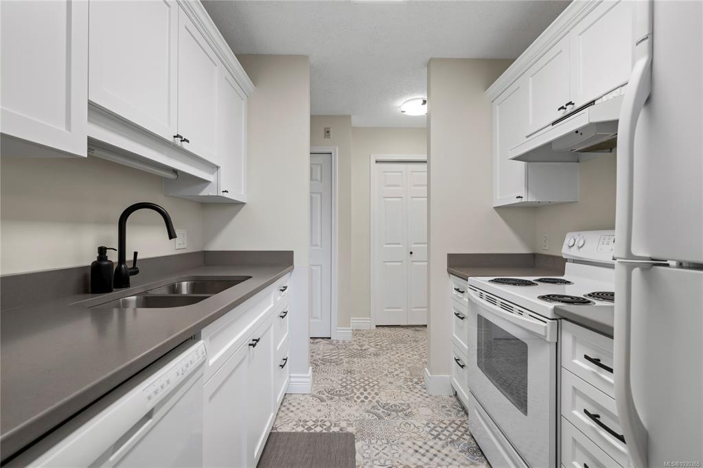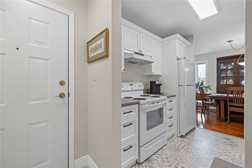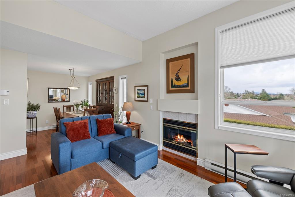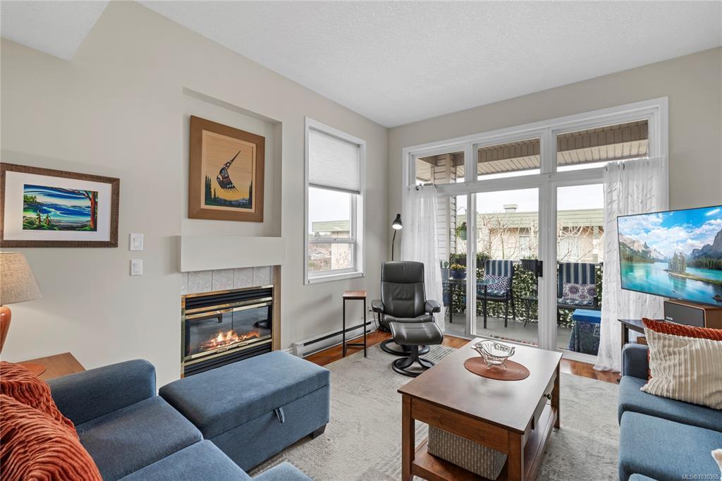 Discover modern comfort in this bright, top-floor corner suite. Spanning 950 sq. ft., this home has been beautifully revitalized with new flooring, contemporary lighting, and a refreshed palette. The heart of the home is a galley kitchen featuring sleek updated countertops, refaced cabinetry, and updated flooring. This space flows into a dining area and a living room boasting 10' ceilings and a cozy fireplace, leading to a spacious private balcony with views of Mount Arrowsmith.