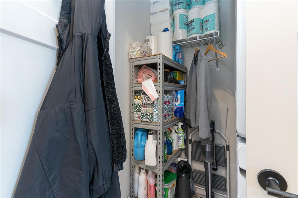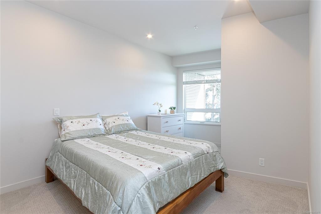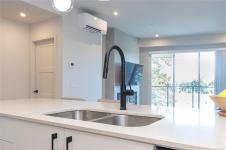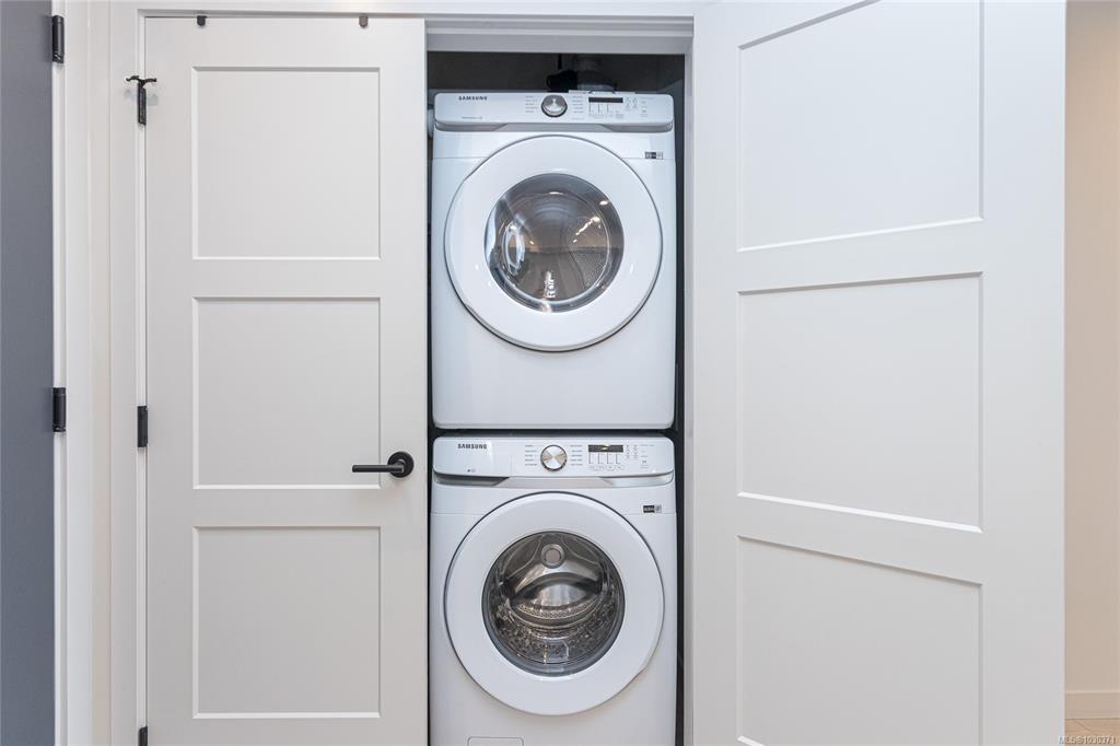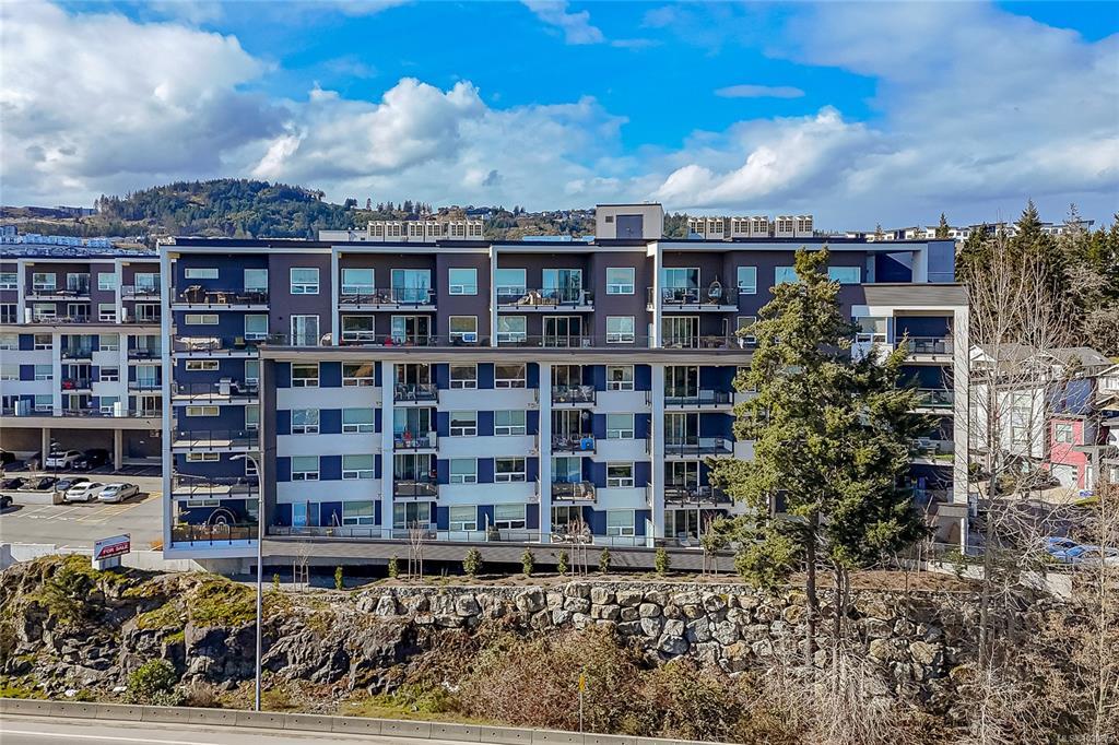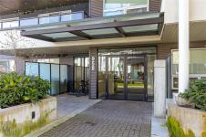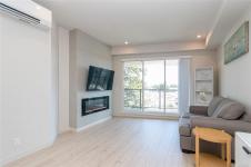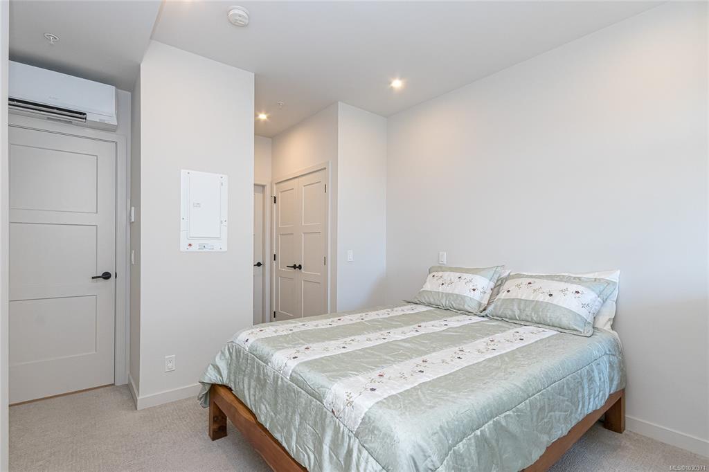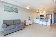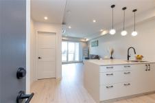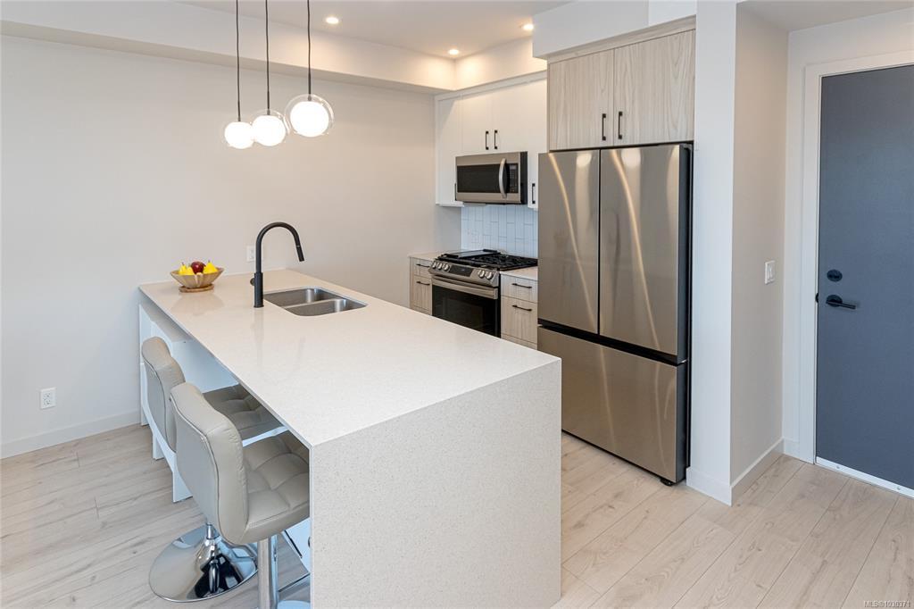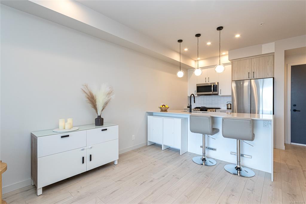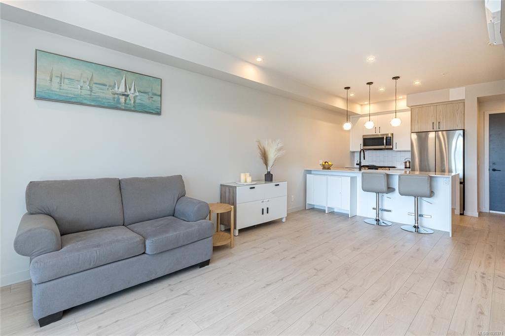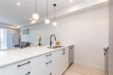 RARE, Immaculate, "Like New" (2023), Move-In Ready 1 Bedroom Condo offers AMAZING VALUE at $409,900! Enjoy the morning sunrise in this bright, South-East facing condo with distant mountain views.Open Plan maximizes light & space creating maximum functionality & includes in-suite laundry & storage.Kitchen, well-designed with a chef in mind, has stainless steel appliances, gas stove, ample cabinetry & eating bar.Enjoy the comfort of air conditioning with 2 heat pumps, one in the living room & bedroom (included in strata fees).Living room features an electric fireplace with optional flame designs. Sliding doors lead to a spacious, 120 ft. covered deck, an extension of your living space, for BBQ's & year-round enjoyment! Bedroom leads to a walk-in closet, bathroom & offers a serene, treed outlook & cozy nook for home office. Located to nearby parks, shopping & transit.Professionally managed, pets welcome (no size limit cats & dogs)& access to amenity lounge, rooftop terrace & fitness room.