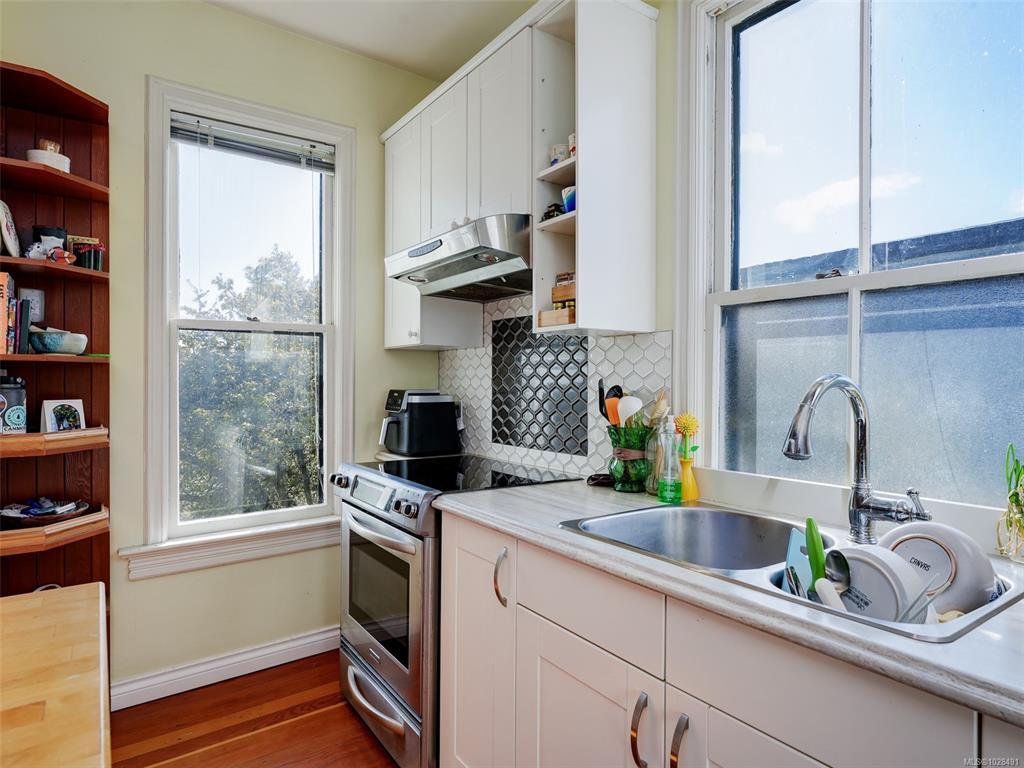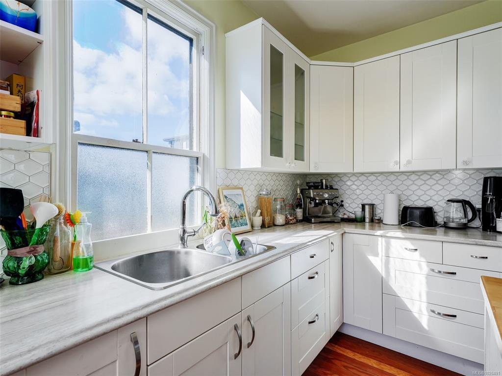 OH Sat 1-3. Gorgeous Queen Anne Heritage designated home in sought after Fernwood. Home has been extensively renovated to create 2 wonderful living spaces. You'll love the heritage touches including stained glass & fir floors. You'll appreciate the thoughtfully fully irrigated landscaping with raised beds, perennials, edibles & productive fruit trees. No shortage of outside spaces either with west facing patio, deck & sunroom between the 2 units. Inside, both homes enjoy large, updated kitchens that are the heart of the homes. There's also lots of light in the home with lots of large windows & 9-10' ceilings on the main & 2nd floors. The loft area adds 2 more beds & a 2 pc bath. The upper suite bath was featured in a magazine. Both suites enjoy their own laundry & entrances. Renovations included full insulation, updated plumbing & electrical, gas furnace & the exterior has been just repainted. Fulll crawlspace provides plenty of storage. Enjoy walkable Fernwood & all that it offers!