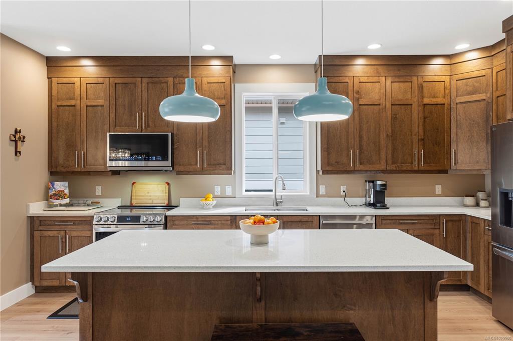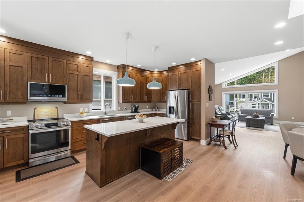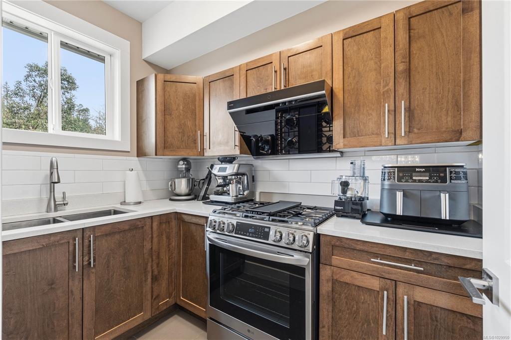 A spectacular opportunity in Linley Valley to own a home backing onto peaceful protected parkland. Showcasing over 3,300 sqft of functional, comfortable living space, the main area delivers an open airy feel with vaulted ceilings, skylight, quartz countertops, prep kitchen, updated flooring, gas fireplace, and large windows producing abundant natural light. 3 beds 2 baths, including a primary with deck access and spacious 5pc ensuite. Both front and rear decks invite you to enjoy southern sunshine and peaceful views over Linley Valley Park. Lower level adding 2 additional beds, and bath along with a separate 2 bed vacant legal suite adding flexibility. Recent thoughtful upgrades include new audura max flooring, interior paint, LG wifi enabled appliances, heat pump/furnace main home, heat pump suite, wifi control irrigation system, wireless interior/exterior lighting, exterior lumenox lighting, fence, and outbuilding. Close proximity to trails, parks, schools, and everyday amenities.