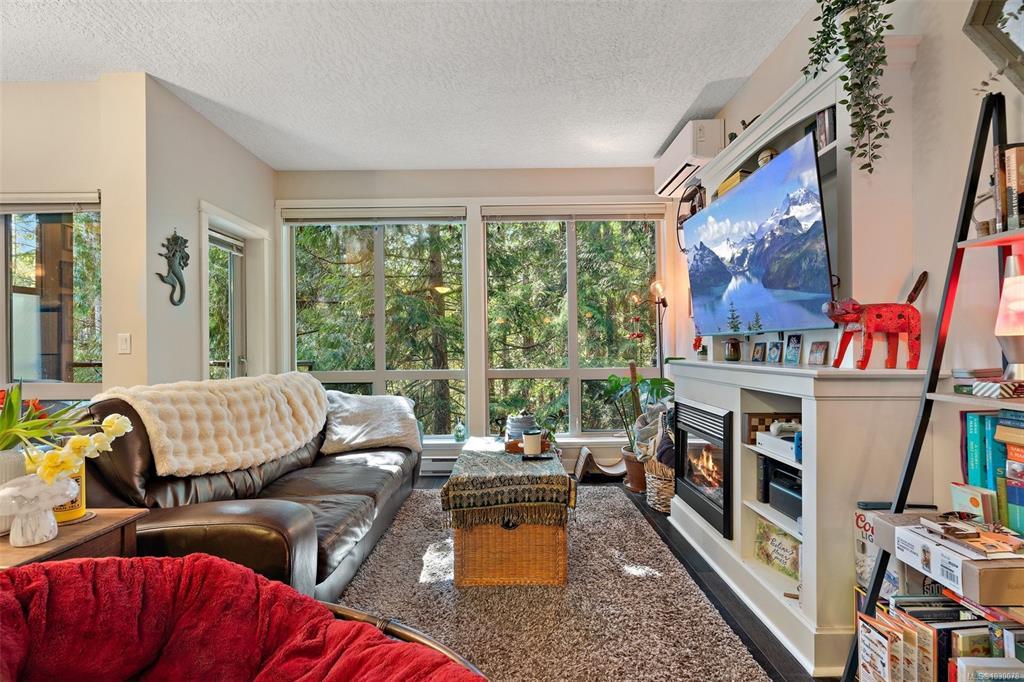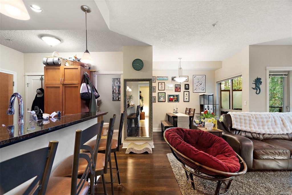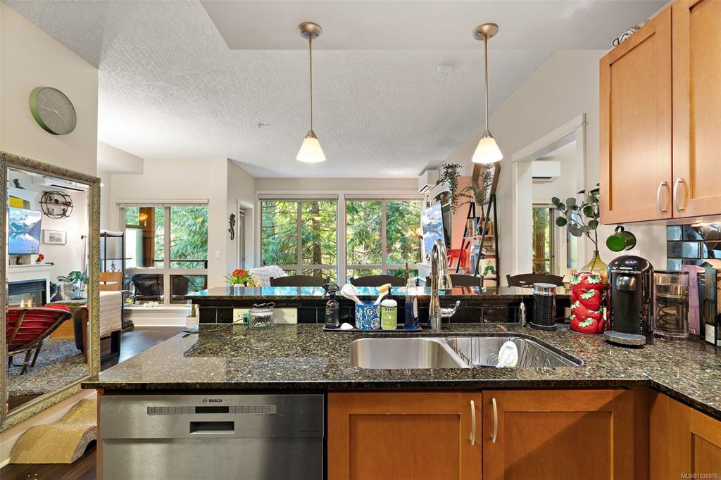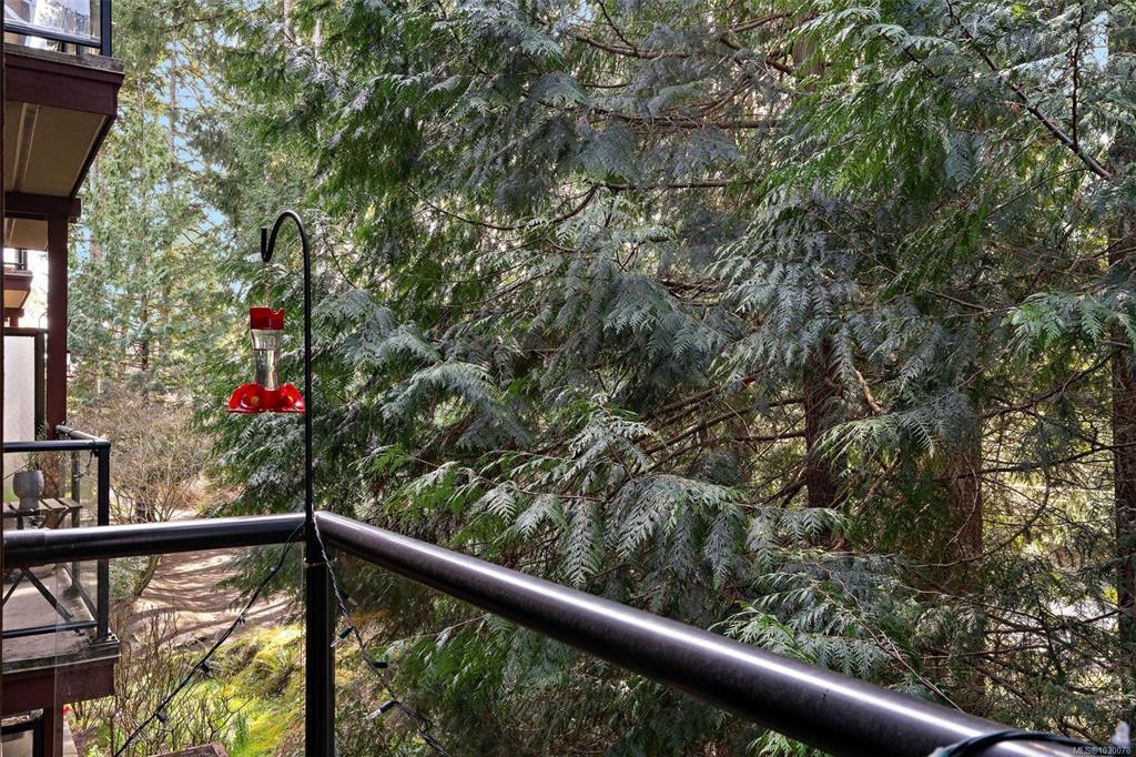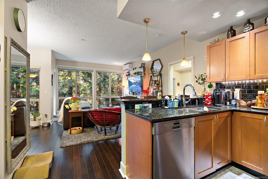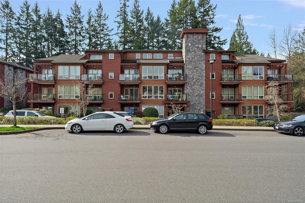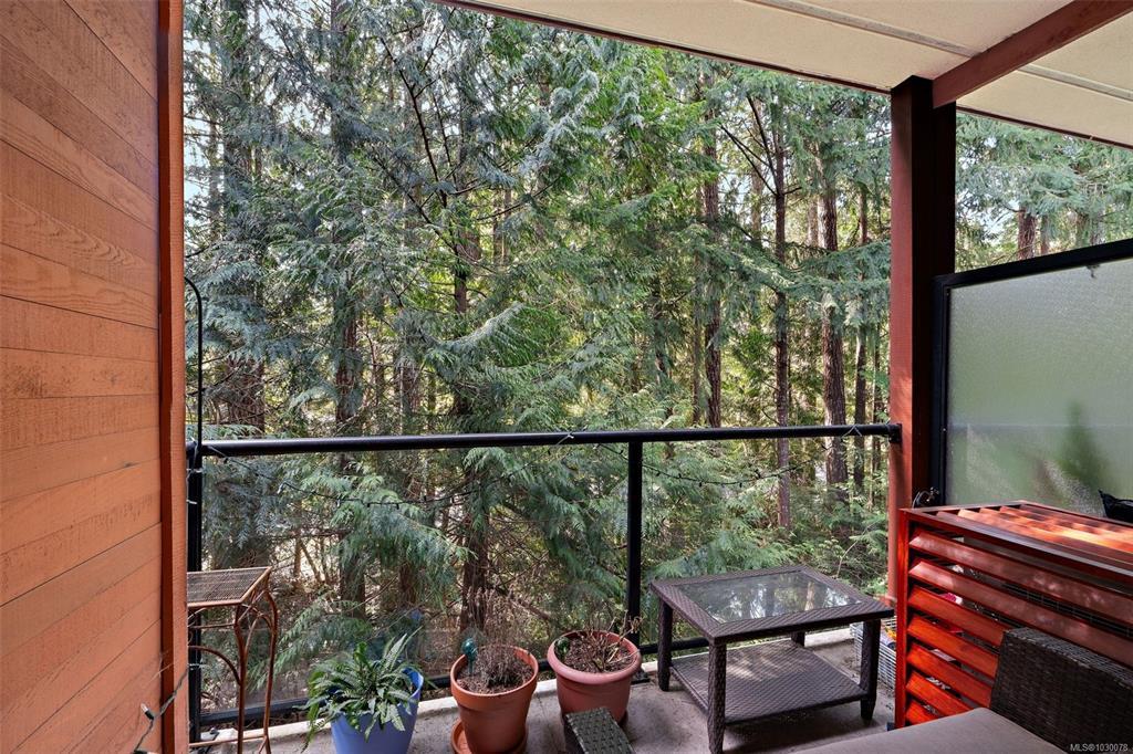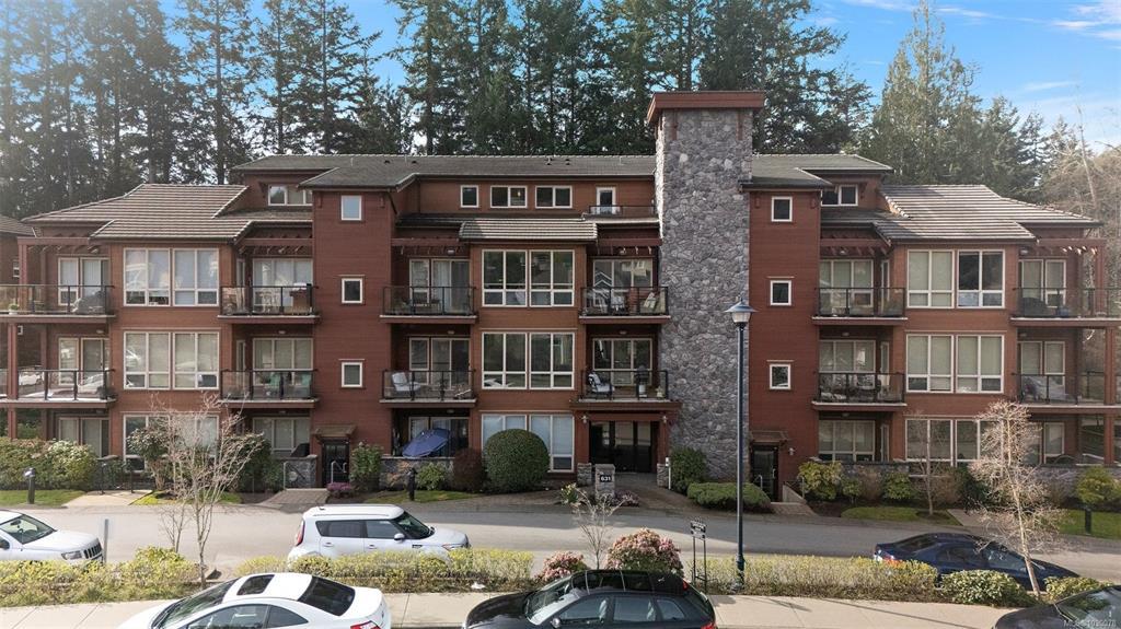 Welcome home...Don't miss this bright, spacious, south facing 1 bed 2 bath unit . Features include, maple shaker cabinets, quartz countertops, in suite laundry, covered deck, storage locker and secure underground parking and a heat pump. On the quiet side of the the building overlooking a forested walkway. Steps to Red Barn, pharmacy and Olympic View Golf Course. A short drive away is Westshore mall, Royal Bay and the beach. Well run proactive strata Don't miss the opportunity to view this great property