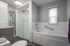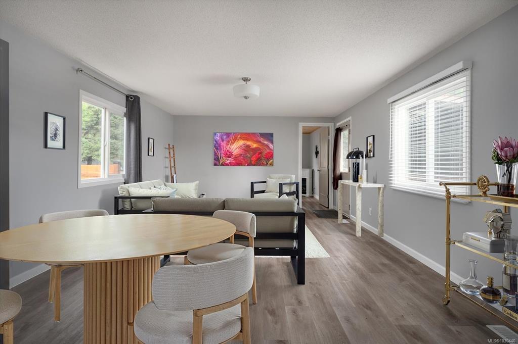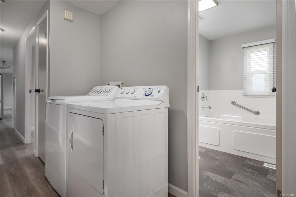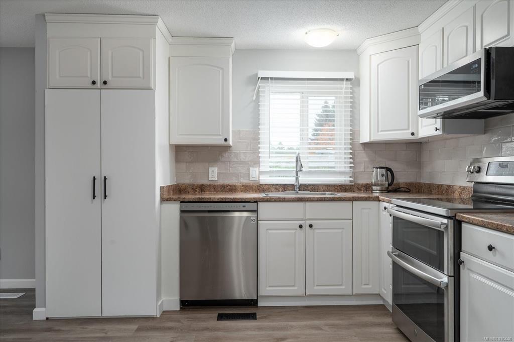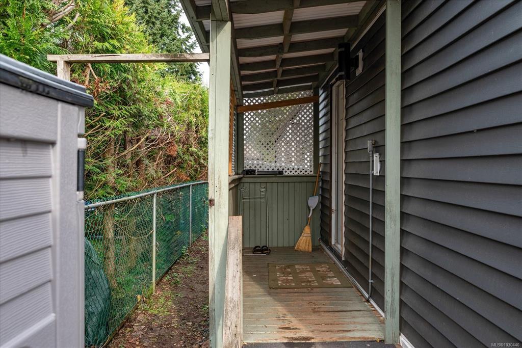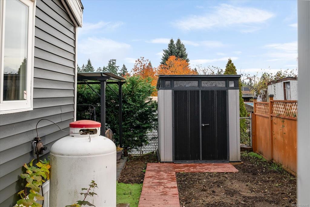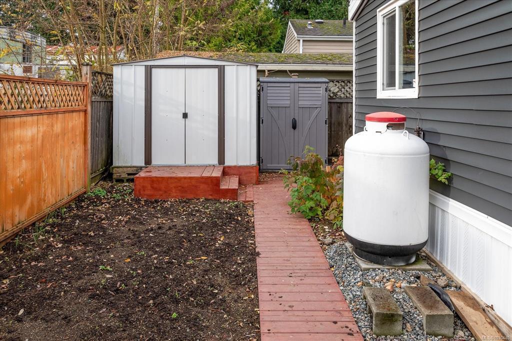 Family and pet friendly living awaits at popular Park Lane Mobile Home Park, a rare feature in Nanaimo parks! This 3 bed/1 bath, 919 s/f home offers exceptional value with extensive upgrades in the last 4 years - including vinyl siding, new flooring and paint throughout, completely remodeled bathroom, PEX plumbing throughout, new lighting, stainless steel kitchen appliances, and a newer roof. Vinyl windows were installed by previous owners approx 2007. The bright kitchen features abundant cabinetry and a modern tile backsplash, opening into a spacious living room. Enjoy a fully fenced, sunny yard, complete with a gazebo, 4 sheds and a thriving cedar hedge and turf—perfect for kids and pets. Located on a quiet no-through road near Douglas & Eighth Park, Chase River Creek, and just steps to Park Avenue Elementary. Close to VIU with easy access to transit and shopping.