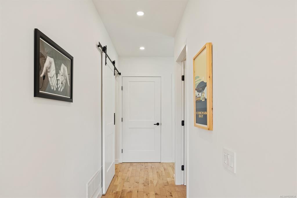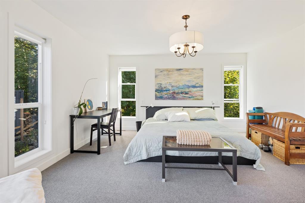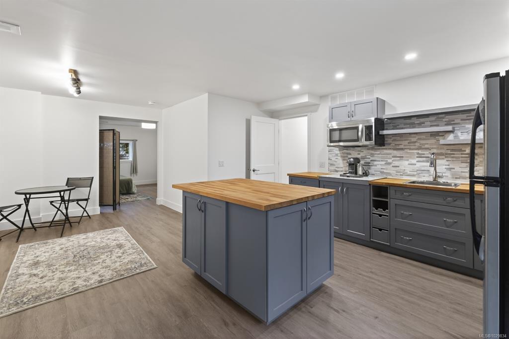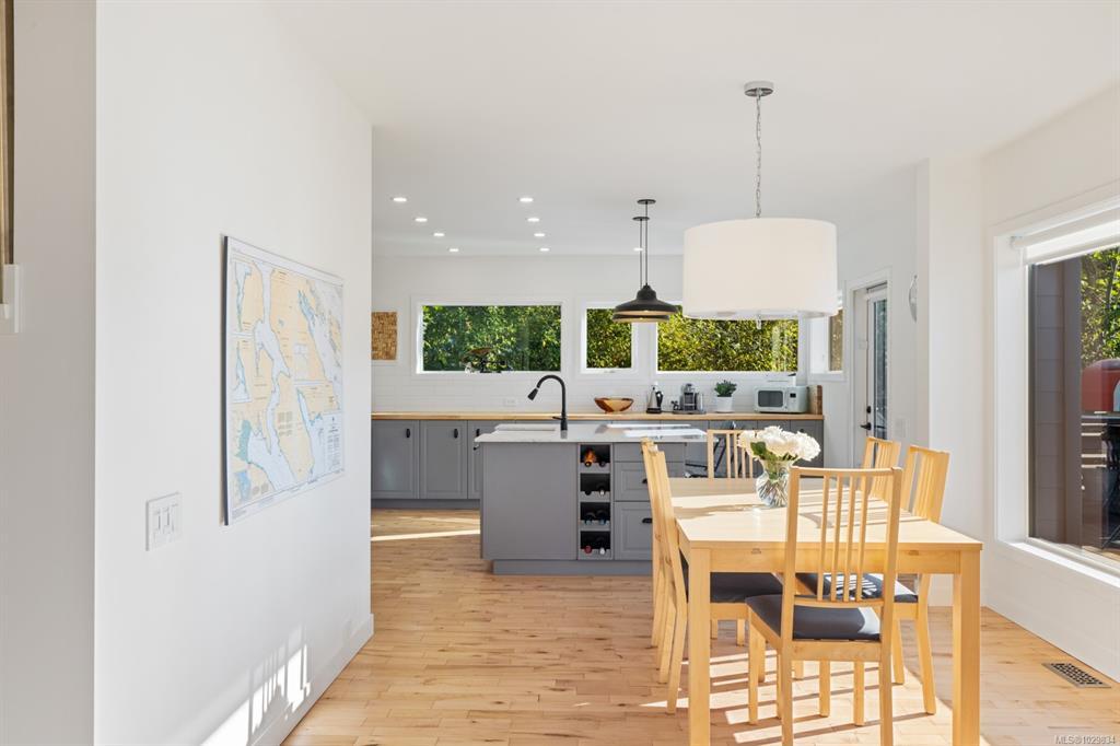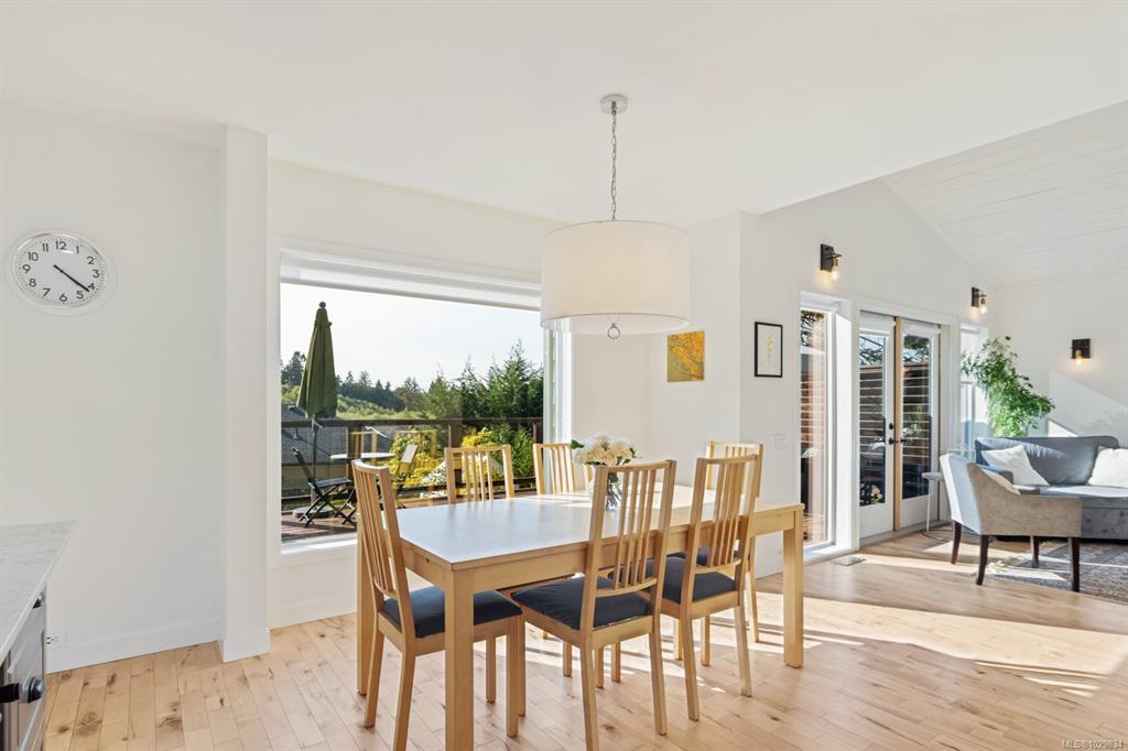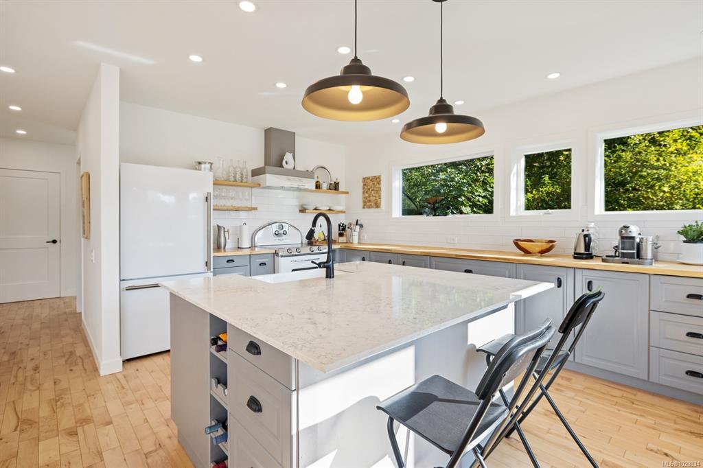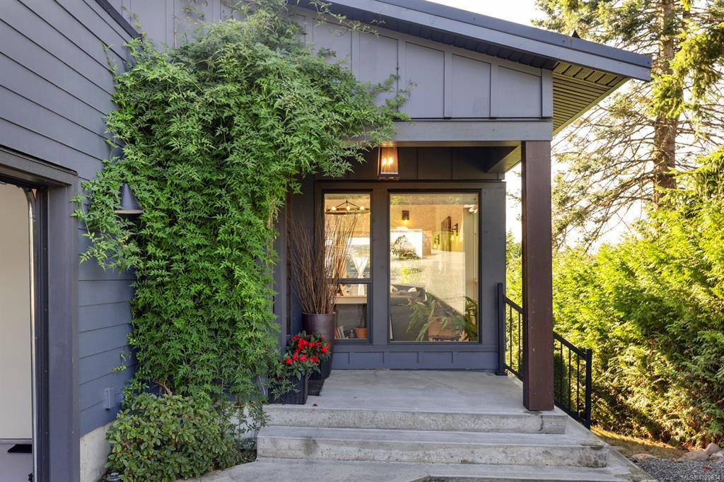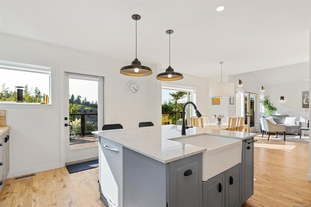 The covered entrance welcomes you into this architecturally designed home. The Vaulted living room is filled with natural light that creates a wonderful, welcoming space. Flowing through the dinning room, with its huge picture window to the Kitchen. The kitchen features butcher block counters, a large central island and access to the entertainment sized rear patio. This west facing patio overlooks the fully fenced back yard, with fruit trees and very productive garden beds. The entire south side of property runs along a natural green space. The spacious primary bedroom is a relaxing space with a private roof-top patio, as well as a 4 pcs ensuite and walk-in closet. There are two additional bedrooms on this level, complemented by a 5 pcs bath. Downstairs has a separate entrance to a complete one-bedroom unit that makes the perfect Airbnb or mortgage helper. This is an excellent home is a highly desirable Cowichan Bay neighbourhood.
