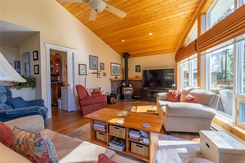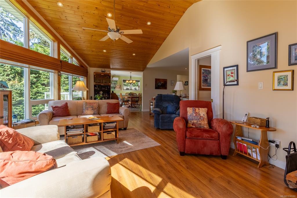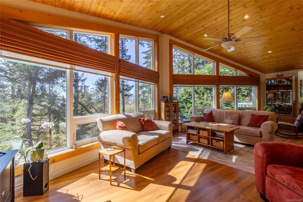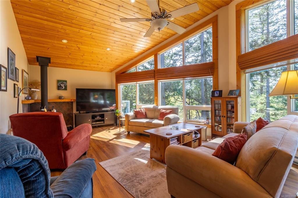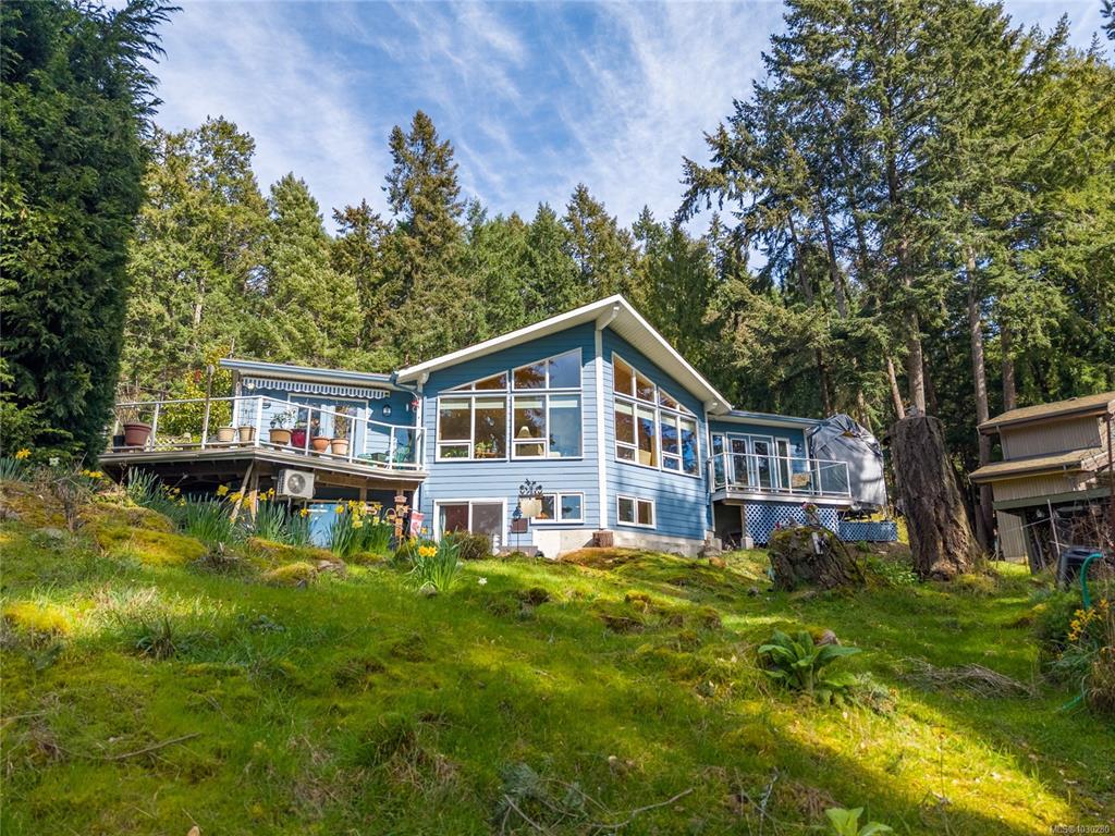 South-facing West Coast–style home on a private 0.55-acre lot, a short walk from Thieves Bay Marina and Park. Built in 2004, this custom Viceroy kit home offers quality construction, vaulted wood ceilings, large windows, and a durable 40-year fiberglass shingle roof. The main level provides three bedrooms including a primary bedroom with ensuite and private balcony. Abundant natural light fills the interior, with small ocean glimpses from several rooms. A daylight basement with exterior access includes a large family room and additional unfinished space suitable for future development, workshop, studio, or suite. The owners have continuously updated the home over the years with exterior painting, appliances, flooring & countertops and a new heatpump last year. Serviced by Magic Lake water system and on septic. Quiet setting close to moorage, parks, trails, whale watching, and local recreational amenities. Current bylaws permit an accessory building. Information package available.