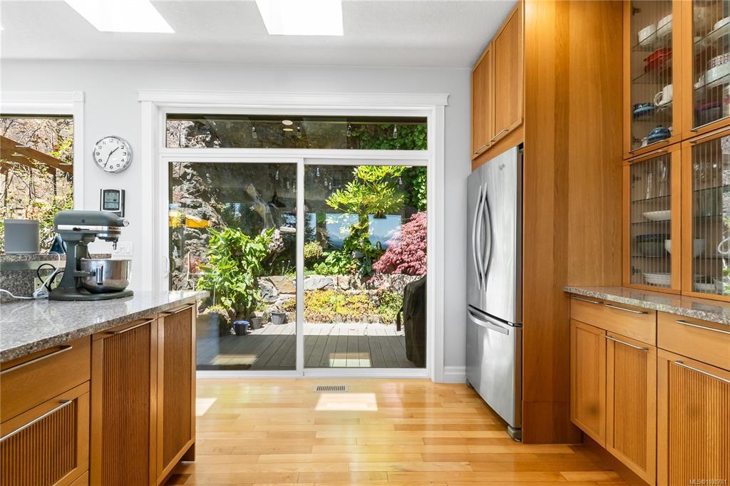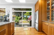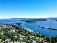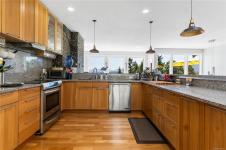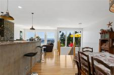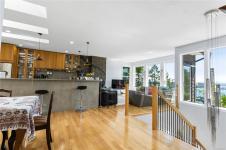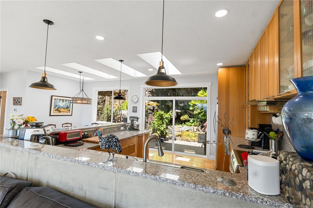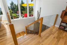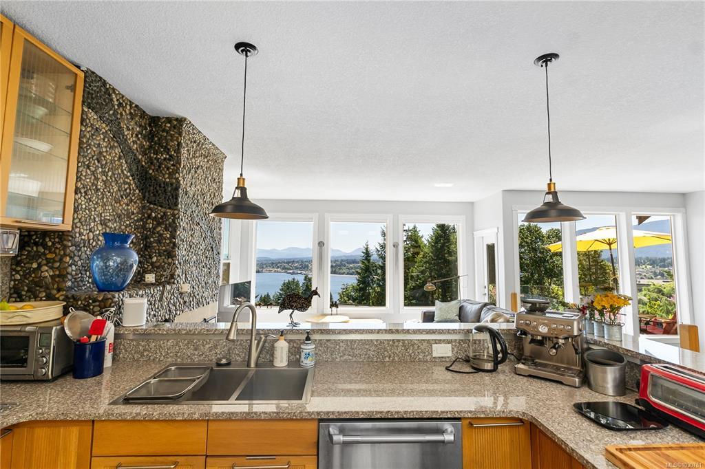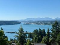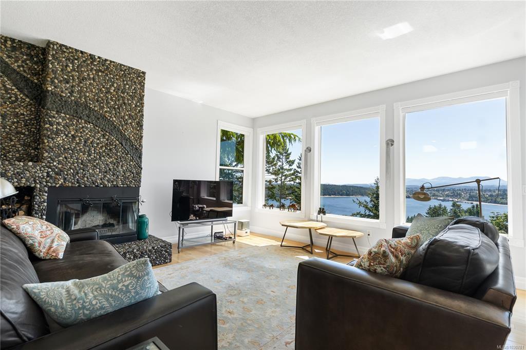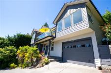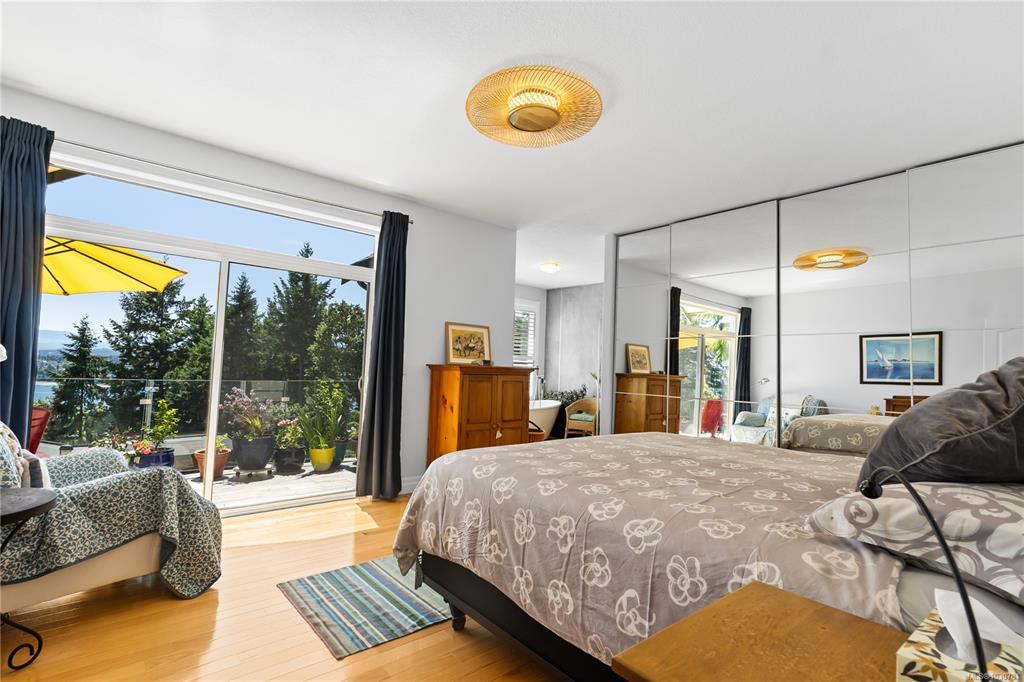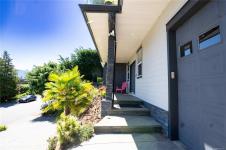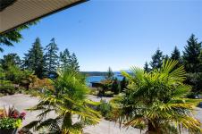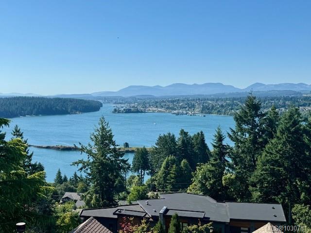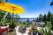 STUNNING OCEAN & MOUNTAIN VIEWS! This immaculate executive residence overlooks Departure Bay & features panoramic vistas and natural light. The gourmet kitchen offers oak cabinetry, granite counters, and a functional layout, while the elegant dining room with skylights opens to a rear patio. A cozy wood-burning fireplace and access to a south-facing deck highlight the living room. The spacious primary suite has a luxurious 5-pce ensuite & generous wardrobe. A 2nd bedroom with private patio and modern main bath complete the main floor. Downstairs features a vaulted entry, den, laundry room, and a beautifully appointed IN-LAW or GUEST SUITE with ensuite, kitchenette, and sitting area. With 2,300 sqft of finished space, composite decking, hardwood floors, and mature landscaping, this home is a rare find. The upper garden with fruit trees, gardens, and a spectacular view towards Vancouver includes a deck which is accessed by spiral staircase. Measurements approx.